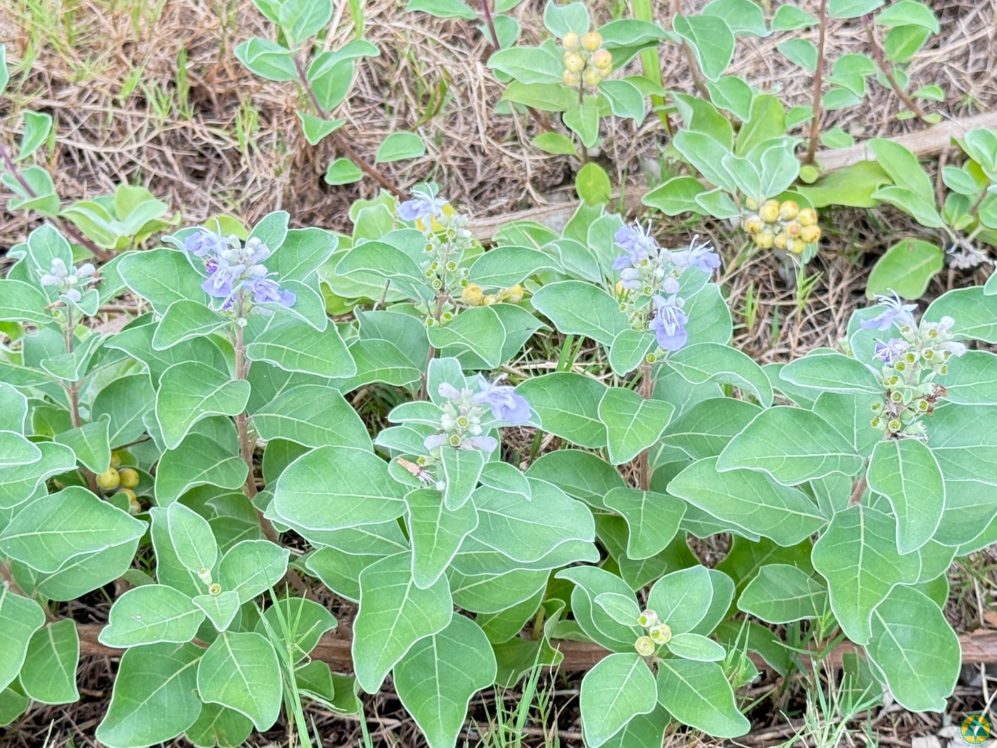 蔓荊屬於半落葉型 #蔓性灌木,既可以像灌木一樣抬頭挺胸,也能像藤蔓般的匍匐生長。它全株覆蓋著白色細毛,帶著淡淡的清香,葉子呈單葉對生,多為倒卵形或寬卵形,顯得既簡單又美觀,當它開出淡紫色的小花時,更是增添了一抹柔和的色彩。看起來柔弱的蔓荊,卻有著強悍的生理調控機制。它的耐受力,無論是遭遇 #鹽霧、高溫,還是 #乾旱,它都能堅強地活下來。每當秋冬季節的強風落山風來襲,它也會像其他植物一樣選擇落葉,度過乾旱和風沙的挑戰。🌬️