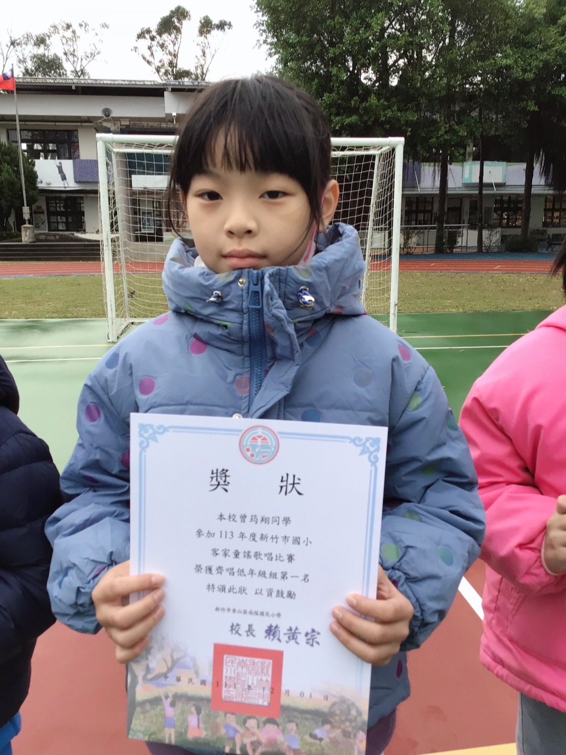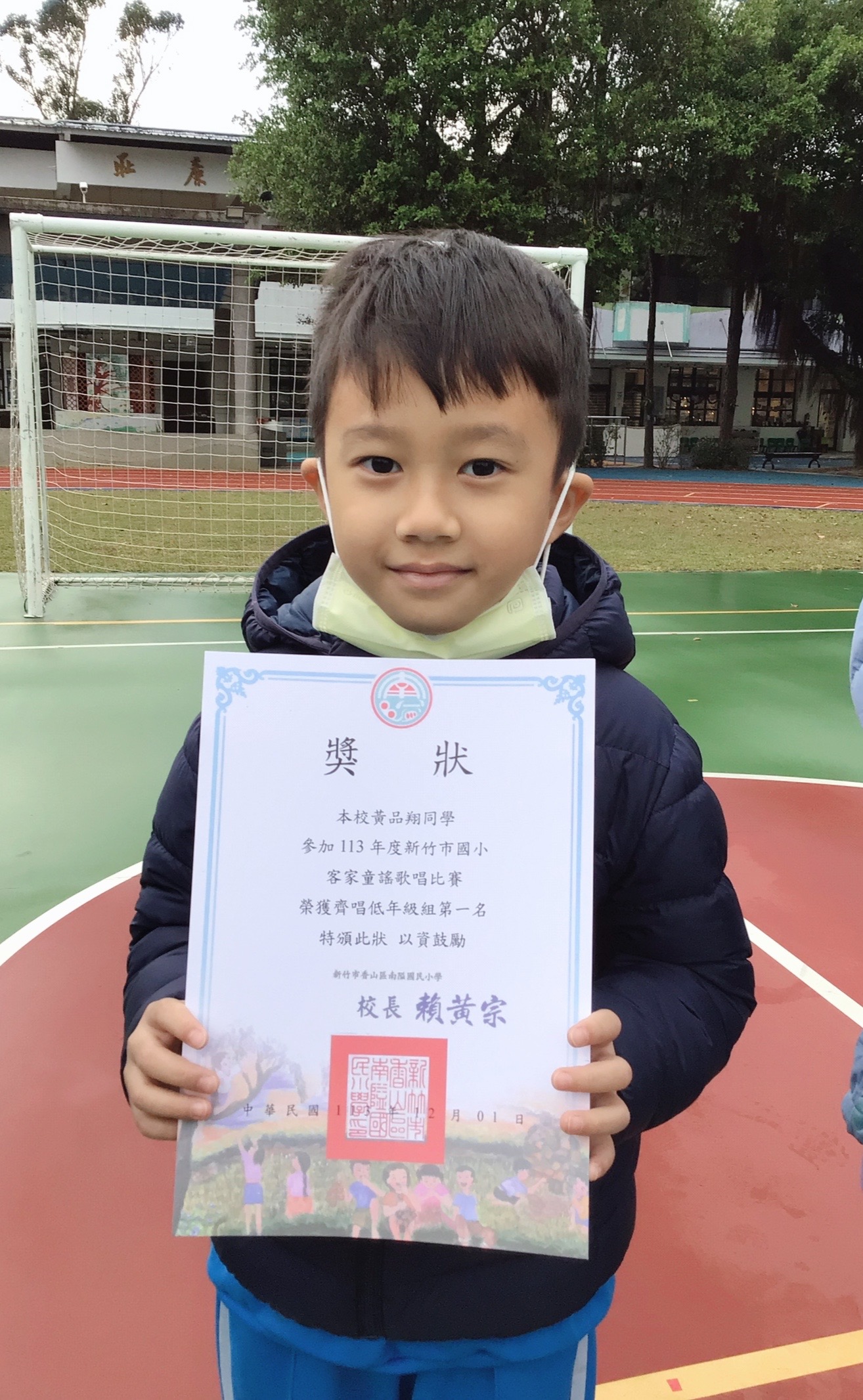 平安夜報佳音,南隘國小參加113年度客家童謠歌唱比賽,榮獲齊唱低年級組第一名。今日在全校師生的升旗典禮舉行頒獎,分享喜悅。恭喜恭喜以下同學:羅苡芯、白坤翰、古喬媗、黃品翔、曾筠翔、姚禹希