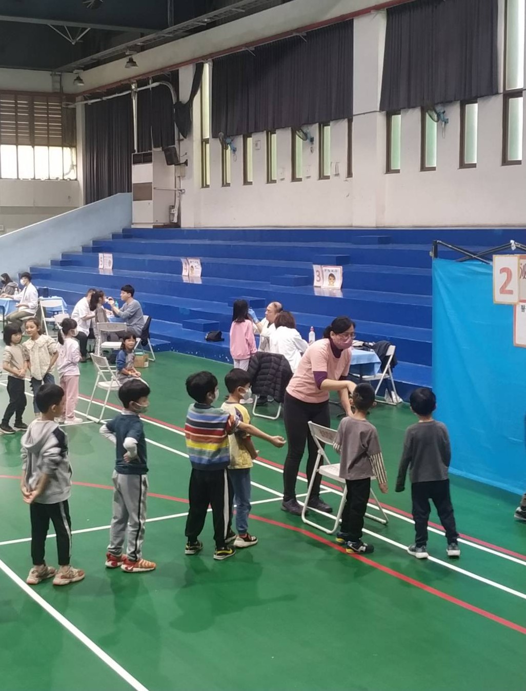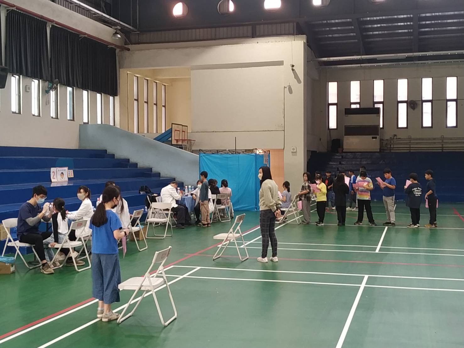 從各項通知單、同意書分發、收回、統計,到前幾天的檢體的收集到健檢當日紀錄表的分發、整理,甚至隊伍的行進、引導……都是健康中心及學務處事前的規劃跟場地布置,校方與醫護團隊通力合作,確保每位學生都能順利完成檢查。