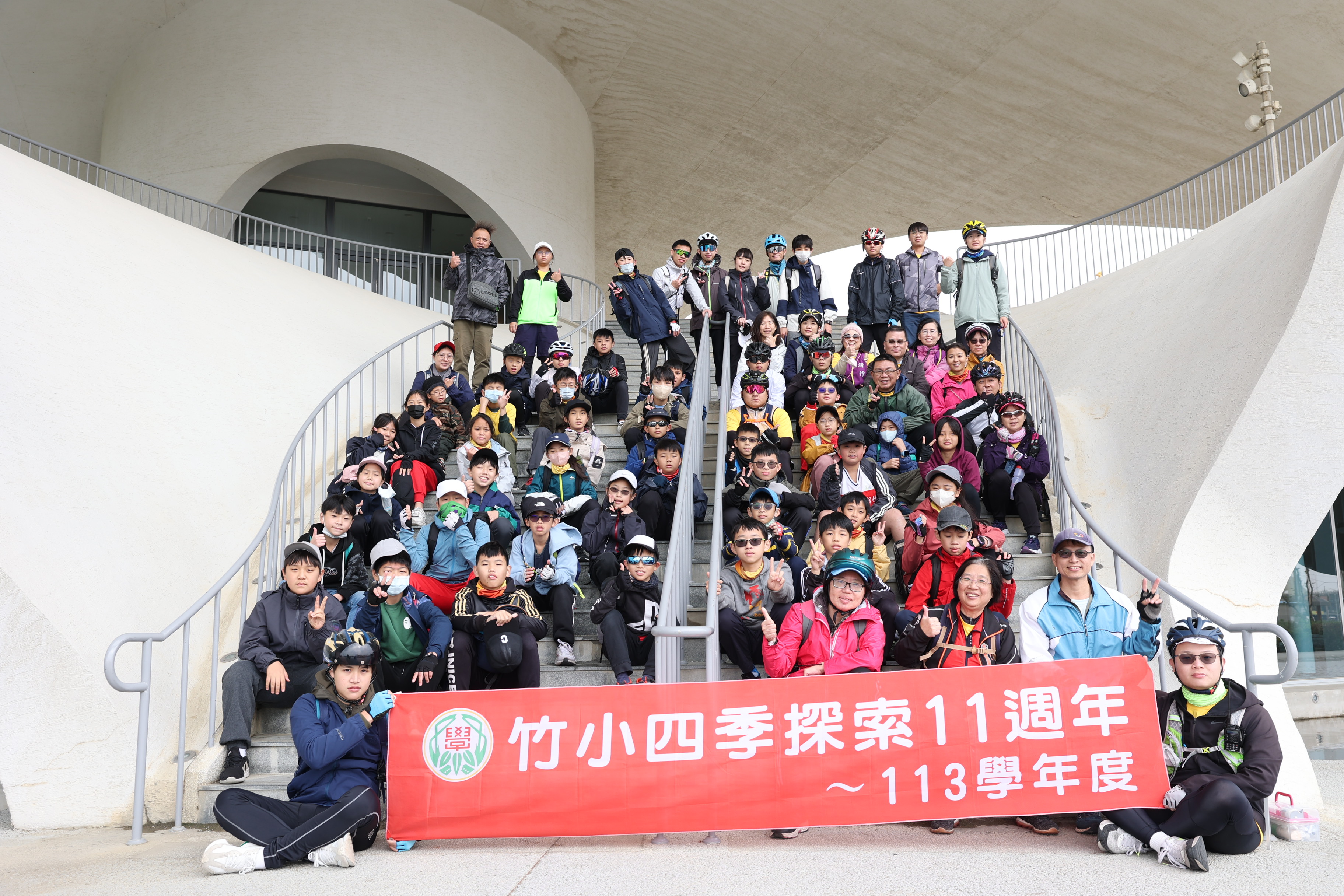 大約11點多就抵達永安漁港的海螺館,在那邊簡單用過午飯後,每年都要在階梯處拍一張大團照,今年的紅布條寫著竹小探索11歲了。
