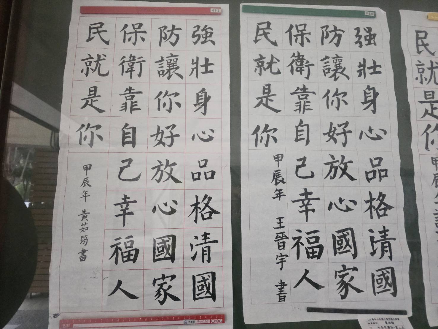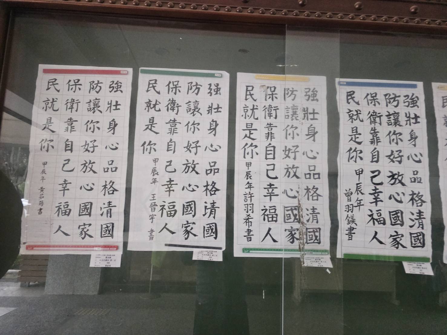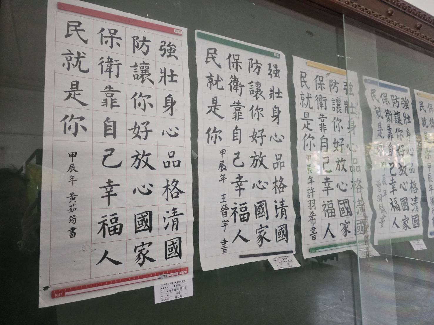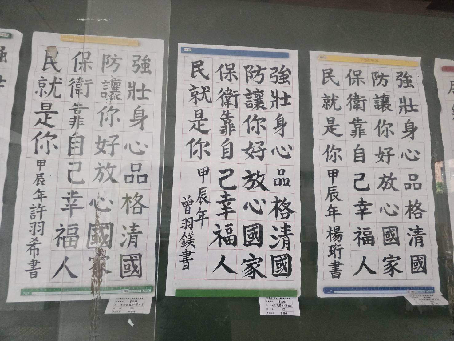 「全民國防教育,人人都有責任」,為了讓學生能有全民國防的概念,因此在今年暑假前將全民國防書法指定為五升六年級必要的作業項目,開學後,經過評審老師的慧眼,挑出了全六年級前六名及佳作六名的學生作品,並於本校川堂進行展示。