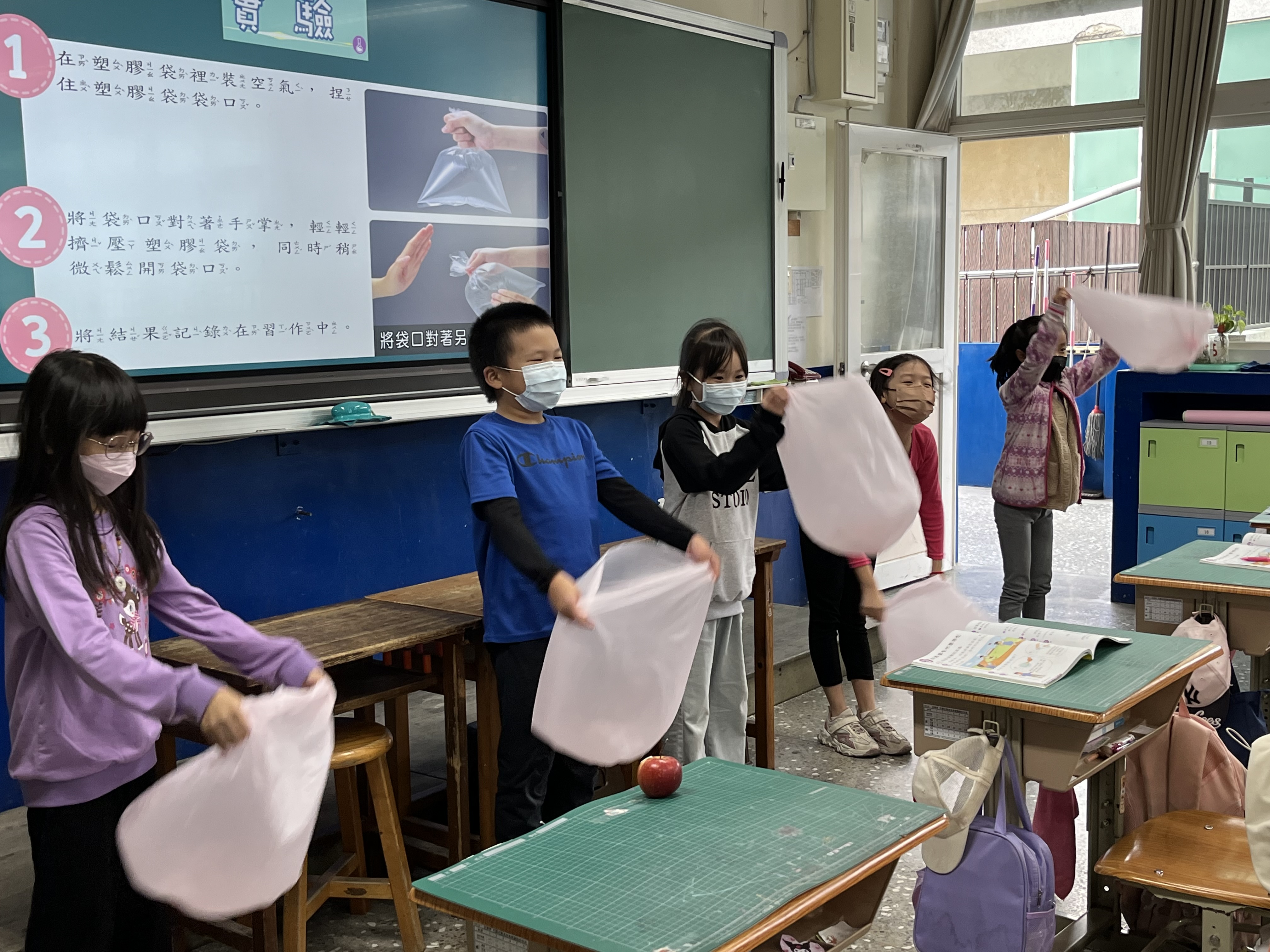 空氣雖然看不見也摸不著,在三年級的自然課中我們想要證明空氣的確存在。將空氣裝進塑膠袋中,塑膠袋會鼓鼓的,手靠近袋口,並稍微擠壓鼓鼓的袋子,手就會有涼涼的感覺,原來是空氣有流動的特性,當空氣流動就會形成風。另外,我們也將裝滿空氣的塑膠袋放入水中,輕輕擠壓,發現有許多氣泡往上冒。藉著簡單的實驗,幫助我們理解空氣的存在和流動性,非常有趣。
