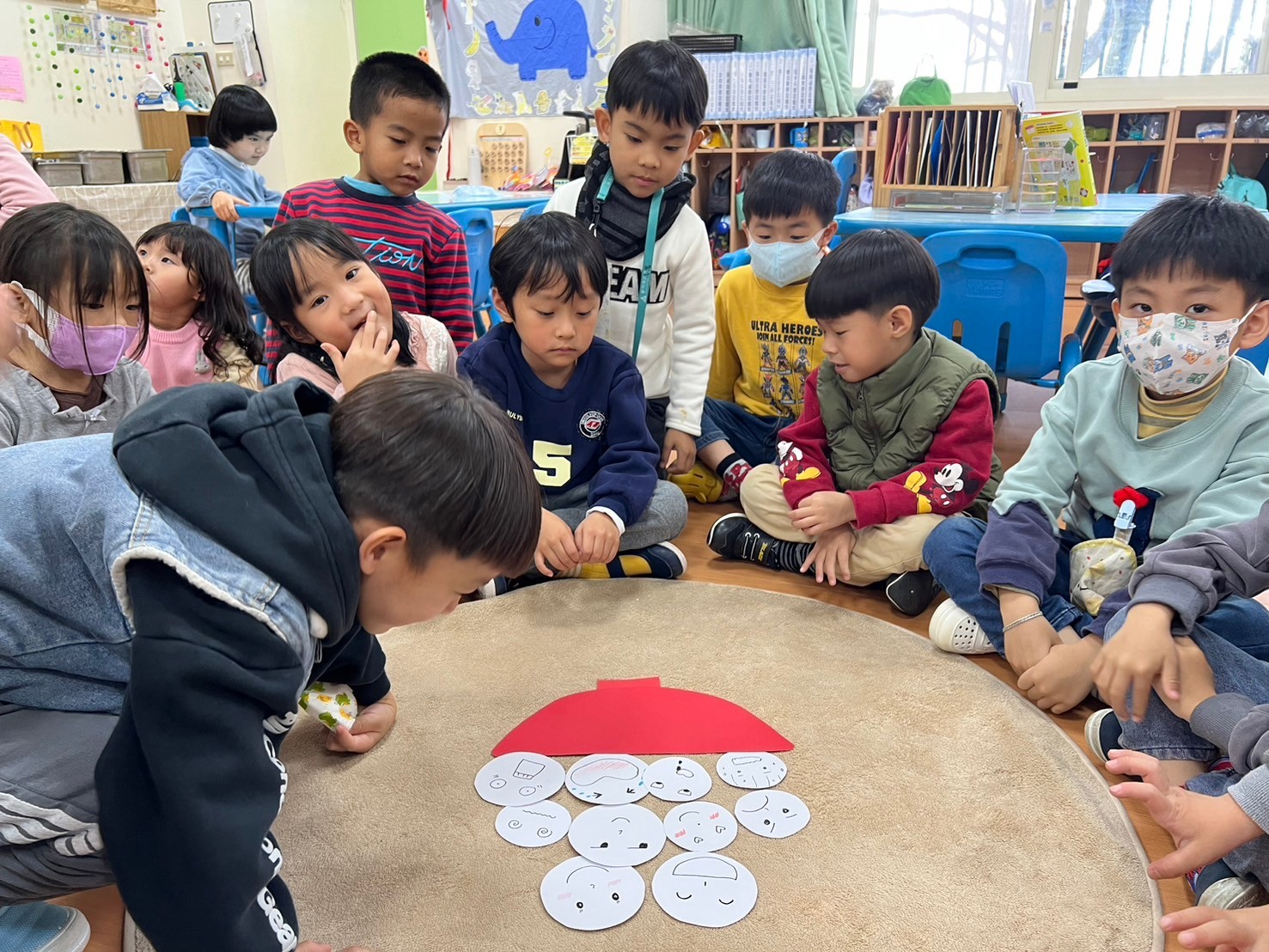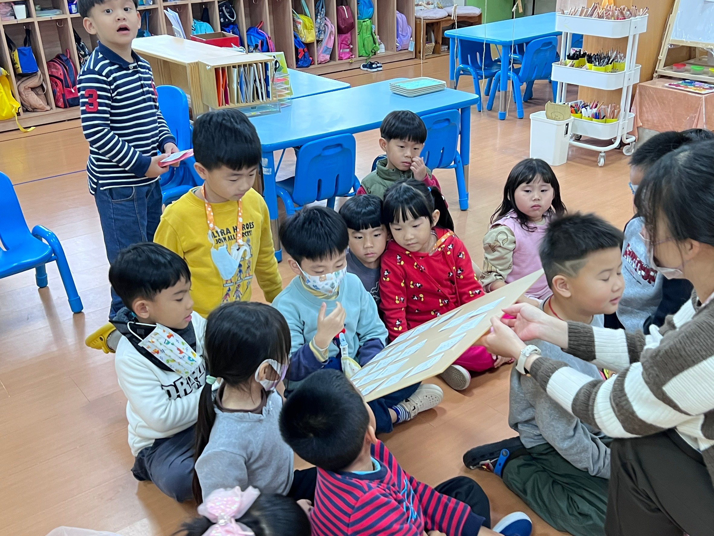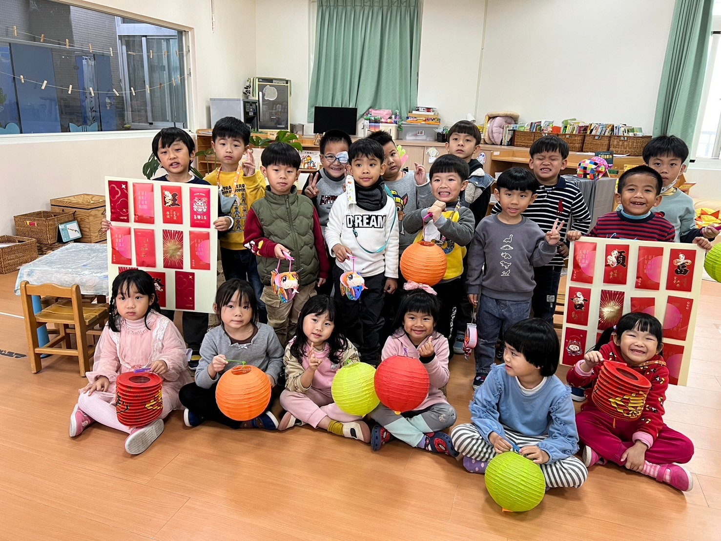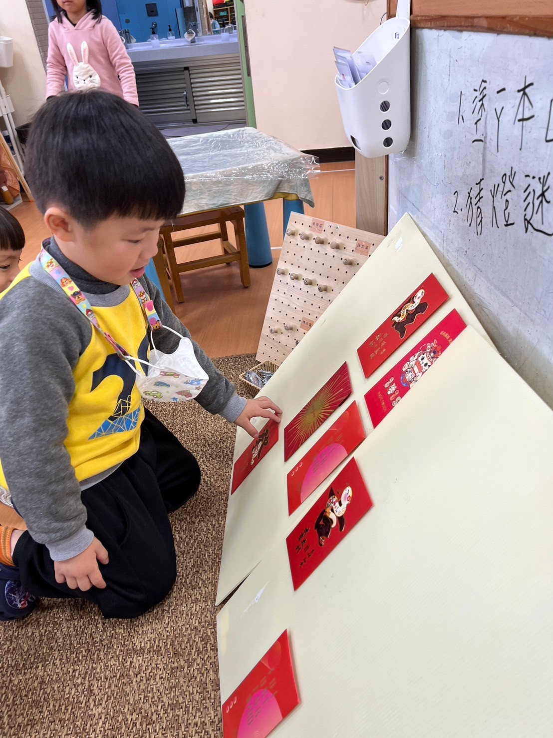 開學日,老師和孩子們介紹元宵節的習俗和故事,特別解說猜燈謎的文化意義。元宵節這一天,孩子們一早進班看到各色燈籠、燈謎看板和許多紅包禮物都非常期待。猜燈謎的過程中充滿歡笑,孩子們在搶答中動動腦,發揮創意聯想答案,答對之後還可以敲鑼鼓和抽紅包,趣味性十足。最後,用各種表情的湯圓一起進行對話和分享,在遊戲中增進節慶文化的認識以外,也表達互相祝福和關懷的心意。
