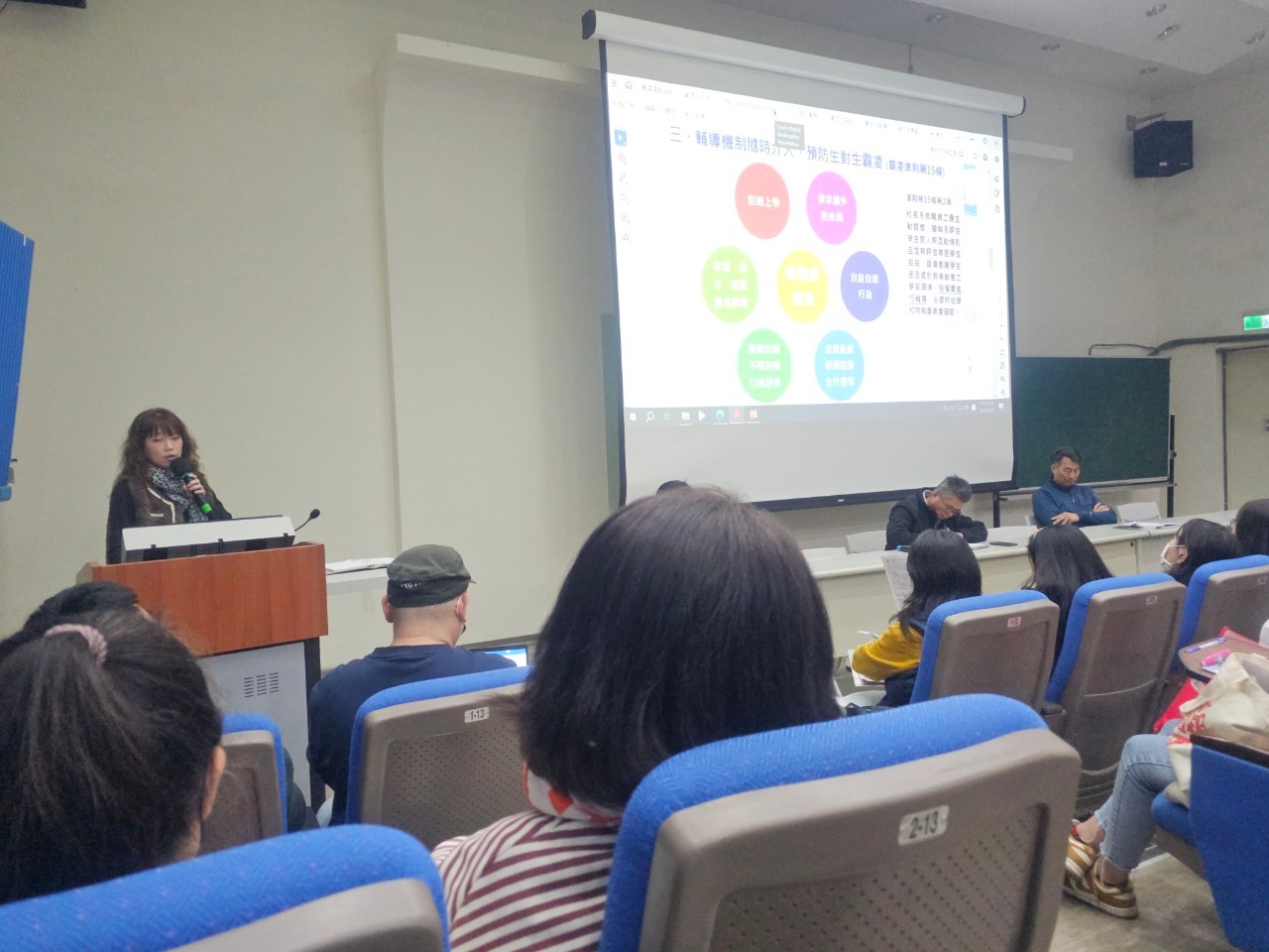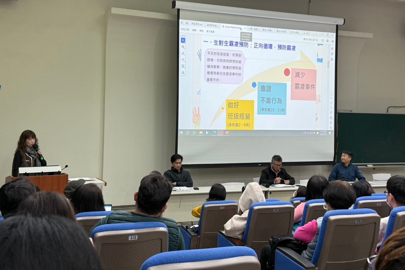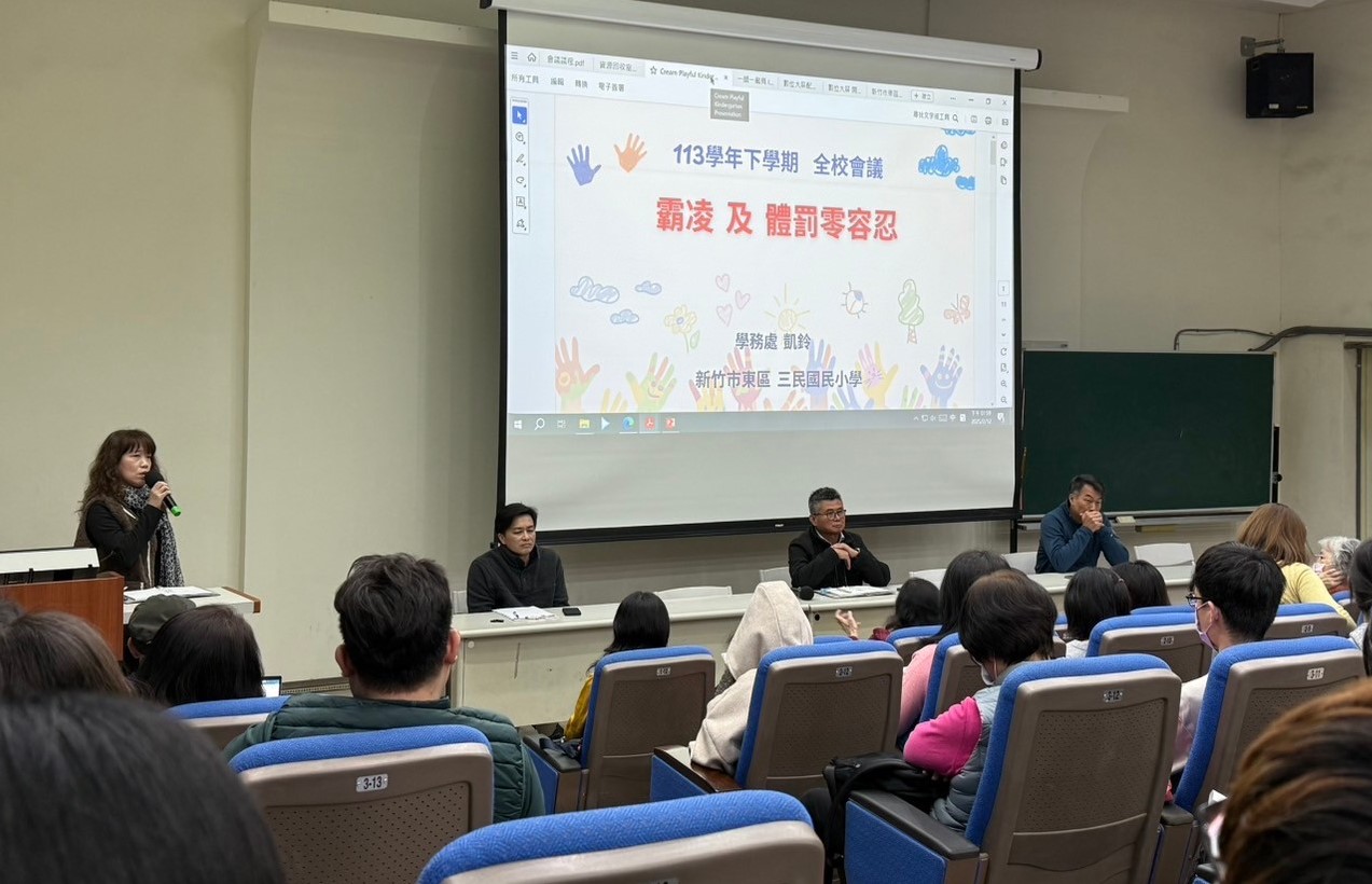 114.02.12全校教師會議中,由學務凱鈴主任向全體教師宣導「正向管教」的重要性,良好的班級經營是預防衝突的關鍵,透過建立班級規範、鼓勵同儕合作及培養同理心,能有效防治生對生霸凌,營造安心學習的環境。