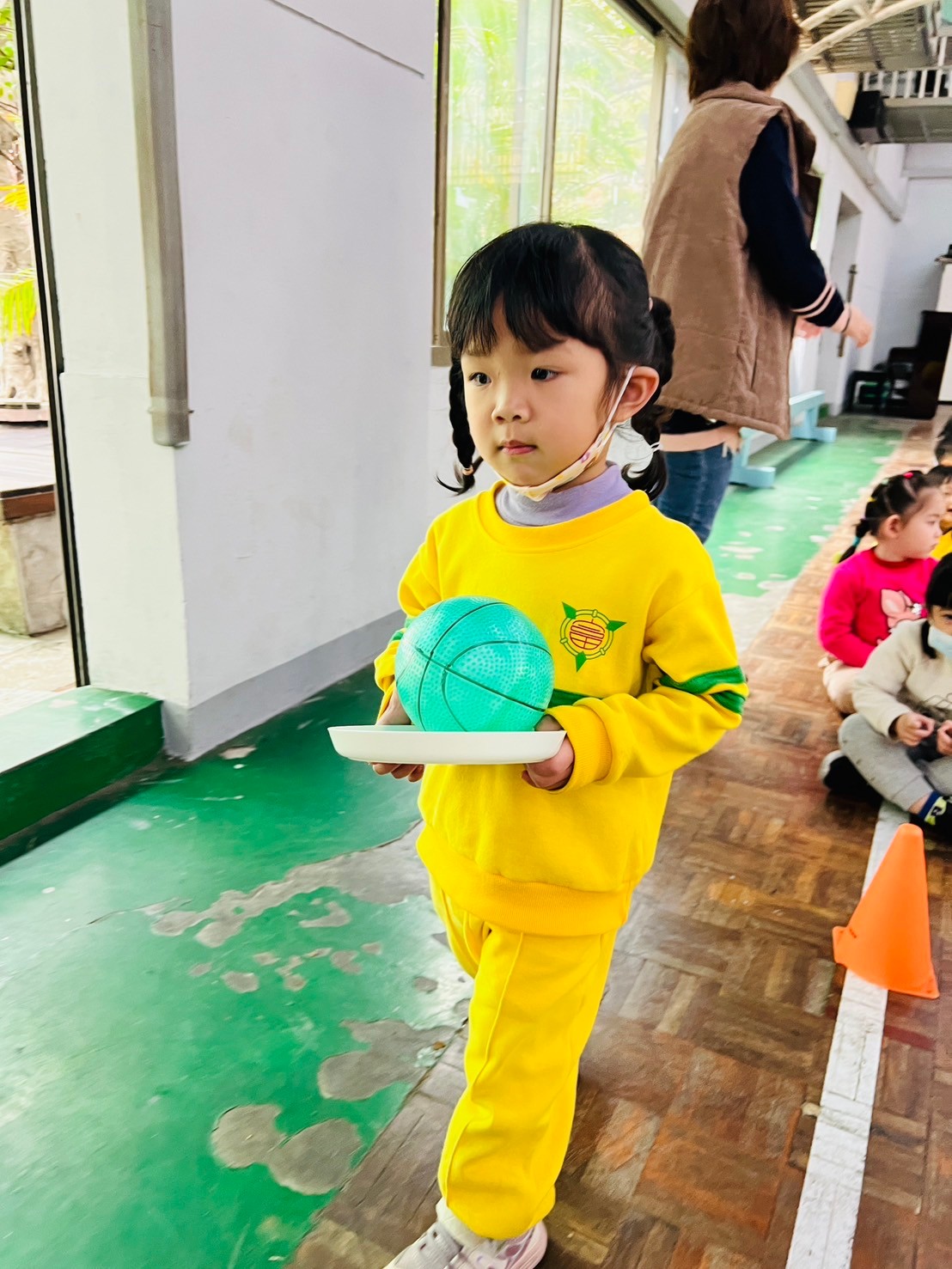 4.體能遊戲:端盤平衡(將球放置飛盤上,平衡不掉落走至對向)