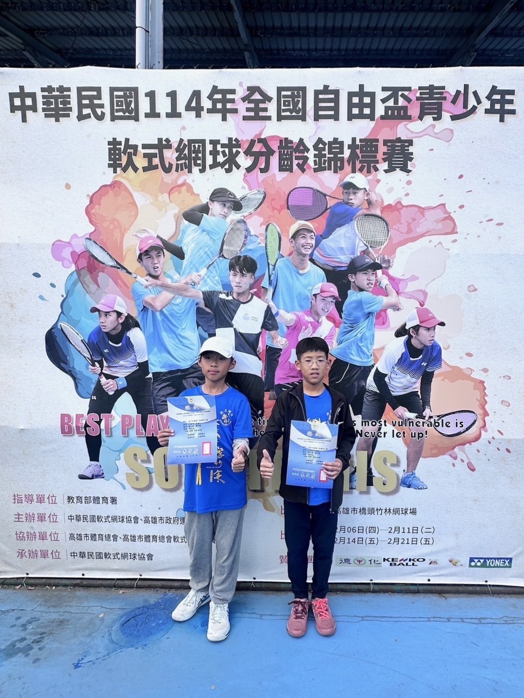 賀本校411黃苙榞 412蔡宇睿榮獲114年全國自由盃青少年軟式網球分齡錦標賽10歲男子組雙打第四名,感謝王修聰教練、陳韋華教練指導。