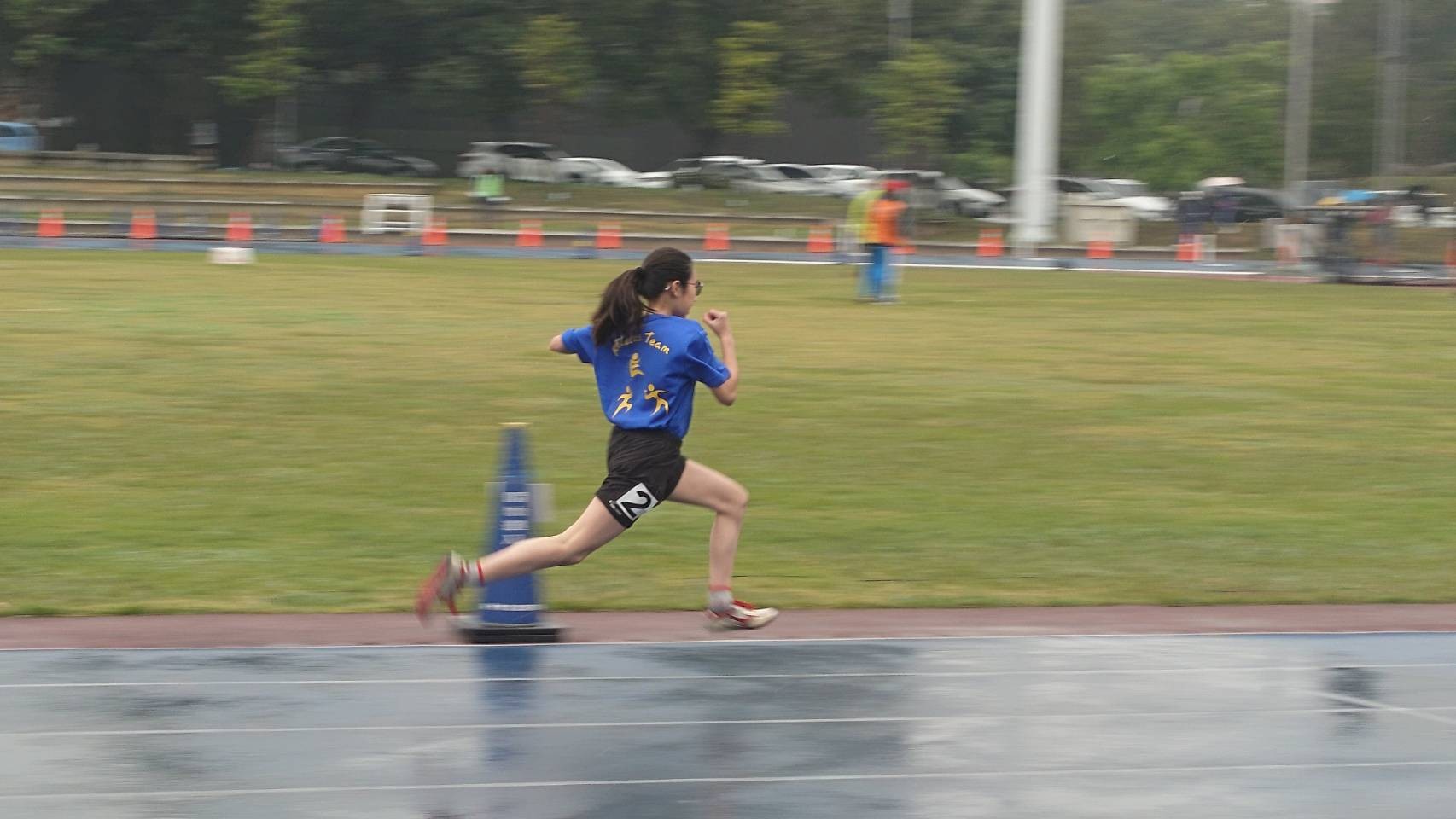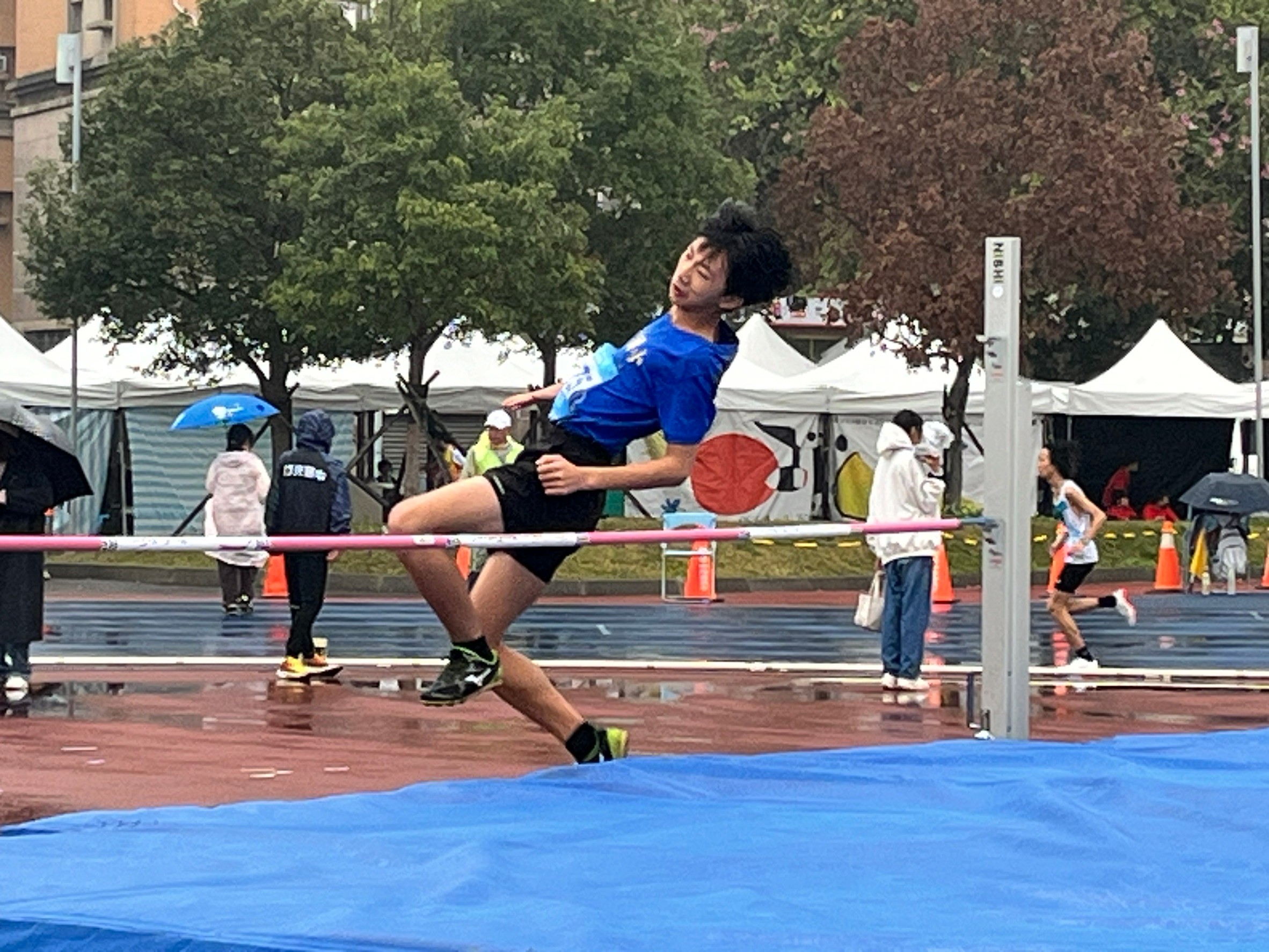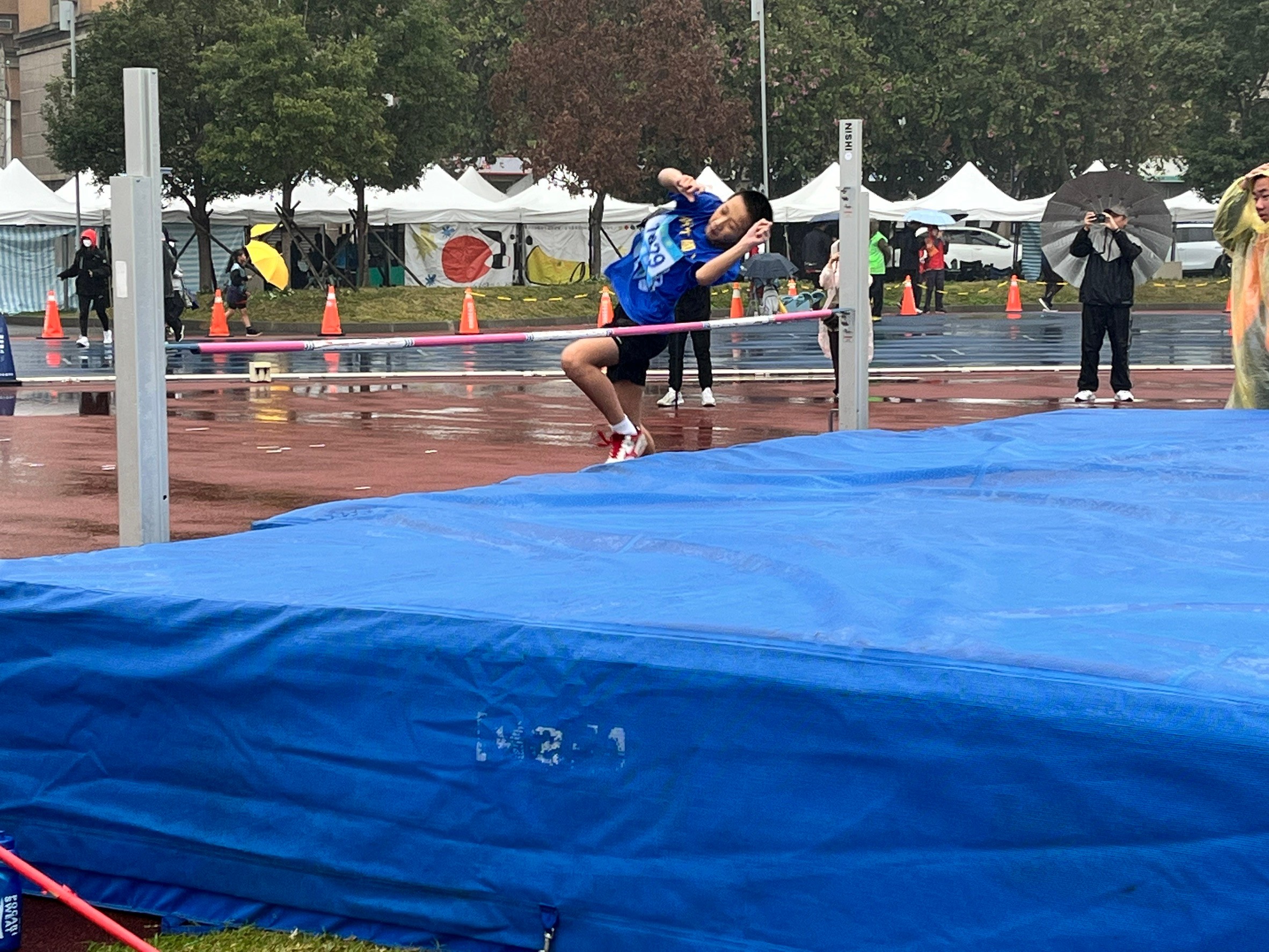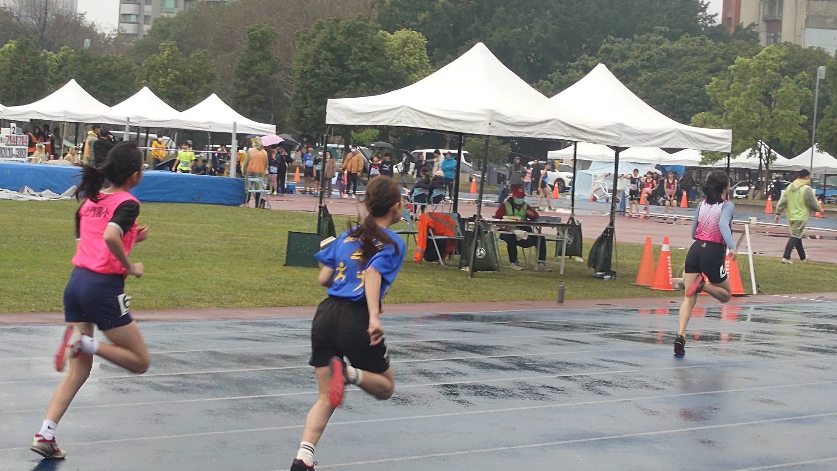 第一次參加田徑比賽是一種體驗,第一次參加田徑比賽就遇到雨天是另一種體驗。雖然平時練習,遇到下雨我們會改成室內動作練習,但比賽遇到下雨可不會改成室內比賽。雖然下著雨,幸好雨不大,新竹國小的同學仍努力奔跑、盡力跳起,為自己成績拚搏!