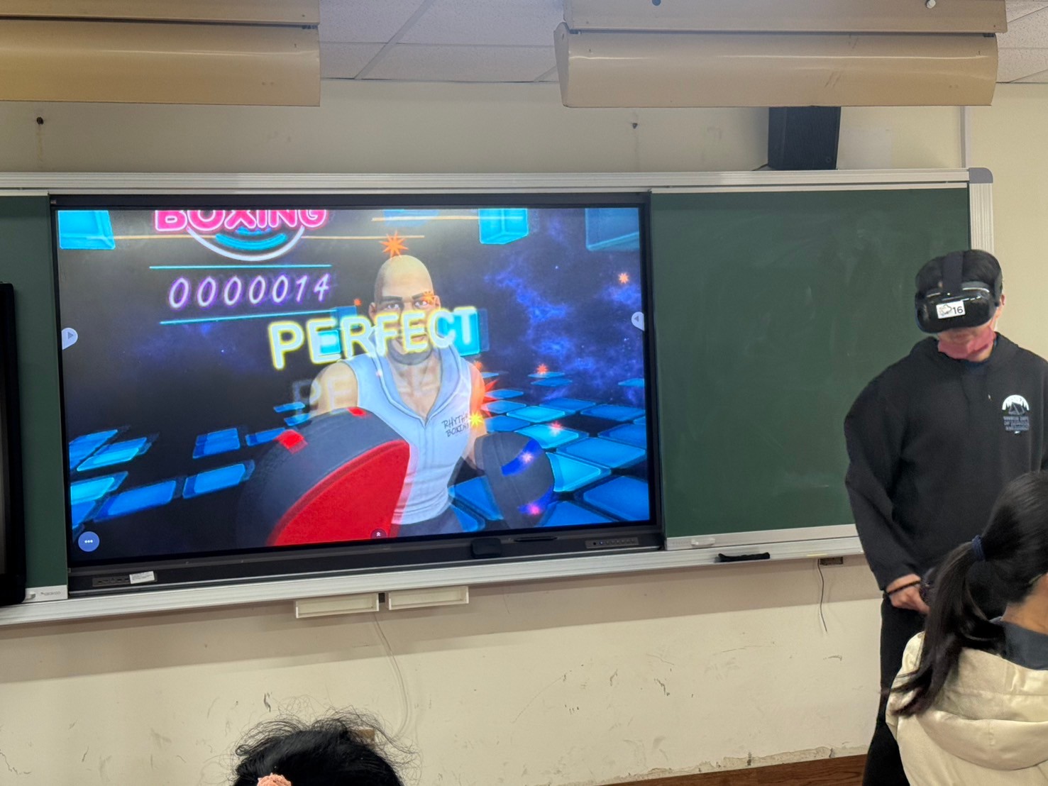 *教師們戴上VR頭盔,體驗「拳擊有氧」遊戲。