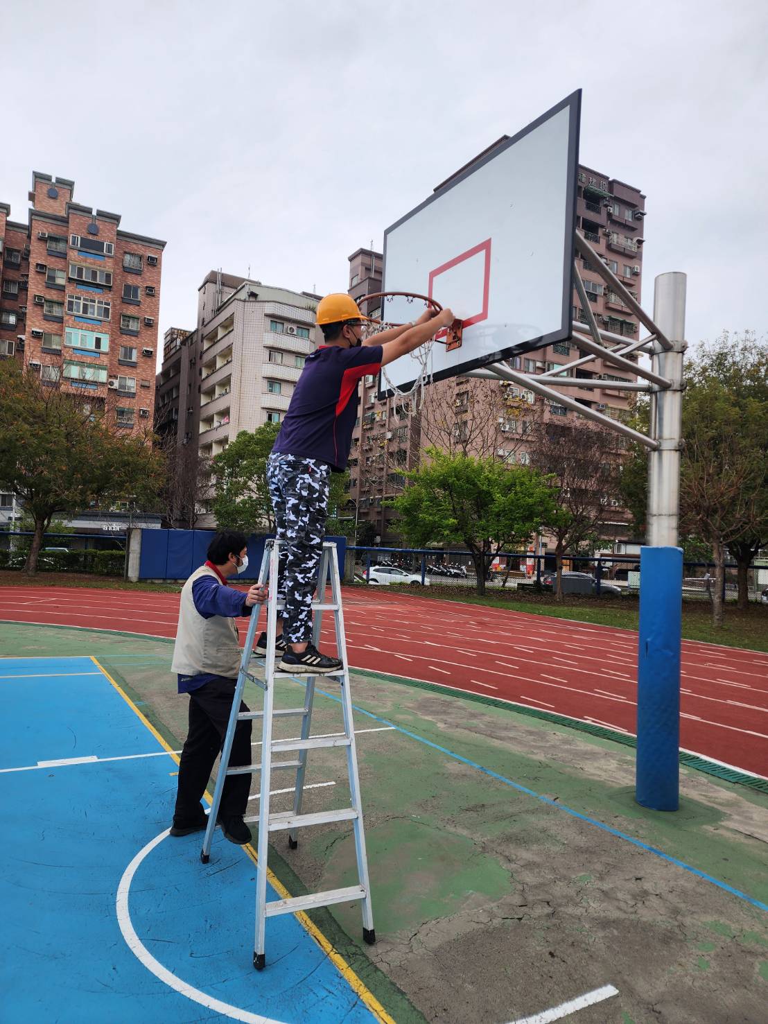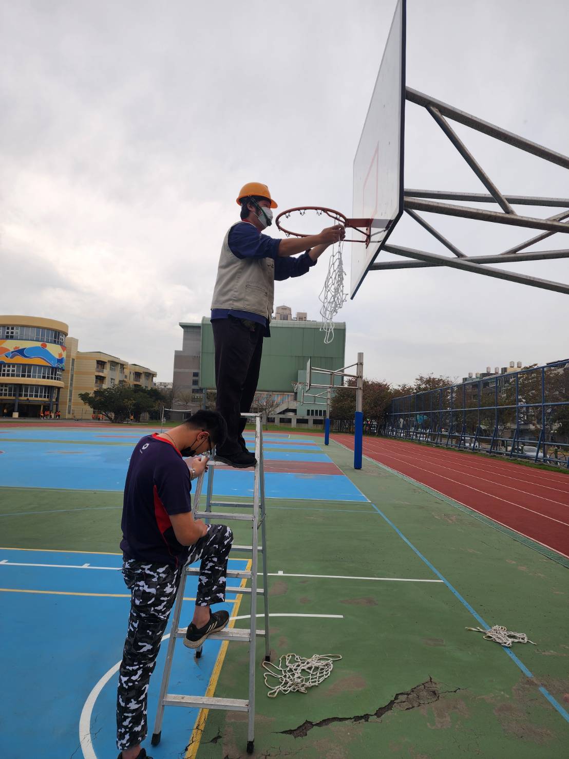 總務處人員首先將破損的籃球網拆除,隨後安裝全新的籃球網,並仔細檢查籃球網的牢固程度,確保其能夠承受學生運動時的衝擊。在更換籃球網的同時,總務處人員也對籃球架、籃球框等設施進行了全面檢測,確保其結構穩固,無任何安全隱患。