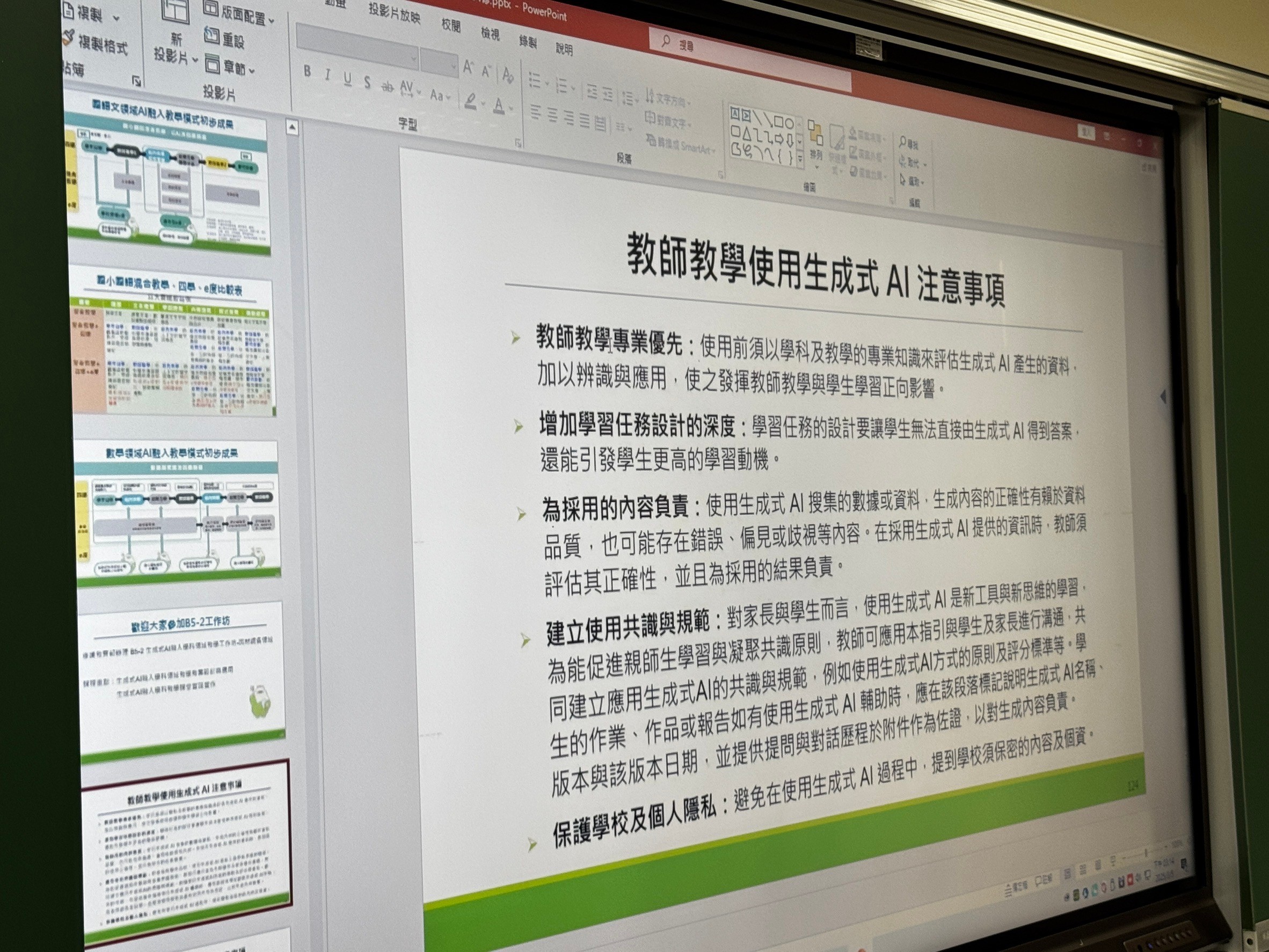 在研習過程中,教師們透過實作與討論,親自體驗AI如何優化教學流程,並交流彼此的使用經驗與想法。三個小時的研習在熱烈的互動中不知不覺結束,與會教師紛紛表示,此次研習不僅拓展了對AI的認識,也提供了具體可行的教學應用策略,對未來教學實踐有極大的助益。