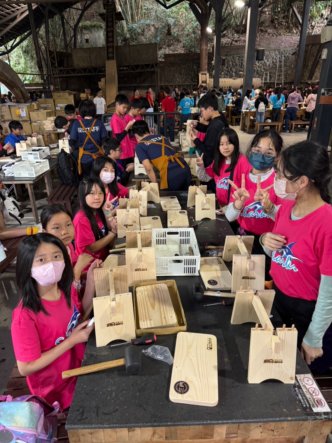 接著抵達車埕,小朋友們發揮創意,親手製作木製小椅子,體驗手工的樂趣。車站旁,他們三五成群地拍照,定格下這趟旅程的美好瞬間,笑容與夕陽交織成溫暖的畫面。