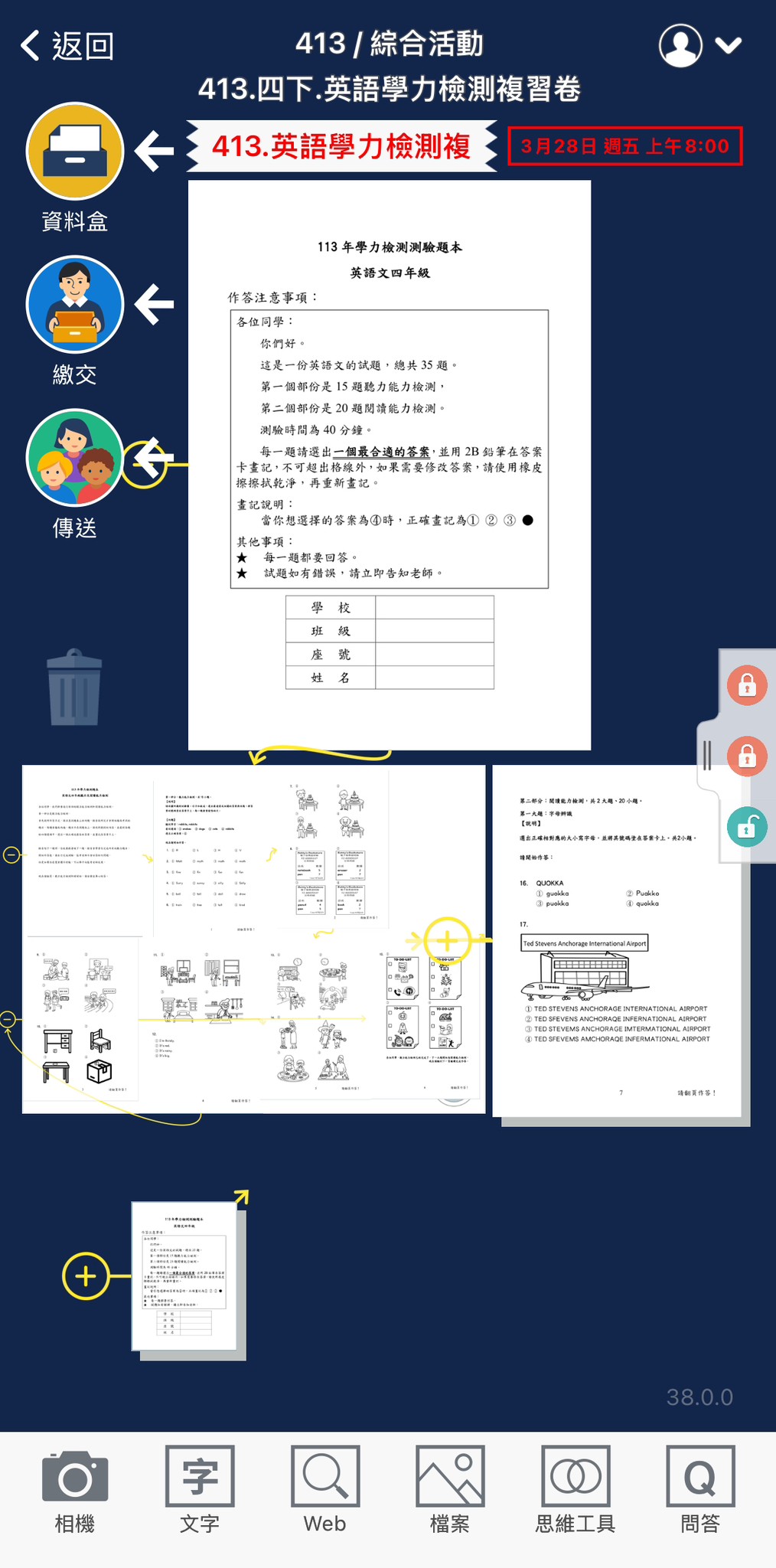 提供數位(PDF)各縣市四年級英語學力檢測聽力複習卷、音檔,學生正式練習之前先觀察、提問,接著才開始答題。核對答案,也可以讓學生處理,立即訂正,最後學生將複習卷繳交回傳到「繳交盒」給教師。