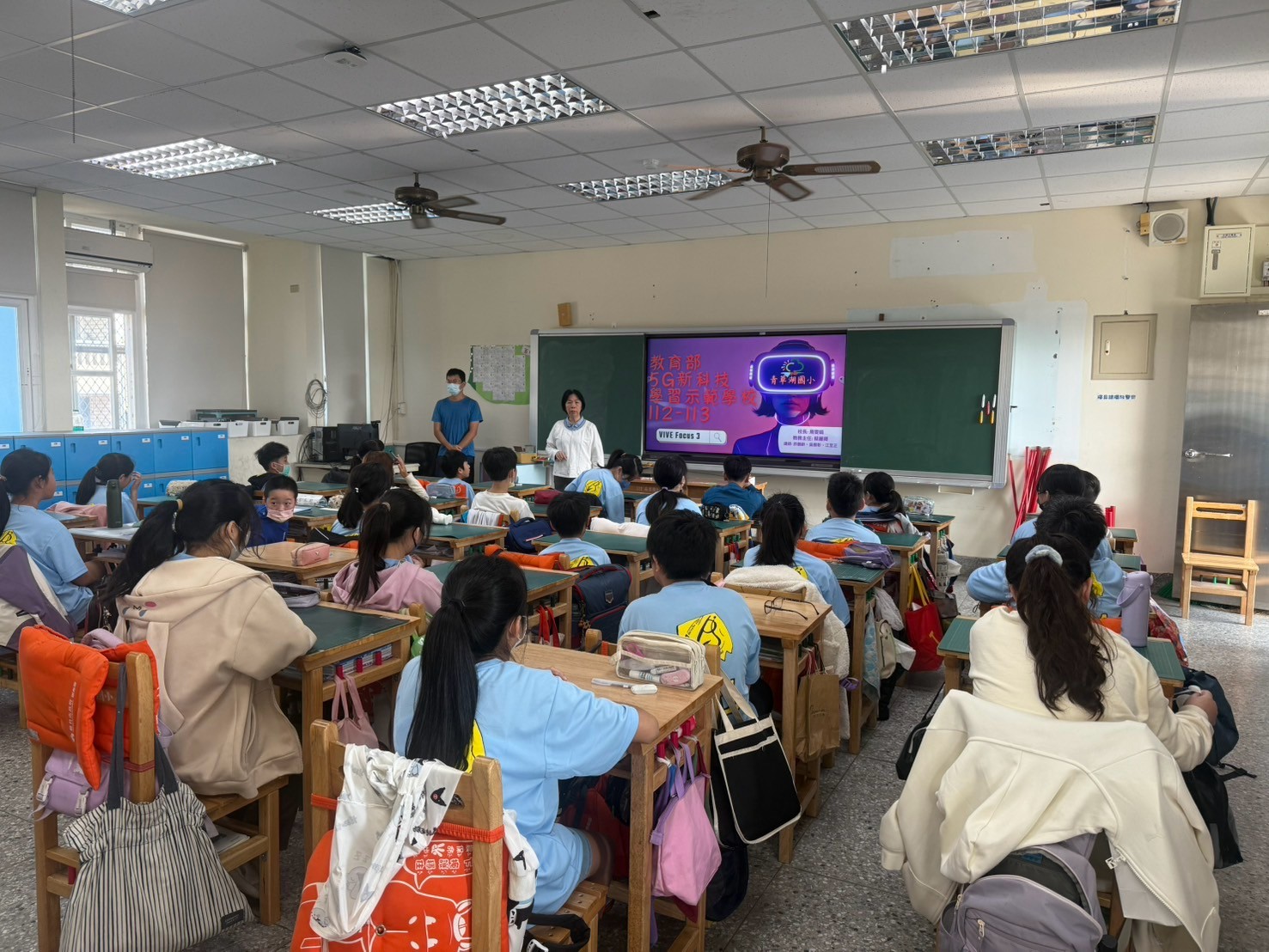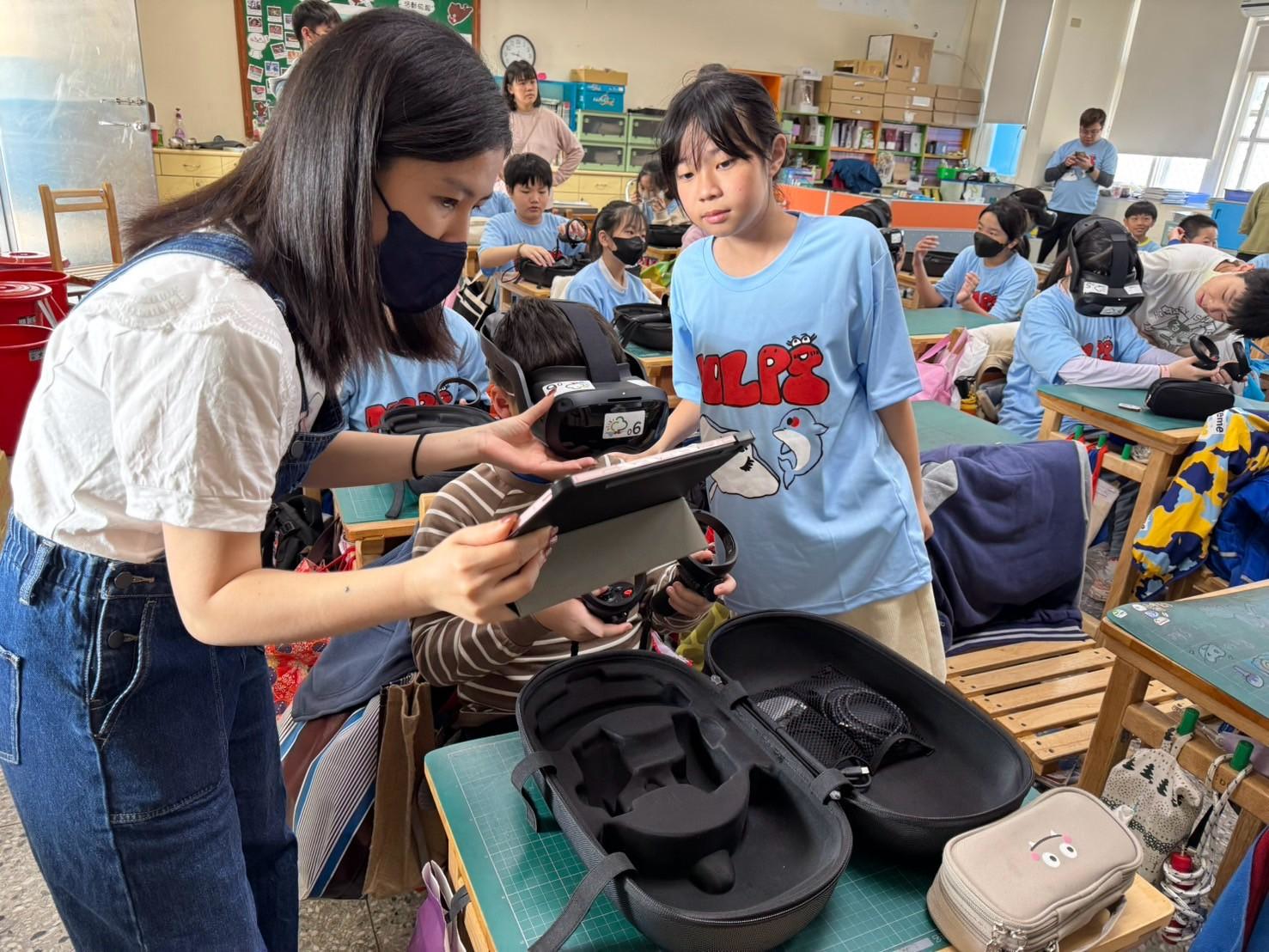 今天我們特別借用了青草湖國小的VR頭盔,三校教師們先聚在一起學習VR頭盔的操作,接著就實際進到五年甲班實施了一場VR觀星體驗課程,由江至正老師進行示範與講解,其他八位老師協同教學。透過VR設備,讓學生們彷彿置身於滿天星斗的夜空,不僅能近距離觀察星座、行星與銀河系,還能體驗不同時間與地點的星空變化。