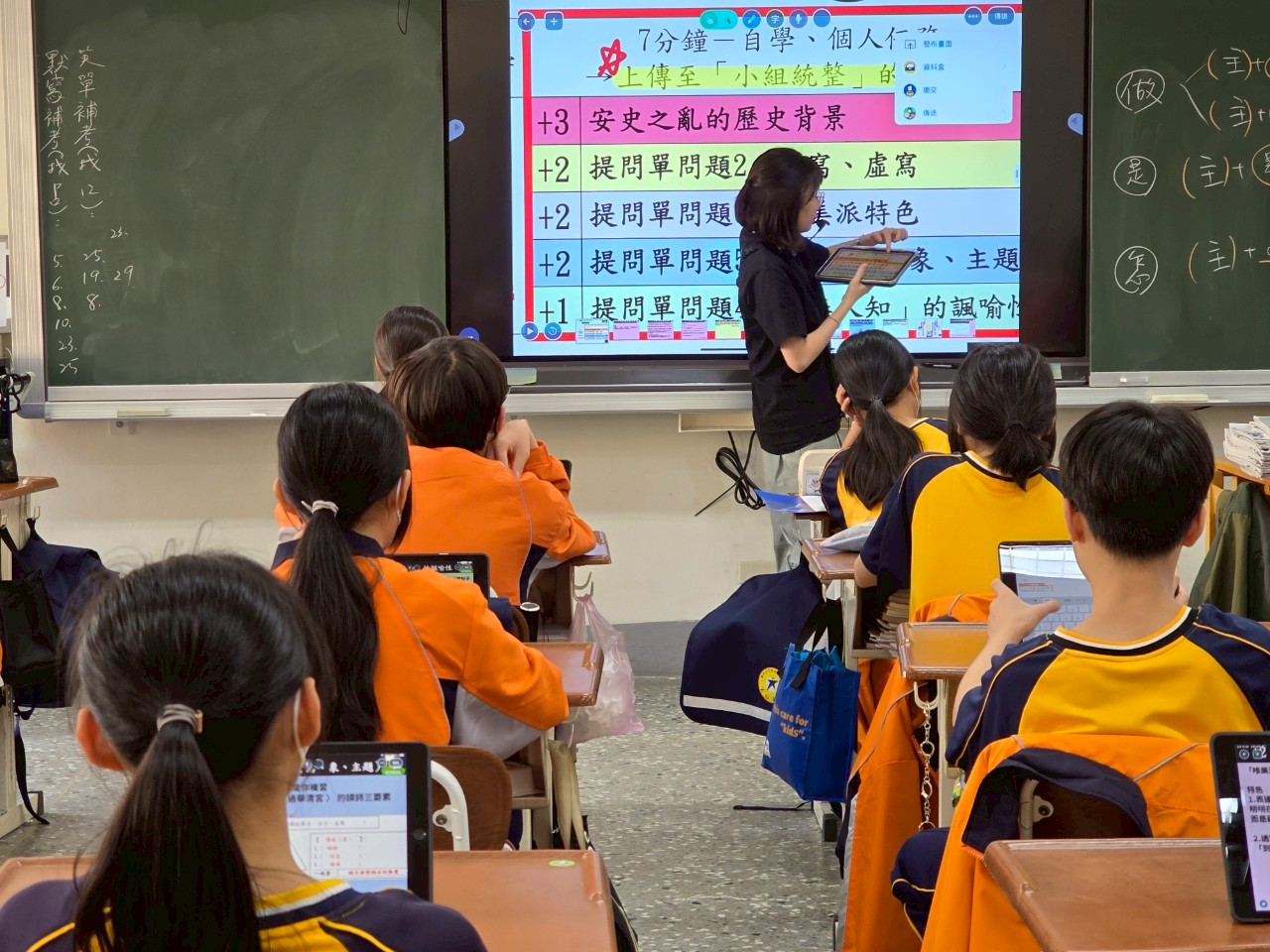 陳怡舟老師運用LoiloNote School平台與因材網e度小幫手(AI輔助工具),設計了一堂充滿互動性的課程。課堂採用差異化教學策略,以不同顏色任務卡分組,讓學生根據能力水平進行探究學習。從基礎的詩詞理解到高階的文學分析,各組學生都能找到適合自己的學習挑戰。