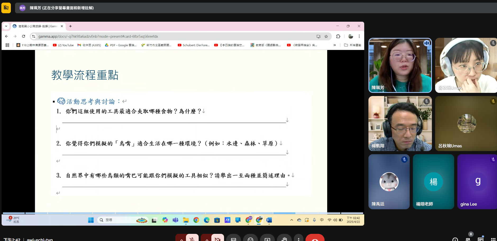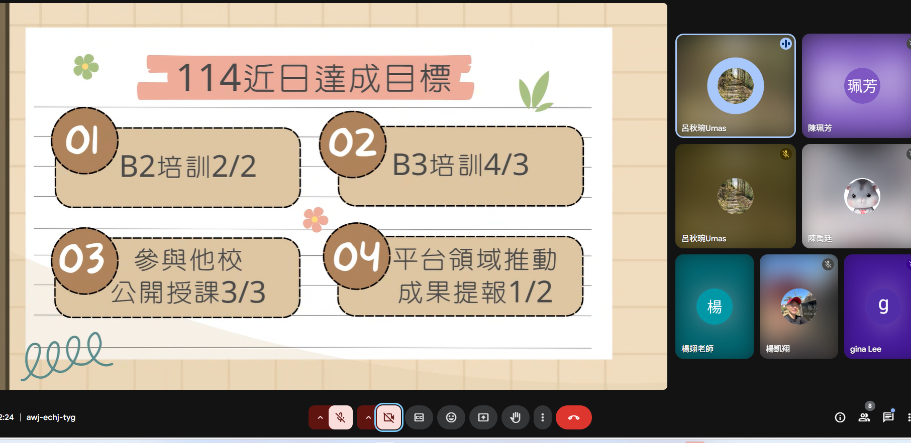 昨日本校教師群與台北教育大學楊凱翔教授一起共備5G公開授課入校線上輔導會議,會議由秋琬主任主持,先說明本校木校數位學習推動情形,接著由珮芳老師說明下週公開授課的流程並結合數位教學工具與情境式學習,楊教授對於老師的教案給予許多寶貴的意見和肯定老師在課程設計的用心,教師們透過視訊交流彼此的看法與建議,讓專業對話在數位時代中仍然能緊密進行,而且效率更高、觸及更廣。