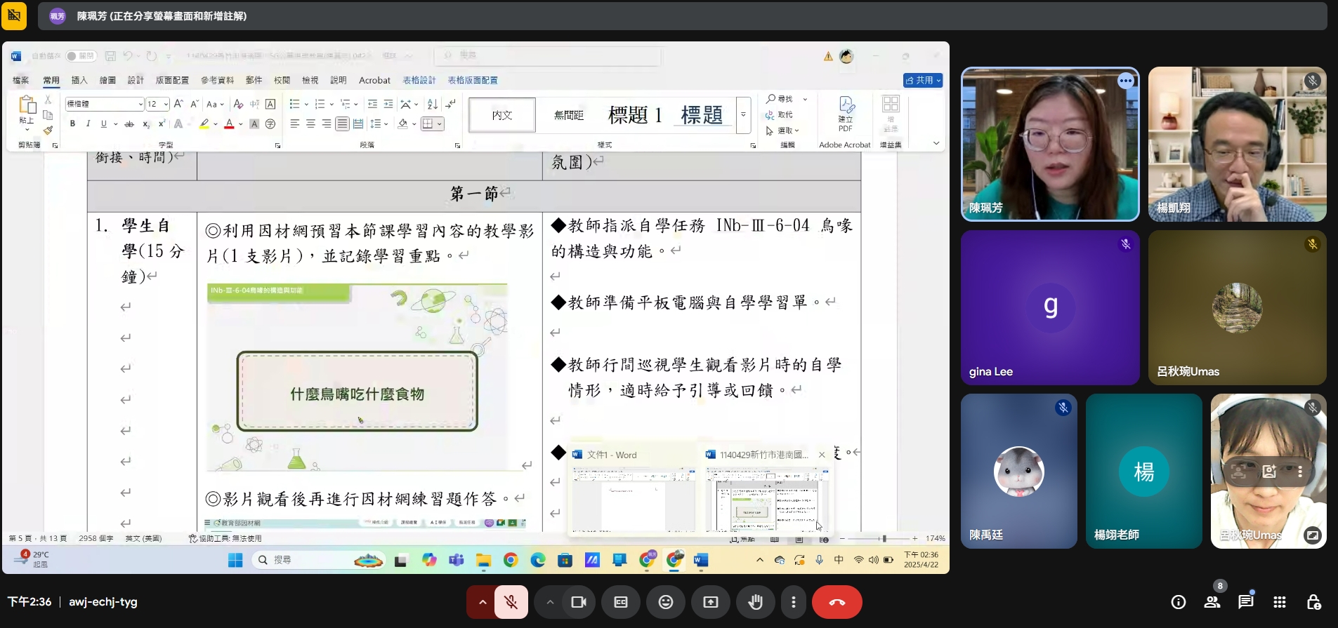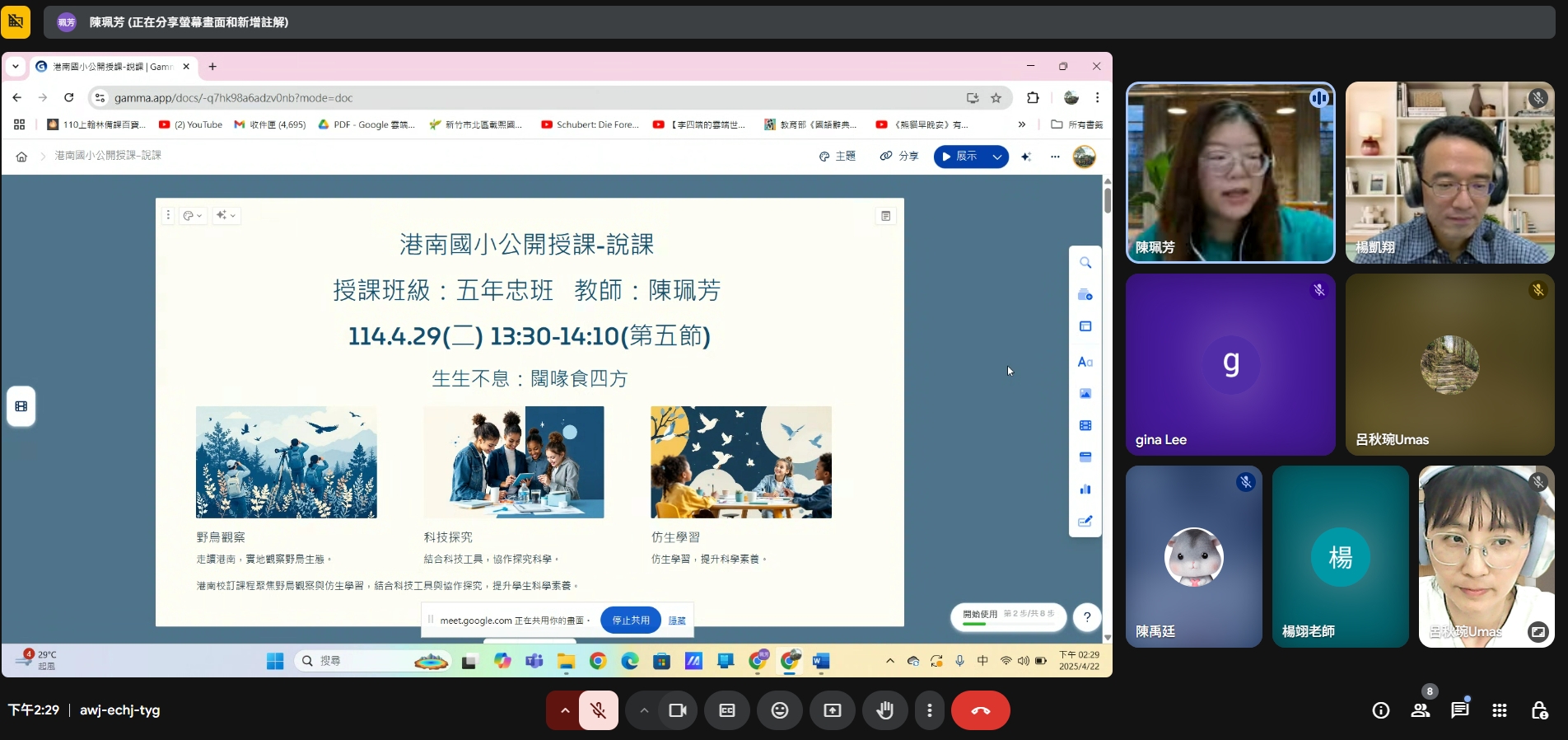 114年4月22日,港南國小辦理入校輔導,針對珮芳老師的校訂課程教案、公開授課設計及數位學習應用進行深入討論,並由楊凱翔教授親自指導與回饋。