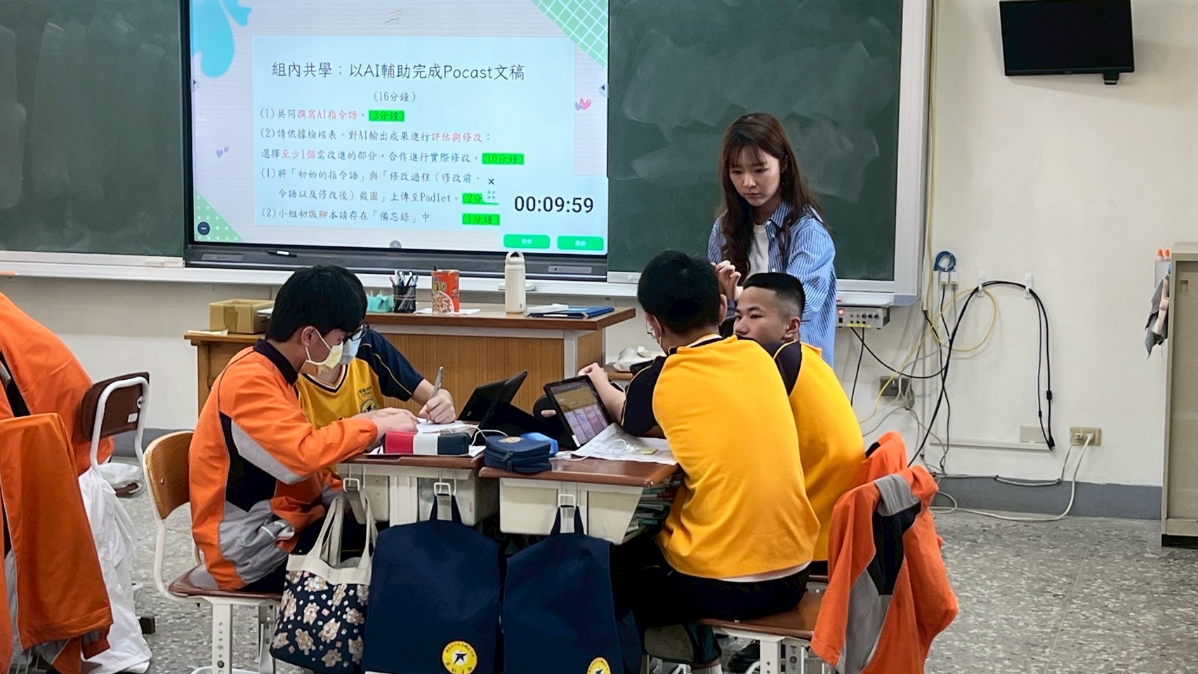 教師接著示範AI指令語撰寫方法,詳細說明原文內容、角色設定與目標聽眾等要素,並提供對話自然度與架構完整度的檢核標準。學習過程採分階段設計:小組共同撰寫AI指令語、操作ChatGPT生成並修改腳本、進行跨組互評與回饋,教師總結時強調人類創意與判斷力的不可替代性。