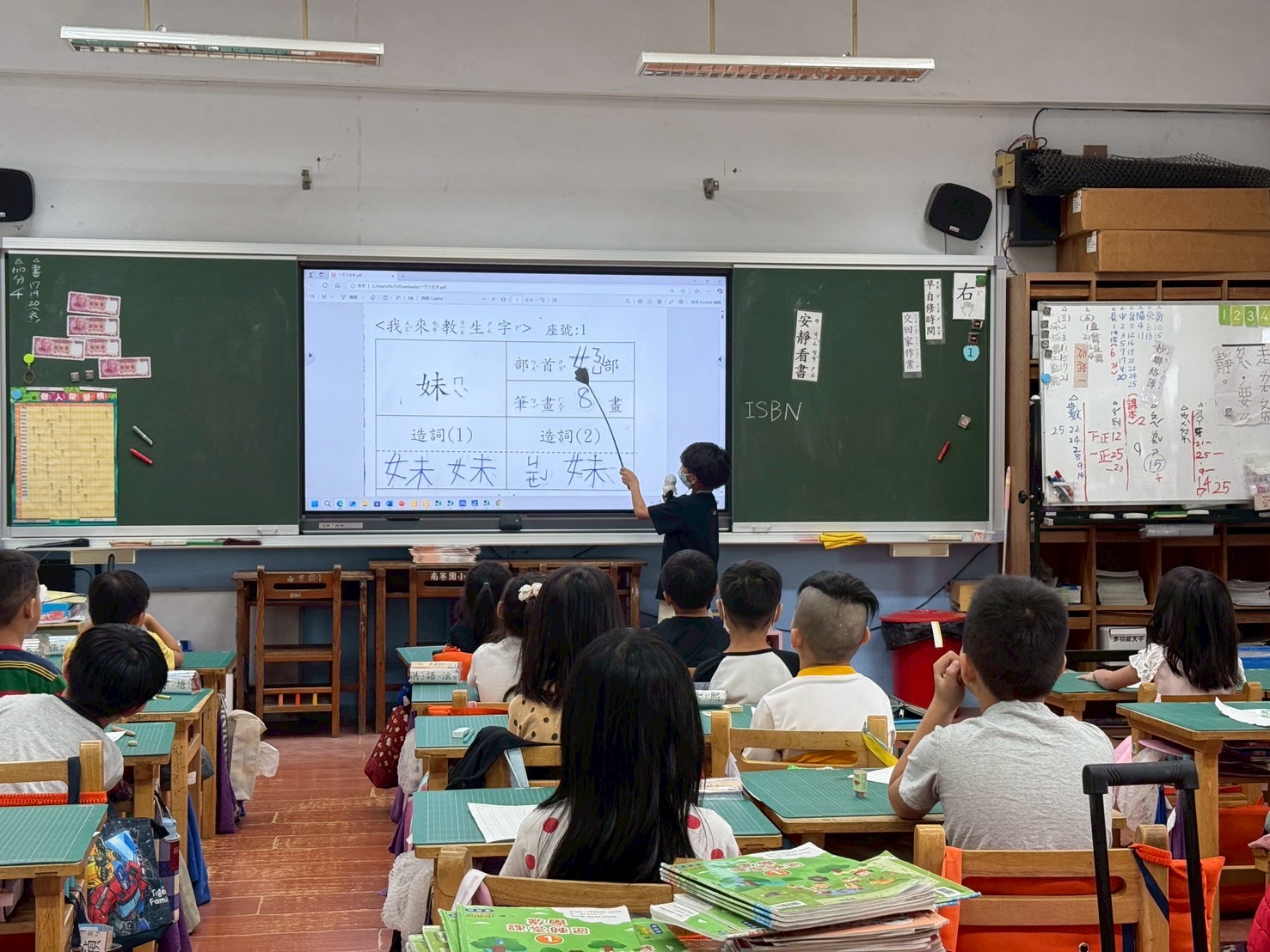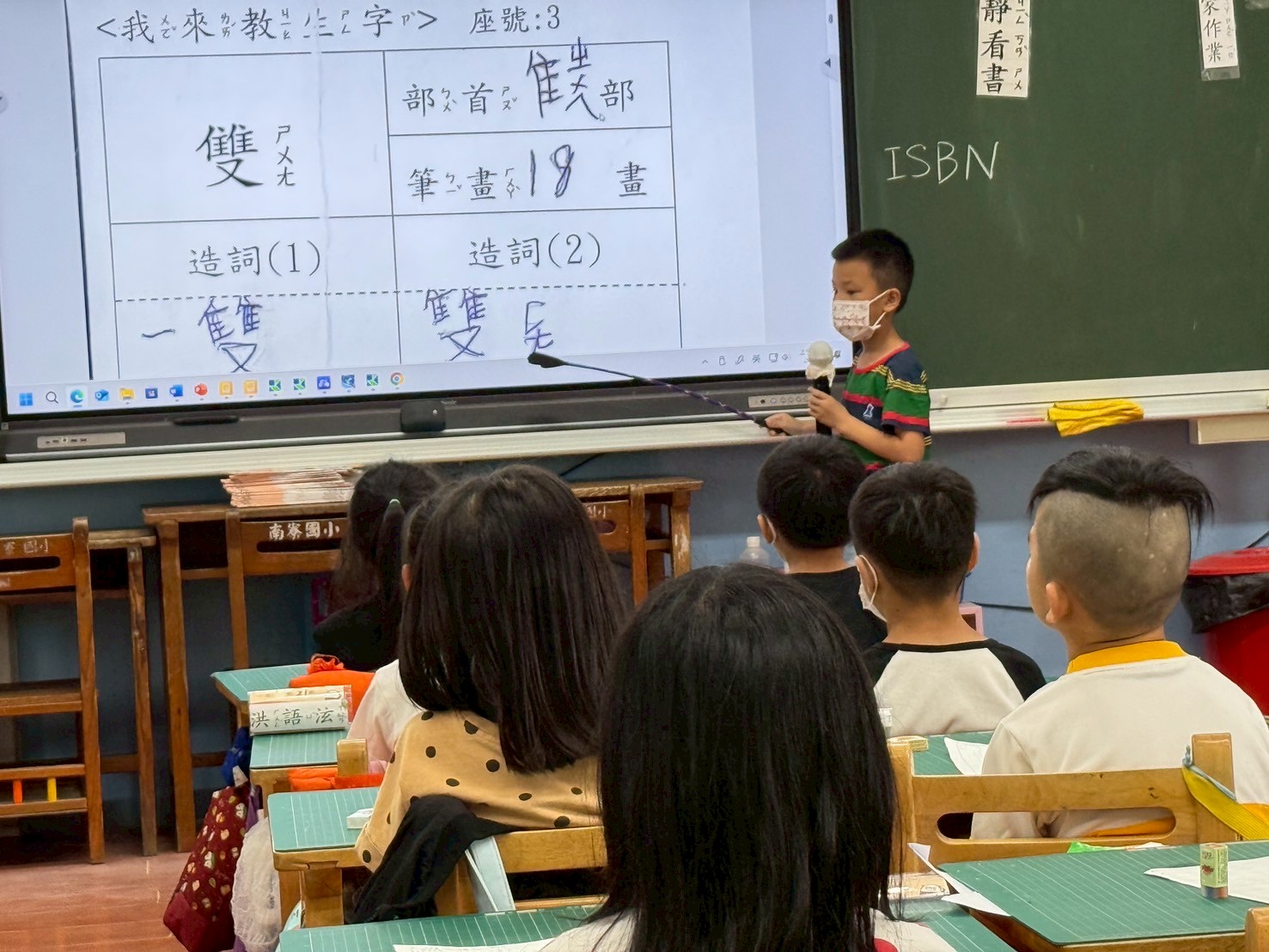 一年甲班秀怡老師任教的國語課中,孩子們參與一項結合語文認知與口語表達的生字教學活動。課堂由全班朗讀詞語兩遍揭開序幕,透過重複朗誦引發語感與專注力。接著,孩子們依序上台介紹生字的部首、筆畫、造詞與造句。這樣的設計落實建構主義教學理論,讓學生在實際操作與語言輸出中,主動建構對文字的理解。