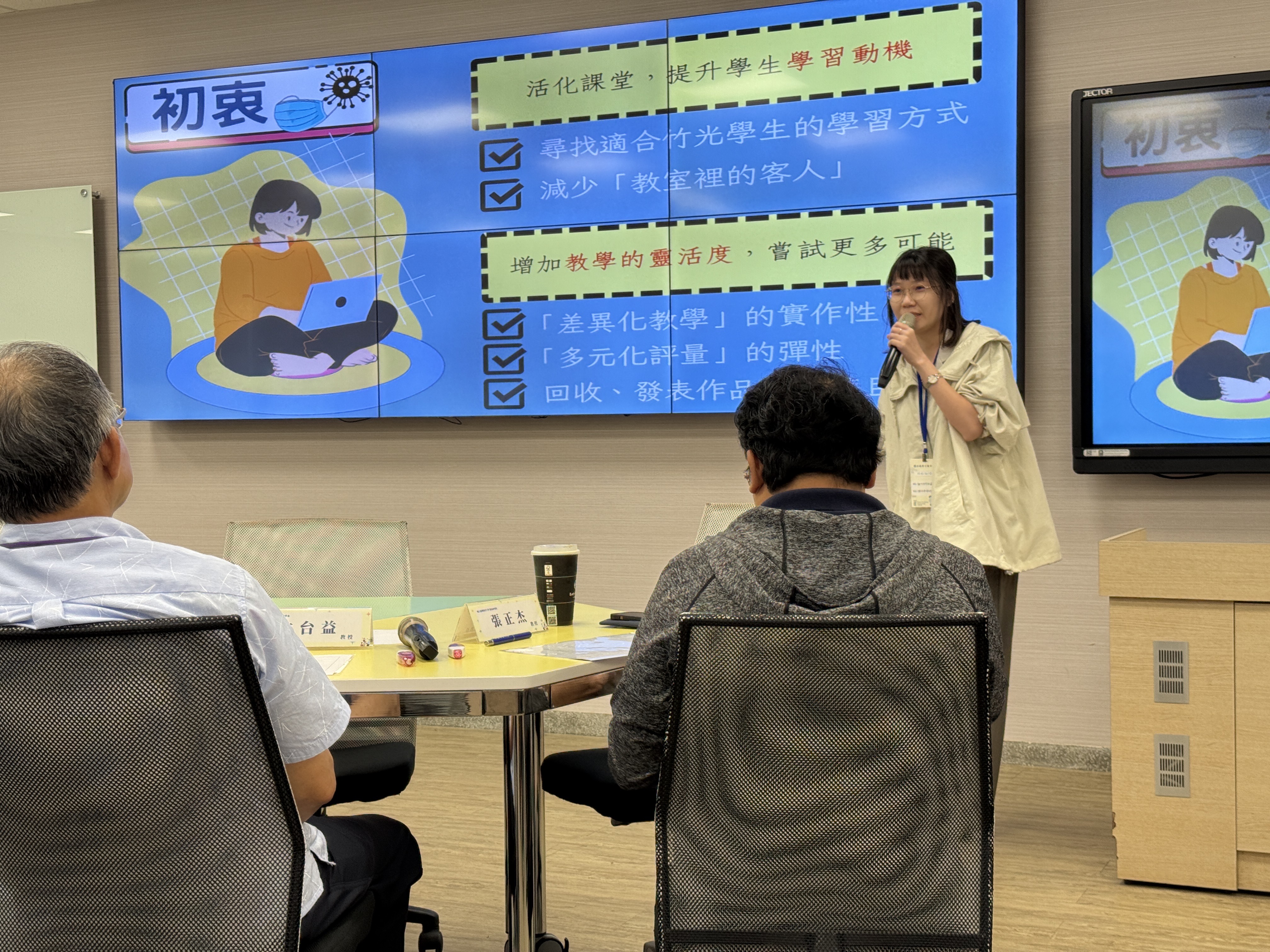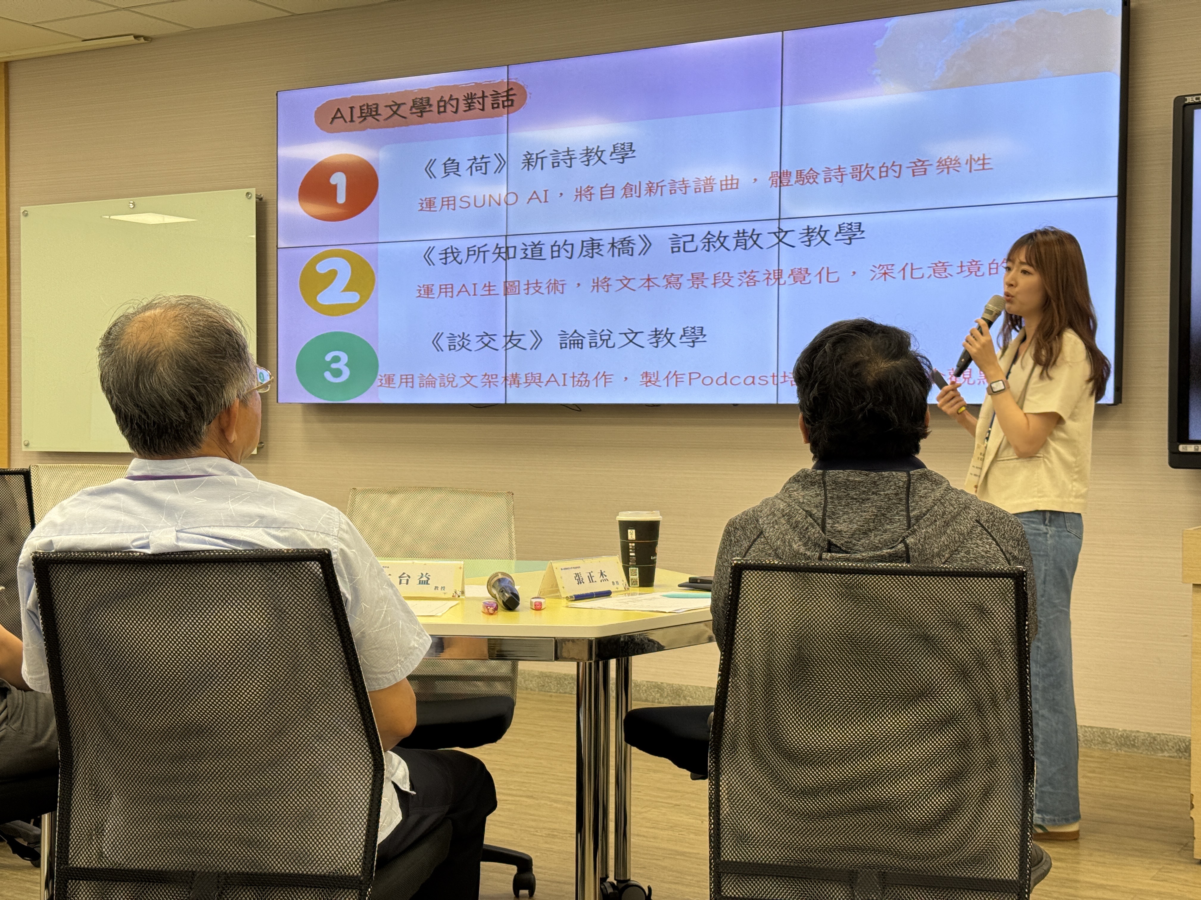 竹光國中在數位學習推動上展現亮眼成果,該校承接計畫已進入第五年,從最初的數學領域參與,逐步轉向國文領域接手,並將AI與數位學習深度融入教學。國文科教師運用AI生圖技術協助學生理解文學作品的深層意象,在新詩教學中讓學生運用AI創作並配樂,在論說文教學中結合AI協作製作Podcast節目,培養學生跨媒材表達能力。