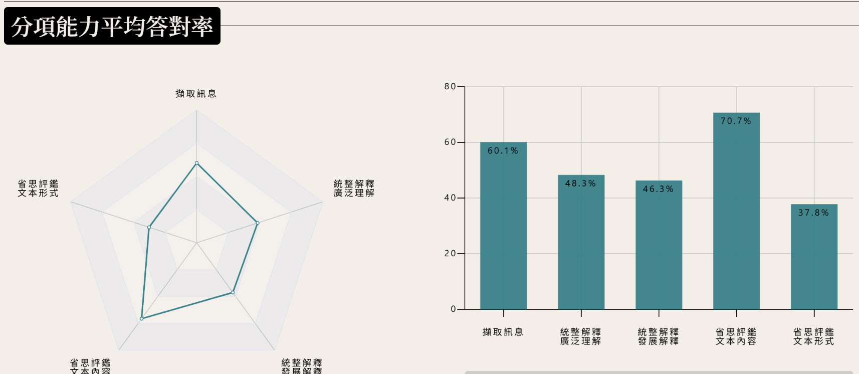 品學堂不僅提供豐富文本,更精心設計閱讀理解題目。學生在測驗後可即時回顧錯誤題目,深入理解自身閱讀盲點,進而強化閱讀理解能力。教師則能透過班級分析報告,全面掌握學生的答對率與各項閱讀指標表現,例如:擷取訊息、統整解釋、省思評鑑等,並據此調整國語領域教學策略,達成更精準的教學目標。