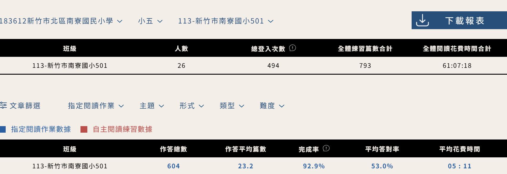 南寮國小充分利用每週固定的晨光時間,讓全班學生手持平板,一同投入品學堂的閱讀饗宴。經過近兩學期的實踐,成效斐然。許多學生已培養出對閱讀理解的成就感,頻頻向老師分享「我今天答對率有80分!」、「我自主閱讀了6篇!」。這不僅培養了學生自主、固定的閱讀習慣,也讓他們在練習中找到了學習的樂趣與成就感。