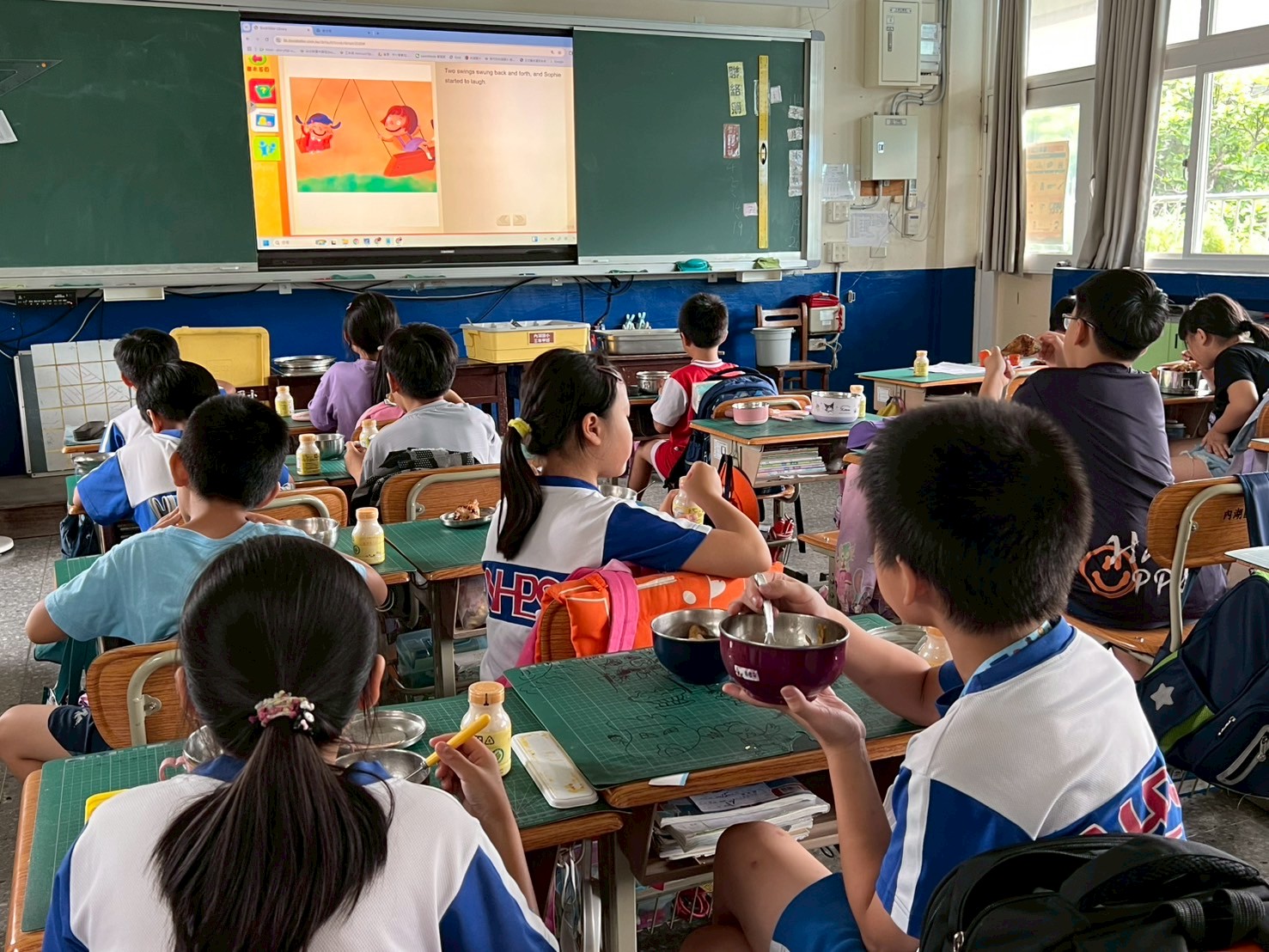 為提升學童英語閱讀興趣與能力,利用午休時間播放「布克聽聽」英文繪本動畫,開啟孩子們的英語學習新體驗。