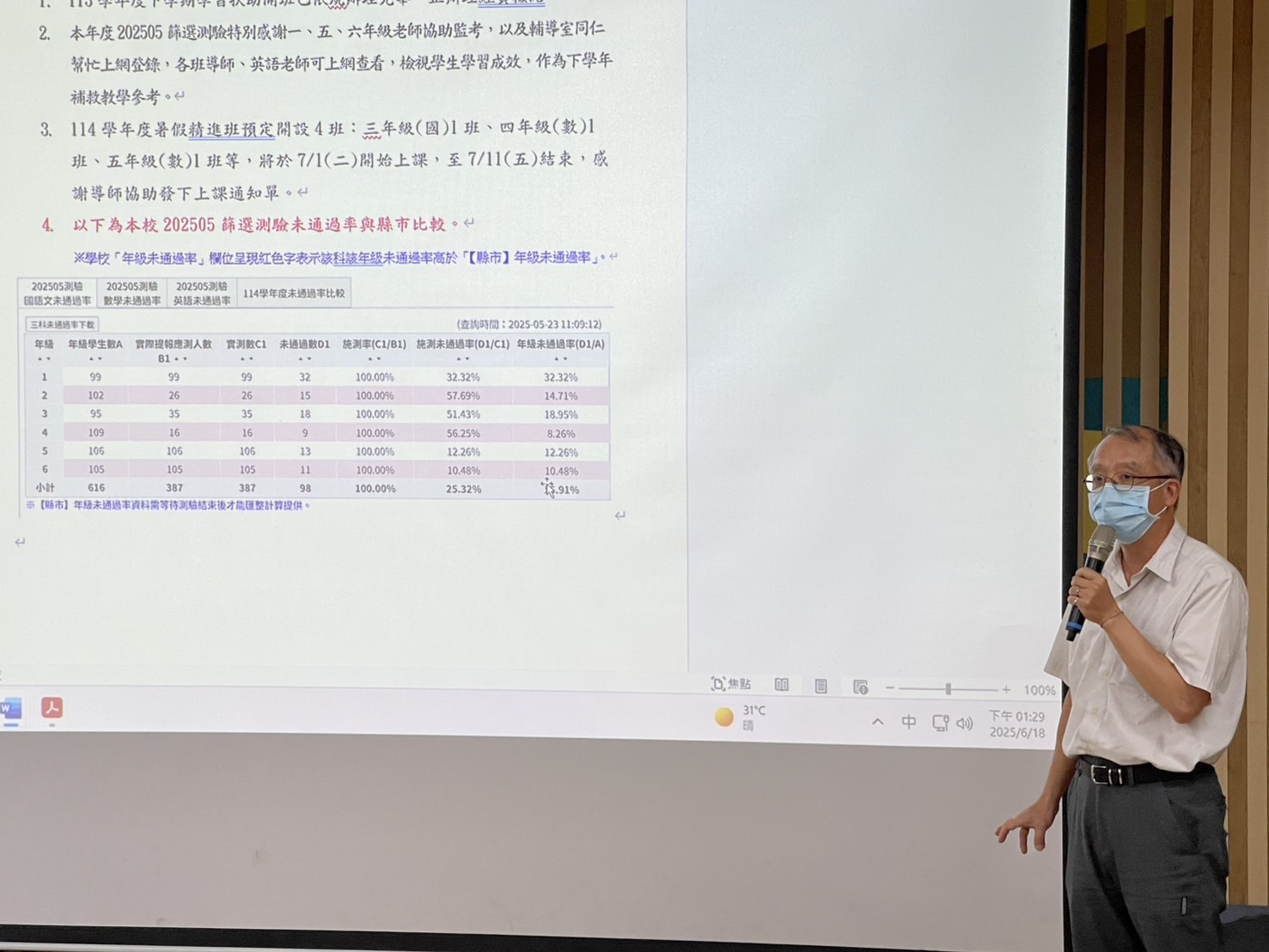 校長除感謝班級導師、授課教師教導外,在這個會議也討論本次測驗,將測驗結果分析交到相關會議中討論外,也要針對班級在實施後結果分析提請下學年在班級授課中適時澄清迷失概念,唯有班級與精進班概念強化下,才能引導學習方法與態度,讓孩子能逐步克服困難、建立信心。。