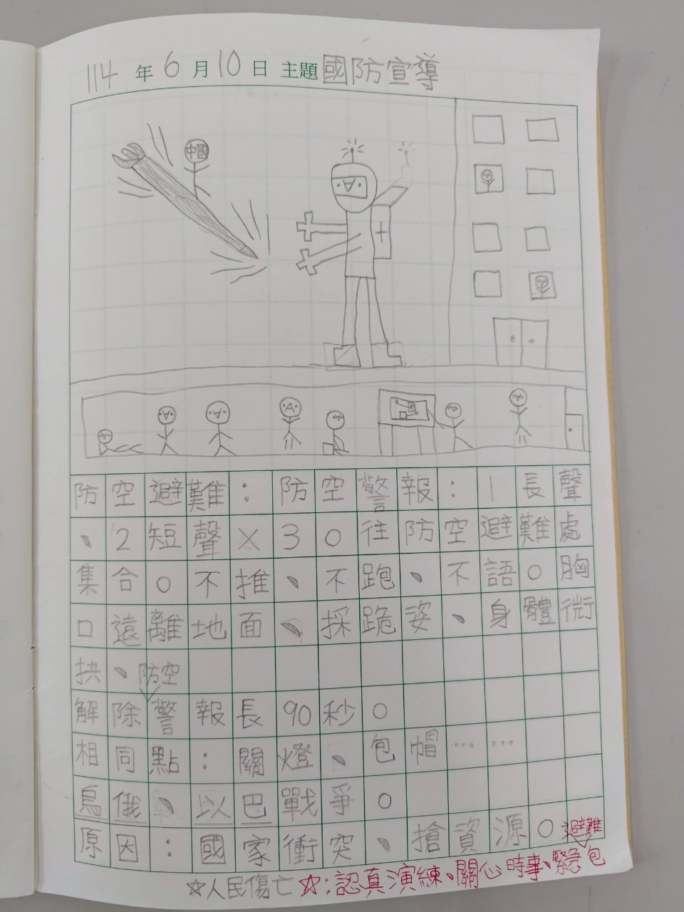 最近新聞提及正在進行中的戰爭主要有兩場:俄羅斯和烏克蘭之間的俄烏戰爭,以及以色列和哈瑪斯之間的加薩戰爭。我們也會有戰爭嗎?發生戰爭時又該怎麼辦?各班孩子們期末班會,要看一部防空避難的影片,並討論議題:防空避難和我們地震演練的相同點有哪些?不同點有哪些?大家有看過戰爭的新聞或相關書籍嗎?請說說看你知道的事件。戰爭產生了哪些危害?發生戰爭可能的原因有哪些?