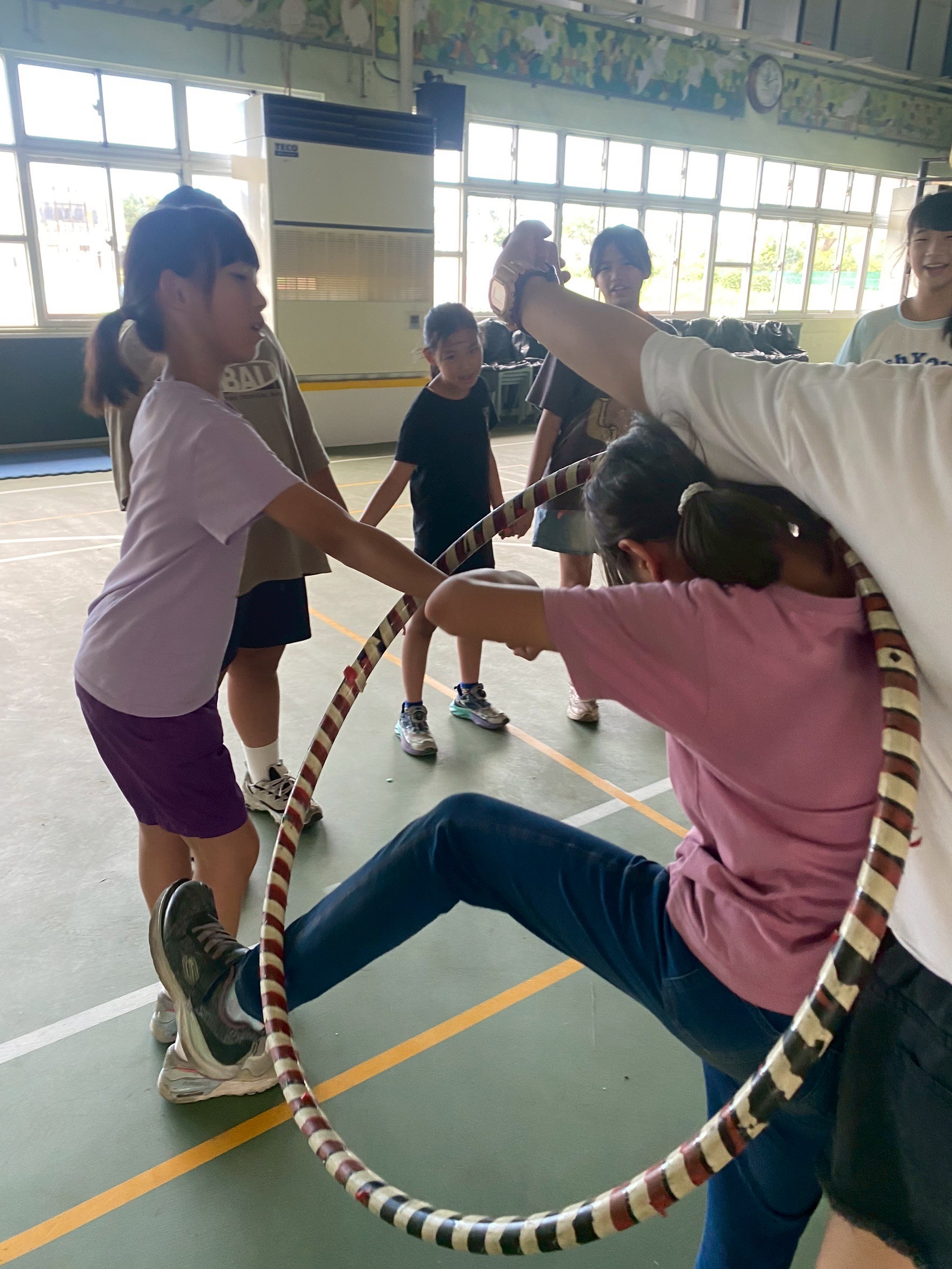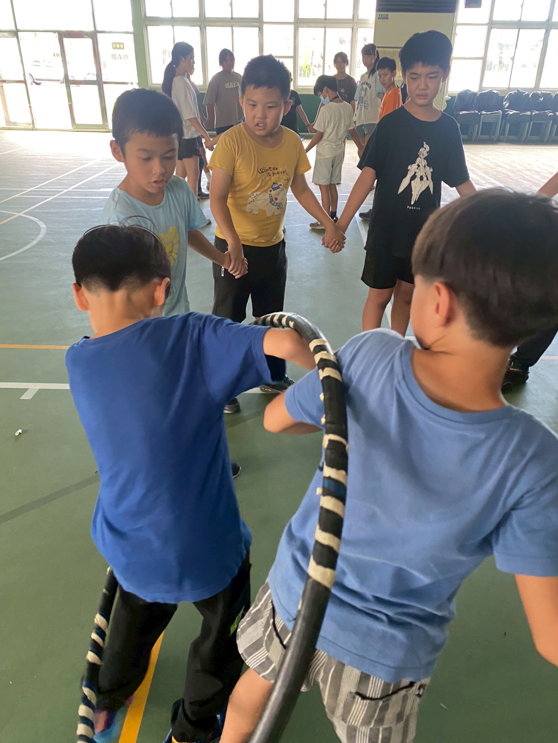 今天的體育課先讓孩子們分2組進行「一圈到底」的活動,11個人一組手拉手圍成一圈,規則是在每個人的手不能放開的原則下以呼啦圈穿過每個人的身體再回到原點,2組PK,第一次挑戰2分鐘為限;第二次挑戰1分半為限,速度快的獲勝,讓孩子學習互助合作,提升團隊精神。