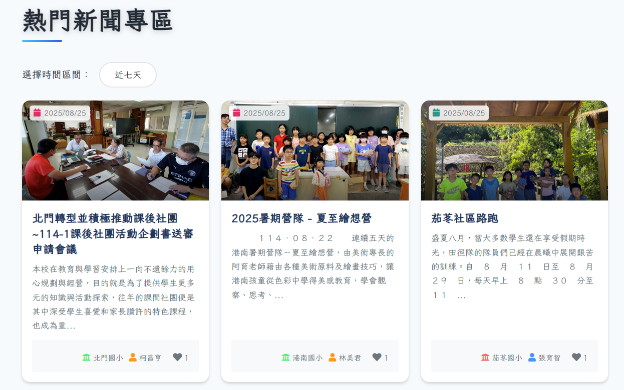- 愛心點讚衝人氣:讀者可對新聞按「愛心」,系統即時彙整點讚數與瀏覽量,形成熱門排行與趨勢儀表板,讓教師與民眾一眼掌握最受關注的教育議題。