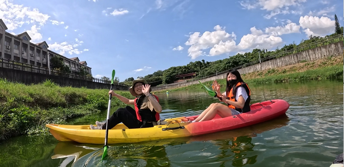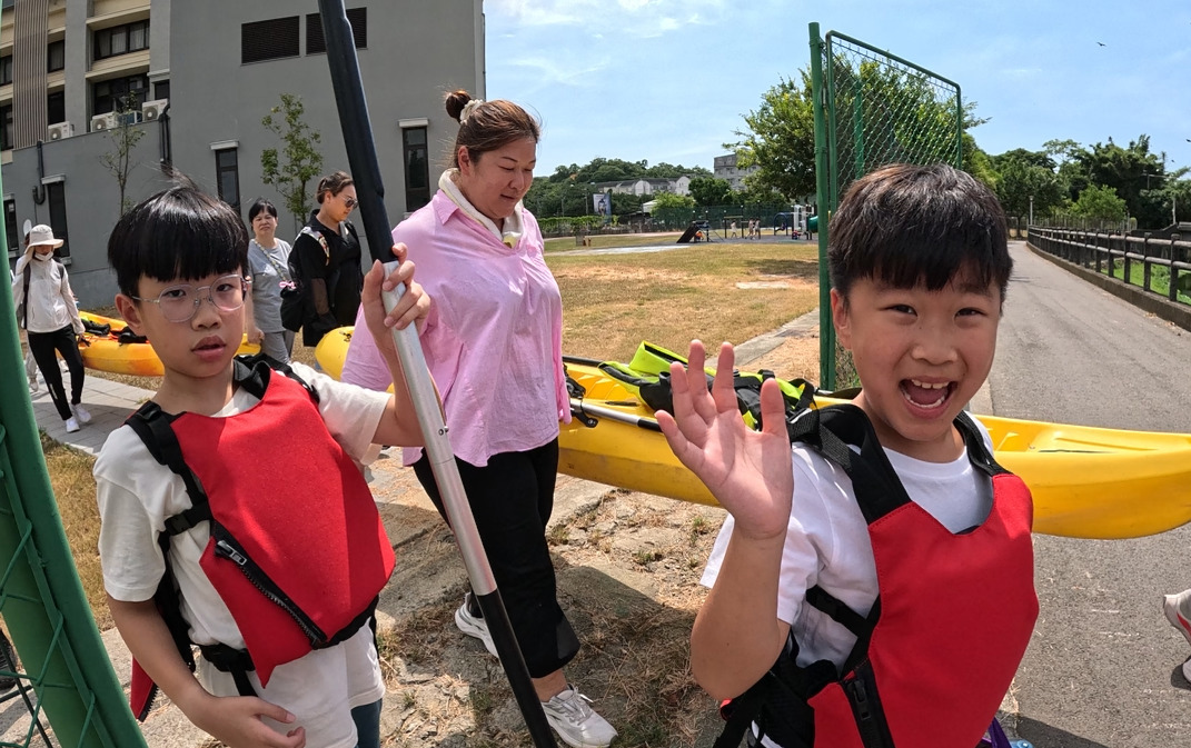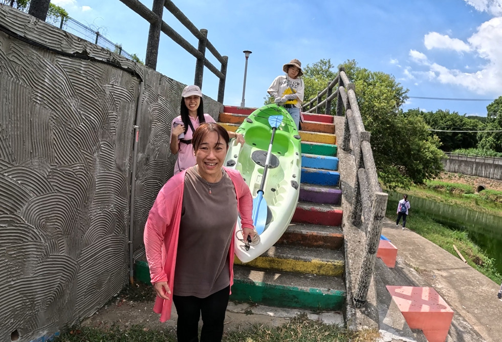理論課程結束後,大家齊心協力,穿上救生衣,並將獨木舟從學校搬運至鄰近的客雅溪畔。過程中,老師們相互合作,展現絕佳的團隊精神。當獨木舟緩緩駛入水中,大家在專業指導下,逐步掌握划行技巧,體驗在水面上自由探索的樂趣。