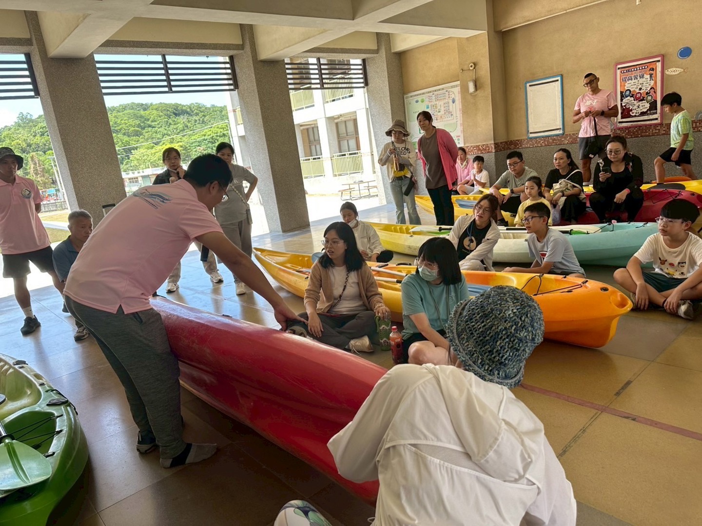 研習一開始,由麗卿主任詳細解說戶外教育的風險管理,確保所有參與者都能在安全的環境下進行活動。接著,由至正老師為大家講解獨木舟的操作技巧,從基本的上下船動作,到划槳的正確姿勢,老師們都專心聆聽並實地演練。