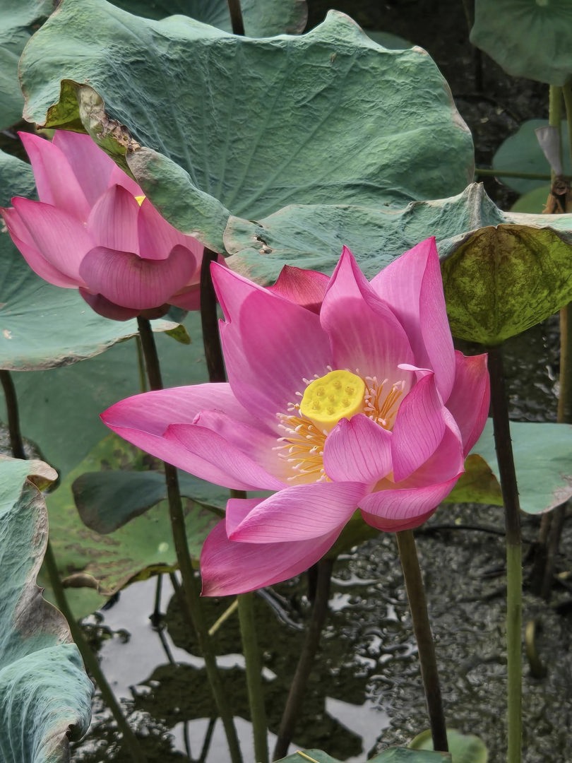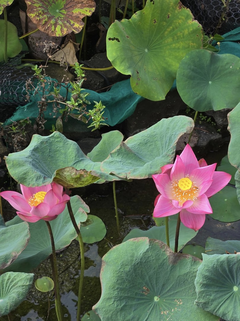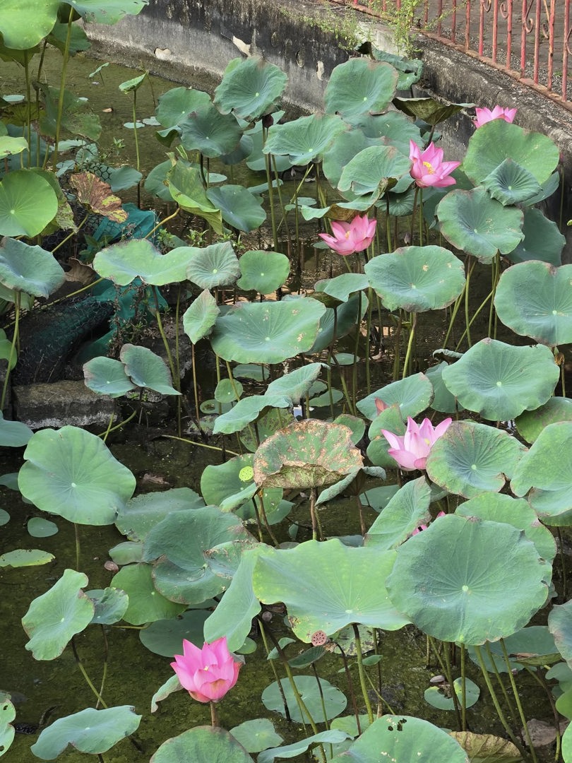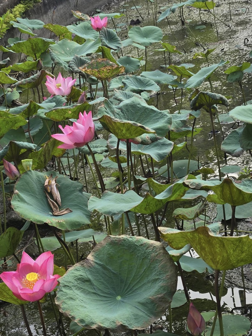 新竹國小星花水池裡,荷花正值盛開,亭亭玉立,花影倒映水面,伴隨微風漣漪,宛如一幅靜謐美景。