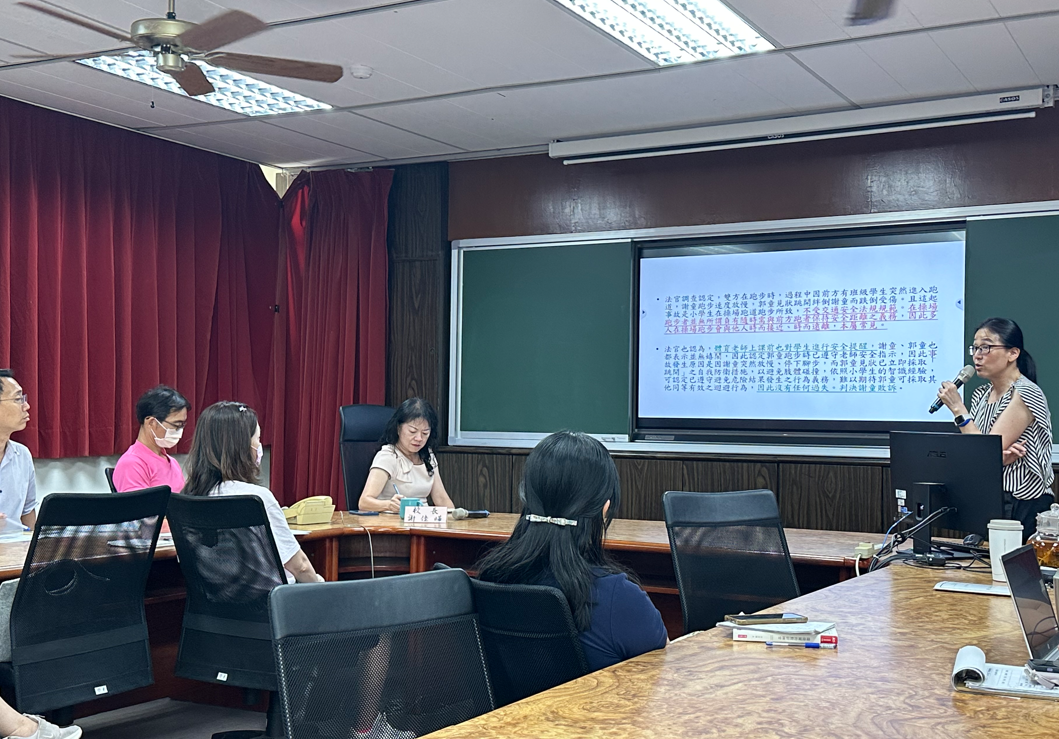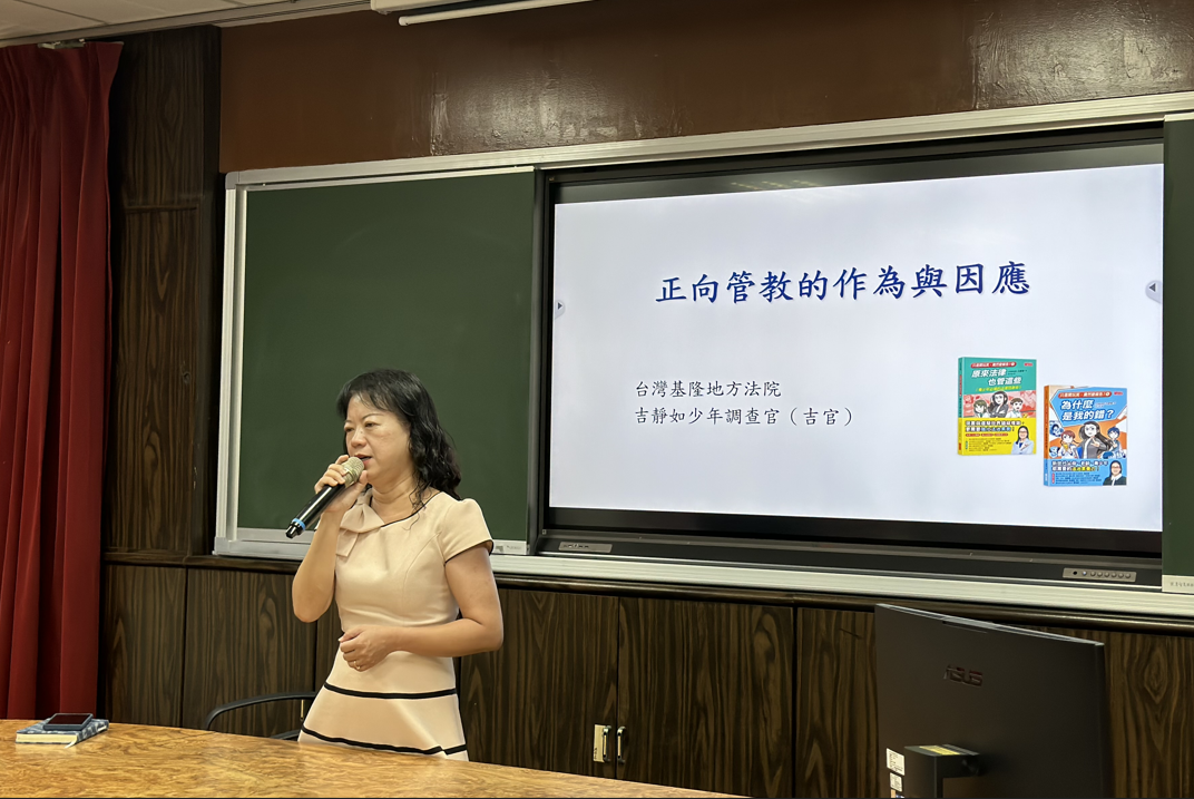 由本校校長主持開場,介紹了基隆地院主任調查保護官吉靜如(簡稱吉官),在開學第一週為第一線教師們舉行講座,分享正向管教之法規。