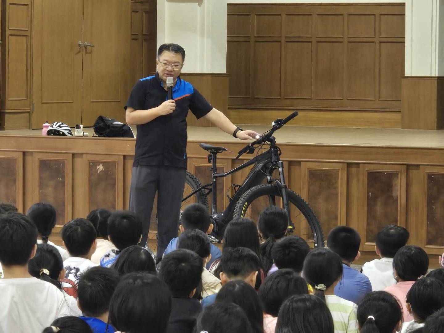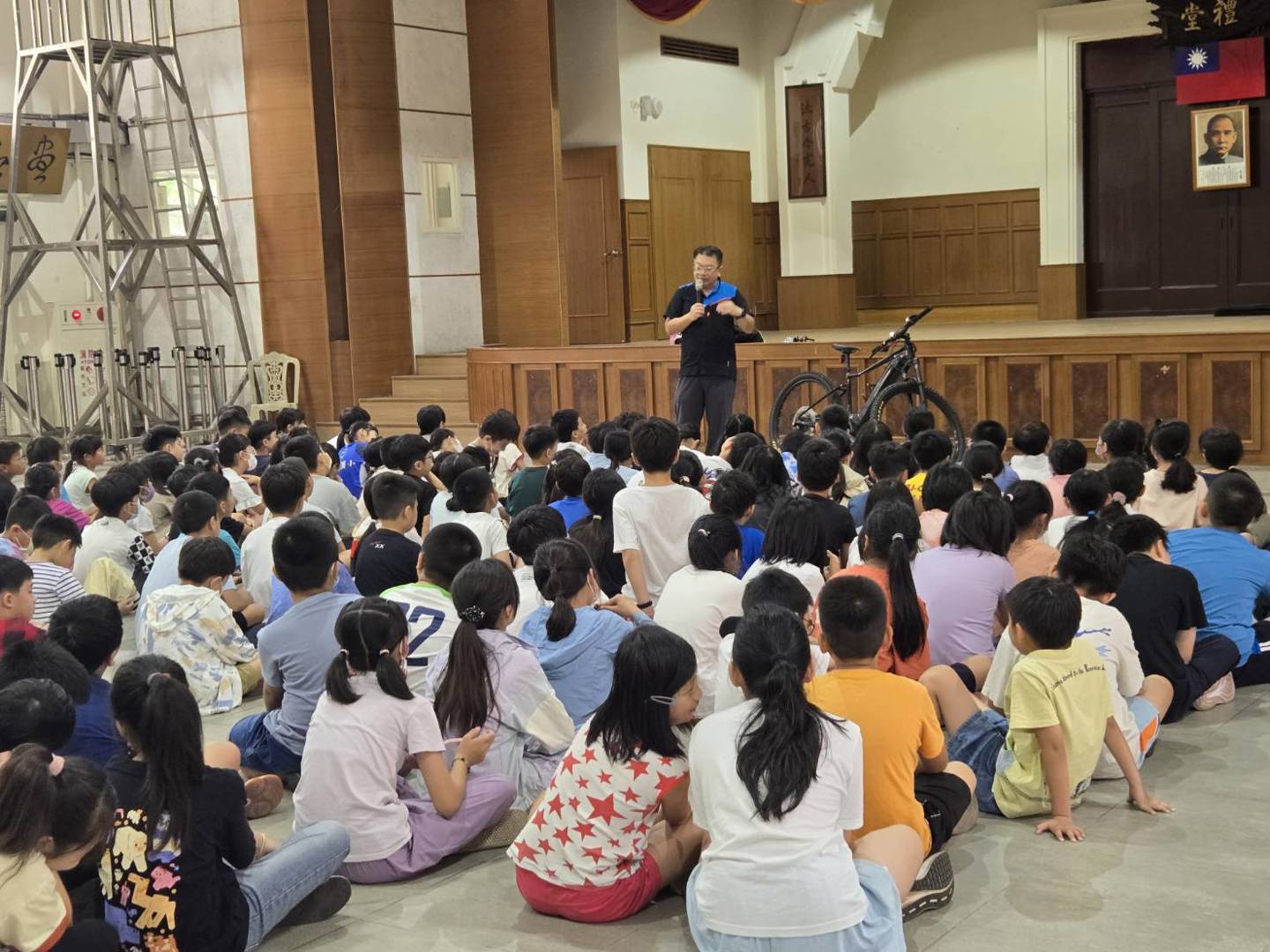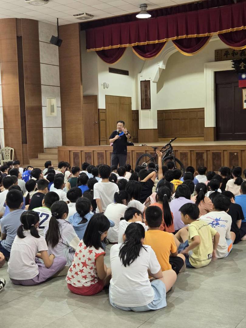 講師善診店長相信大家都不陌生,對於學生騎腳踏車時應注意的事項及腳踏車的相關裝備都說明的非常詳細,相信經過今天的週會後,四年級的學生都具備清楚的腳踏車認識。