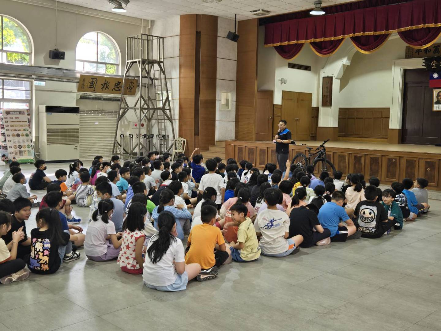 週三早休禮堂例行性進行學生週會,今天的主題是學生騎乘自行車的安全宣導-保腦教育。