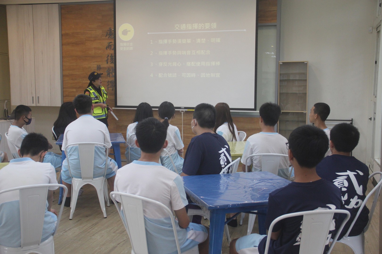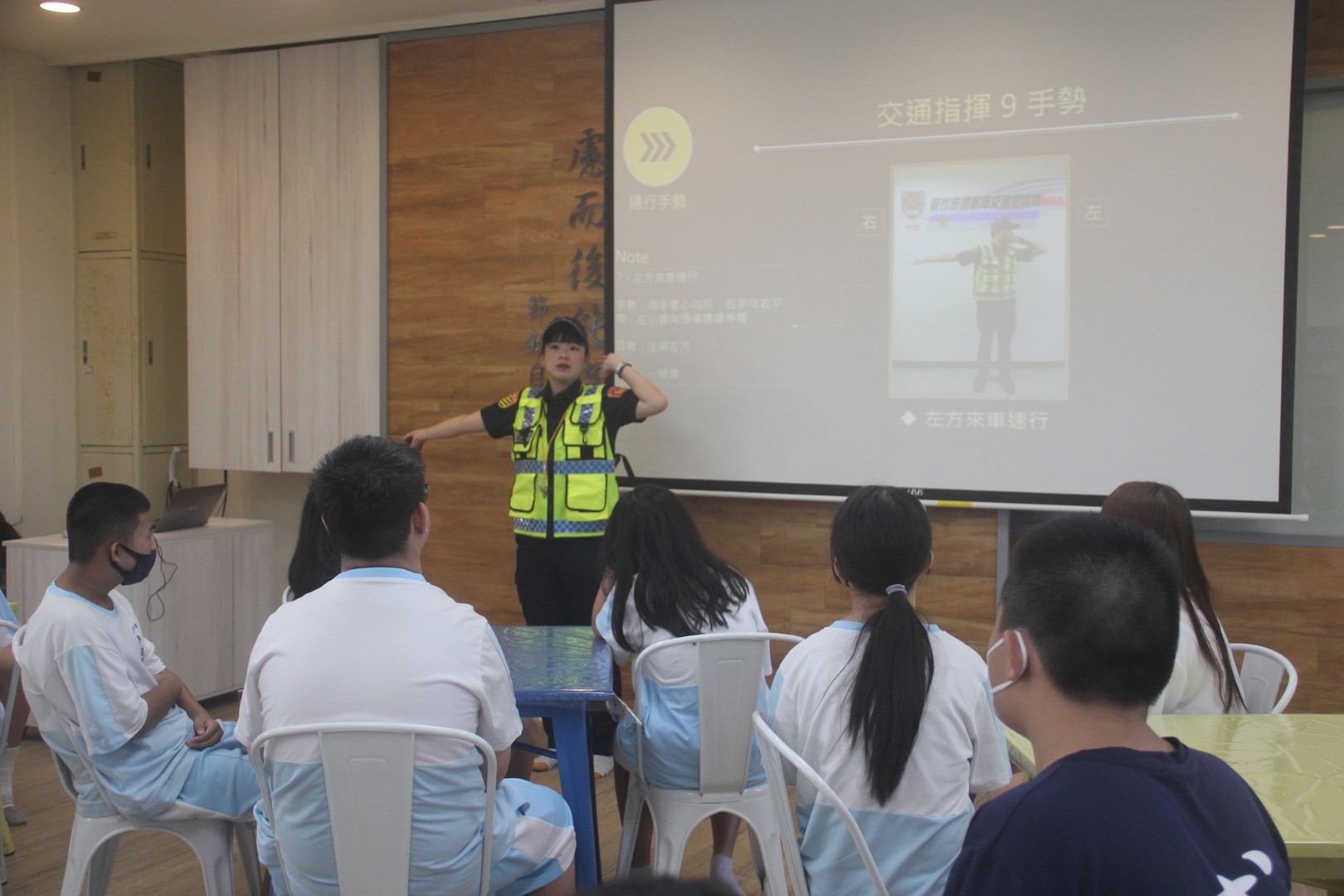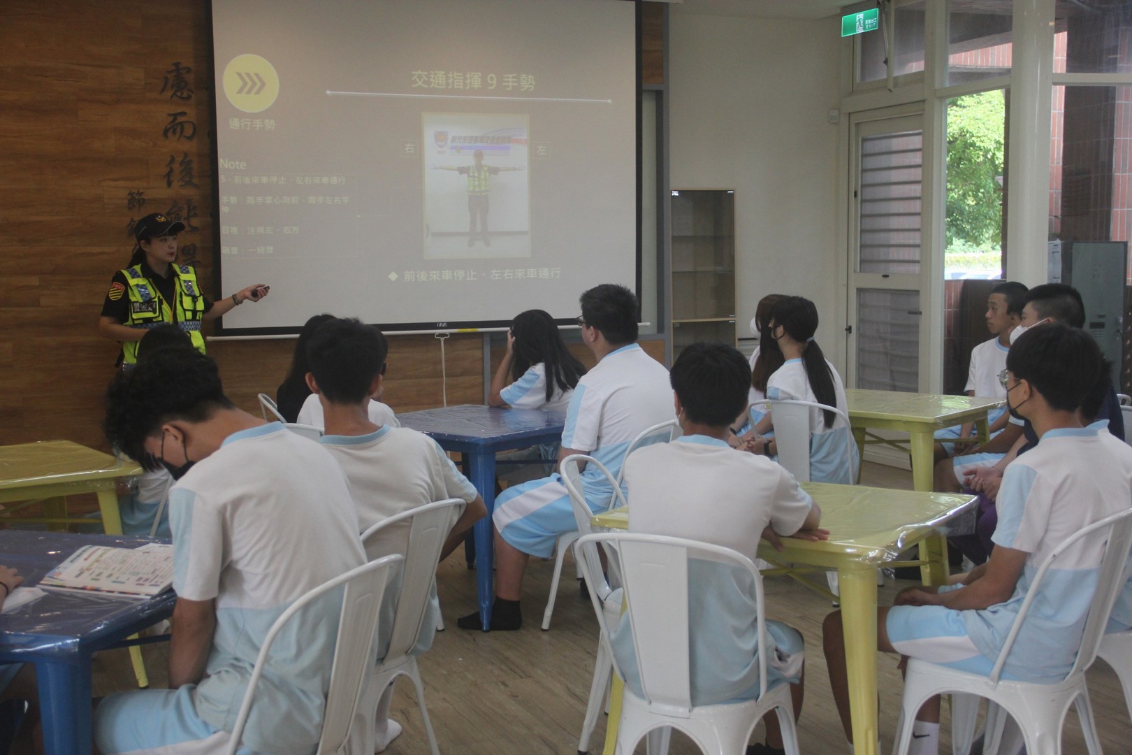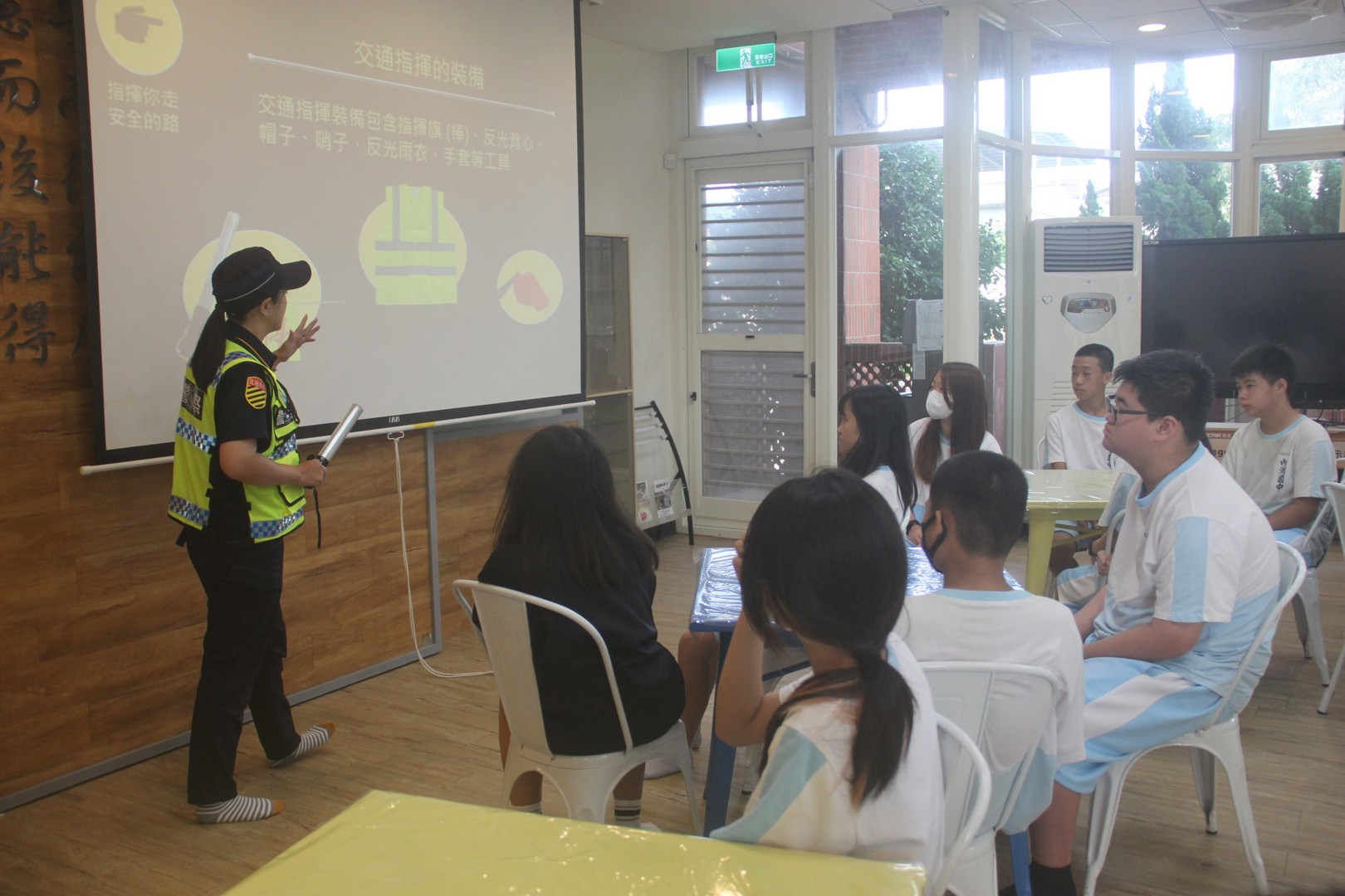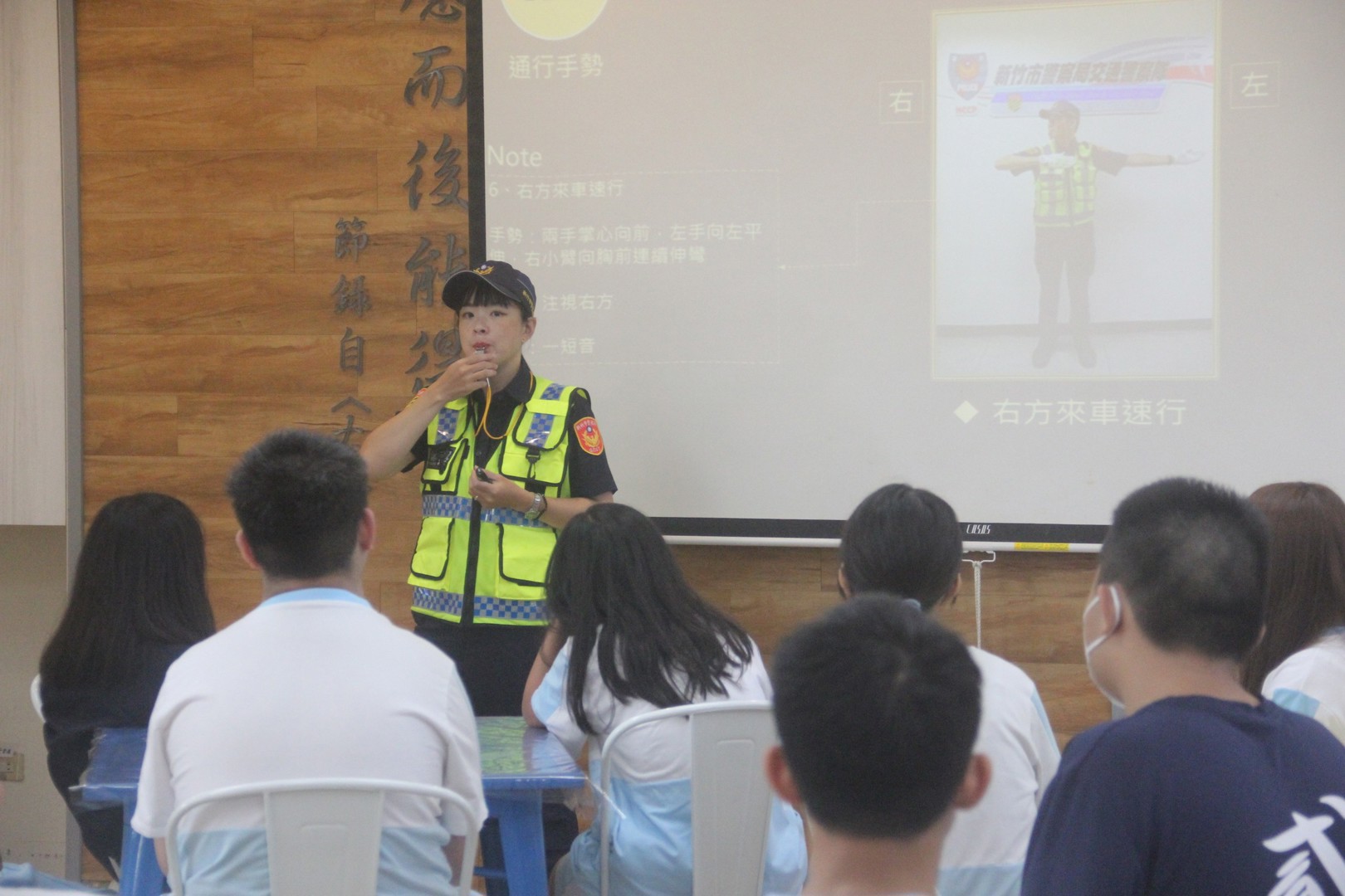 本校積極推動交通安全教育,保障學生上放學交通安全,學校每學期籌組交通服務隊協助導護老師進行交通導護工作。本校於114年9月9日早自習辦理學生交通服務隊培訓研習,特請新竹市警察局交通隊許筱慈警官到校為24位交通服務隊同學針對交通法規及手勢演練進行宣講。許警官充分說明值勤要領、交通指揮手勢及哨音等,並結合交通事故相關時事進行路權觀念宣導,以提升學生交通知識及法規觀念,使參與學生獲益良多。
