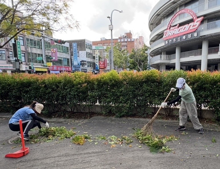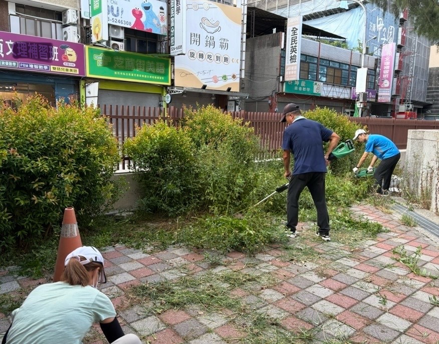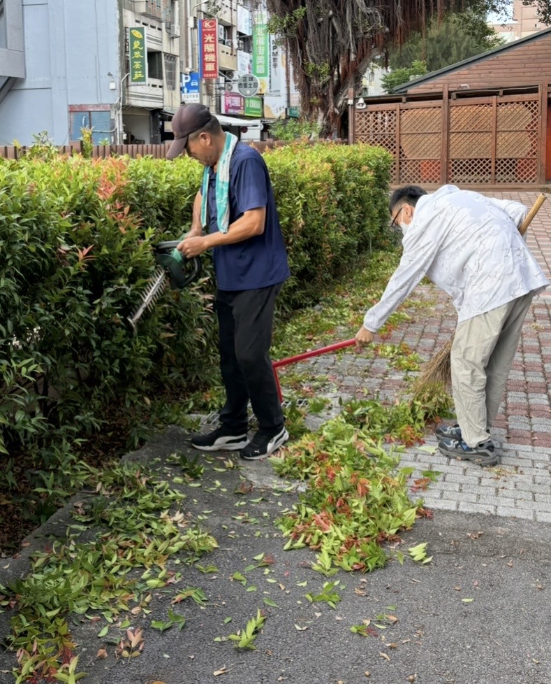 今天總務主任趁著一早的好天氣,率領本校最優秀的總務處服務團隊來學校東側圍牆邊,牆邊的綠籬有著長虹木又稱紅芽赤楠~在經過一段的生長時間之後,葉片會慢慢的轉為濃綠,頂芽再修剪過,很快的又是一片嫩紅,整年的紅綠交錯,讓綠籬多了變化,不再是一成不變的綠色。因為樹型優雅、生長緩慢,已成為經常被運用於綠籬的植物。高大的主任和警衛大哥手持籬笆機一下就修剪好,大夥跟著把樹枝樹葉放上子車,整條紅芽赤楠綠籬一下被服務人員巧手整理好了,真是美哉校園!