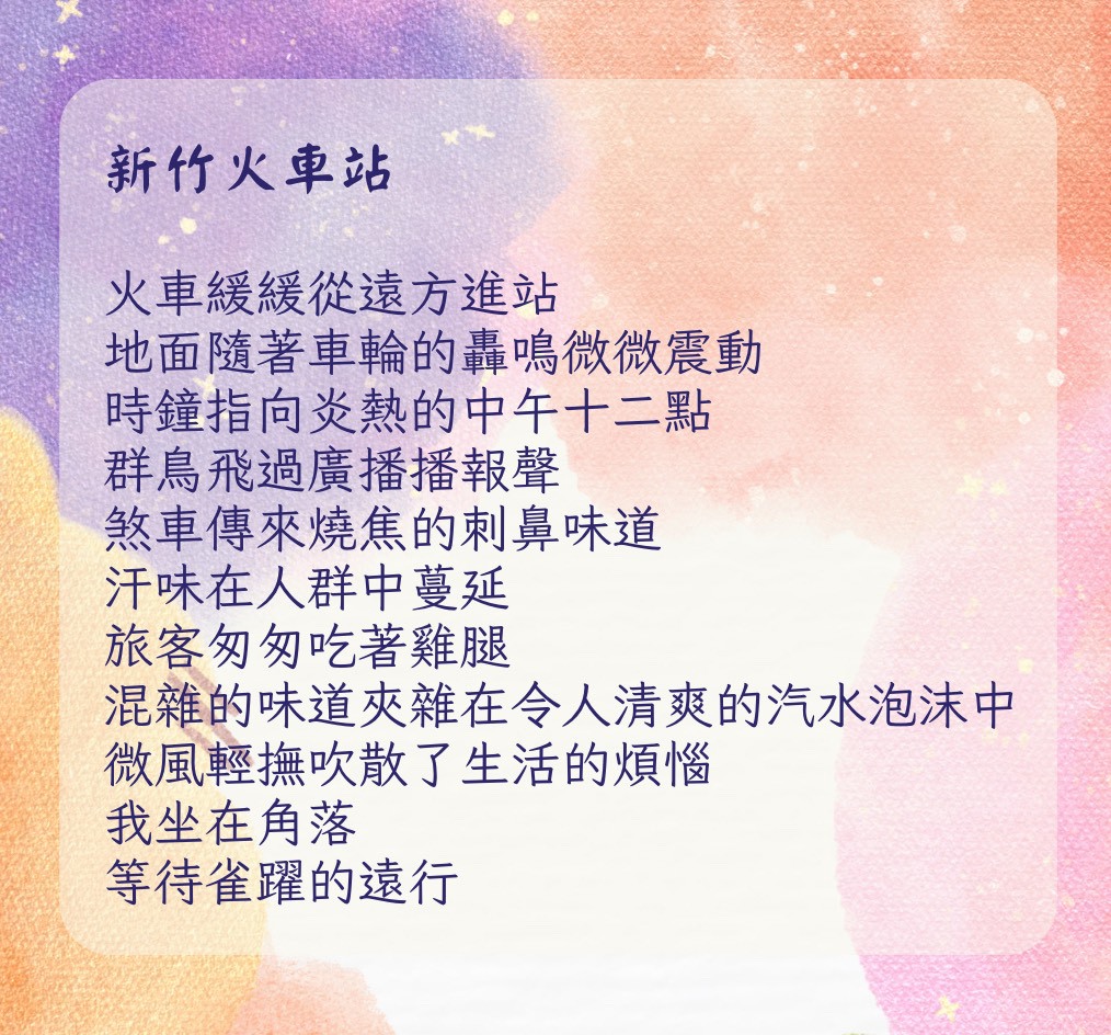 這份作品源自於校訂課程「走讀書海」課程,耀萱老師將國語與社會課程結合,帶領孩子們以新竹市景點為題,分別找兩個自己喜歡的景點來創作兩首詩,並嘗試運用課本所學的「五感寫法」,透過看到、聽到、聞到、嘗到、摸到,將景象轉化為詩意的文字。張梓賢同學便以〈新竹火車站〉為題,細膩描繪日常中熟悉卻常被忽略的城市氛圍。