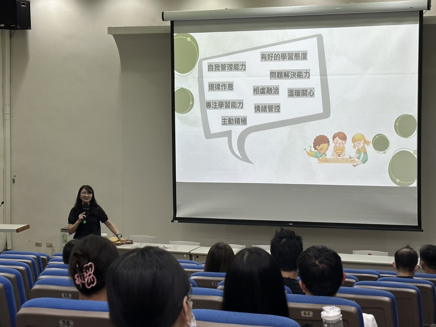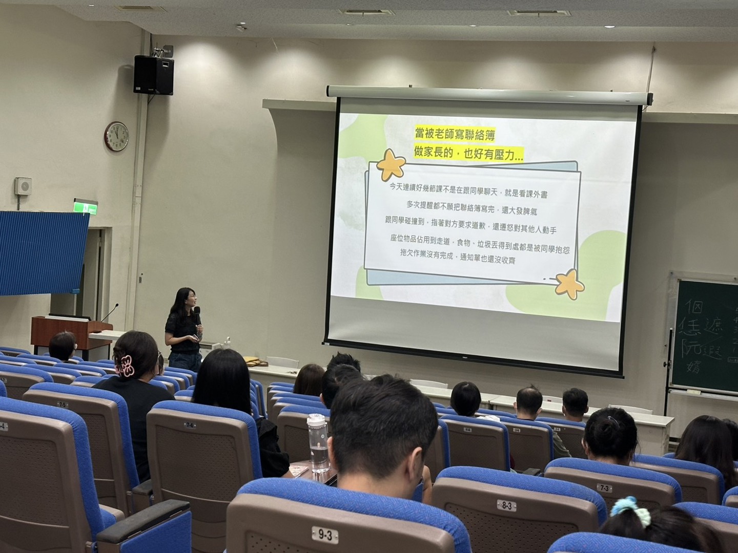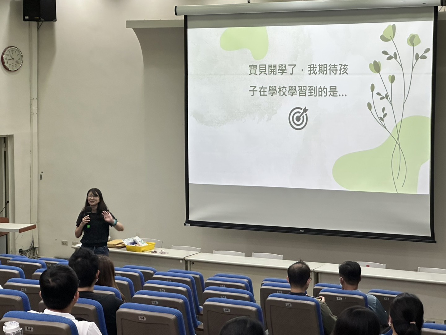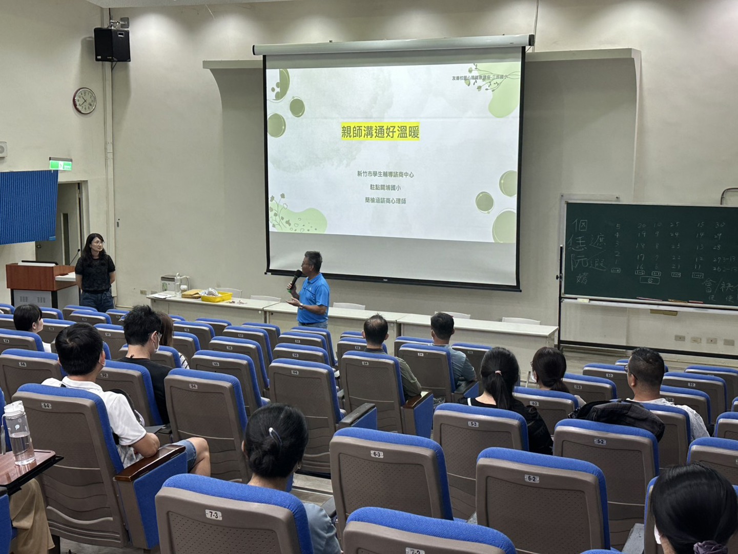 在結束各班導師精心準備的親師座談會後,家長們仍踴躍走進彩虹館視聽教室,參加由簡榆涵心理師主講的「親師溝通好溫暖」親子教養座談會。能在忙碌的一天中留下時間參與,顯見家長們對孩子教育的重視與用心。