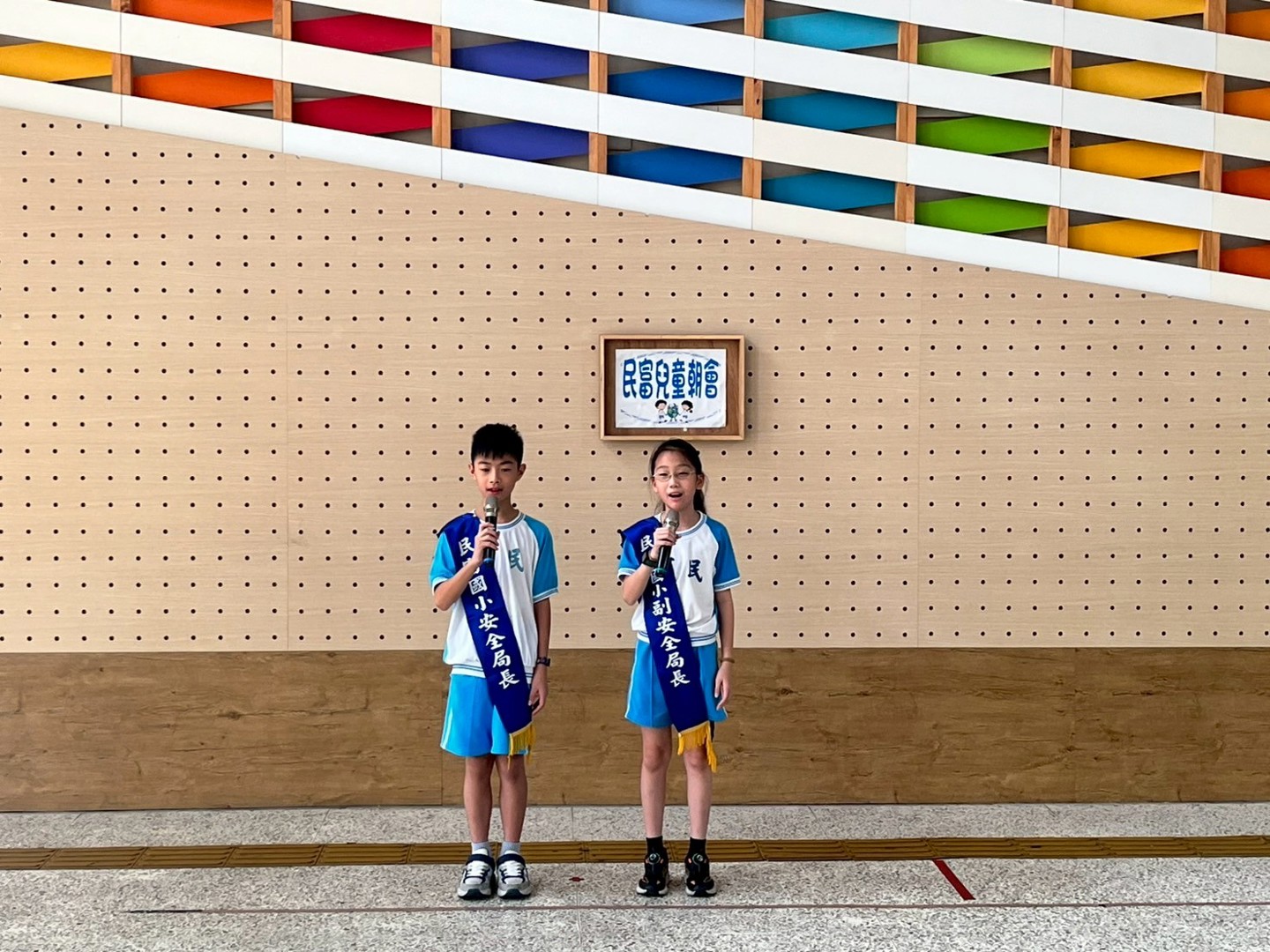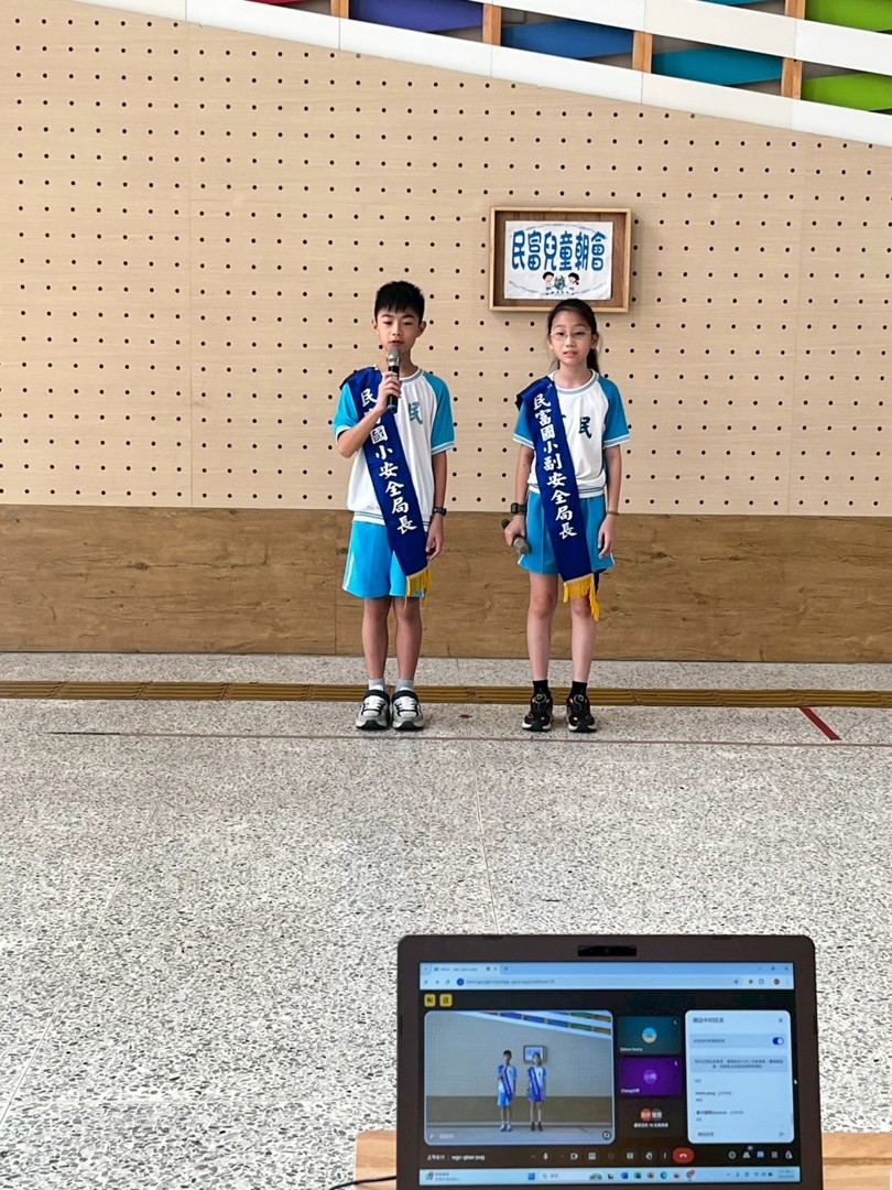 民富國小於今日線上兒童朝會進行安全宣導,由自治幹部安全局許記準、郭可媗主講,提醒全校學生關心走廊及遊戲安全。宣導內容包含走廊樓梯行走慢慢來、避免奔跑推擠等,以及遊戲時注意安全距離、避免危險動作等事項,以維護校園安全,預防意外發生。