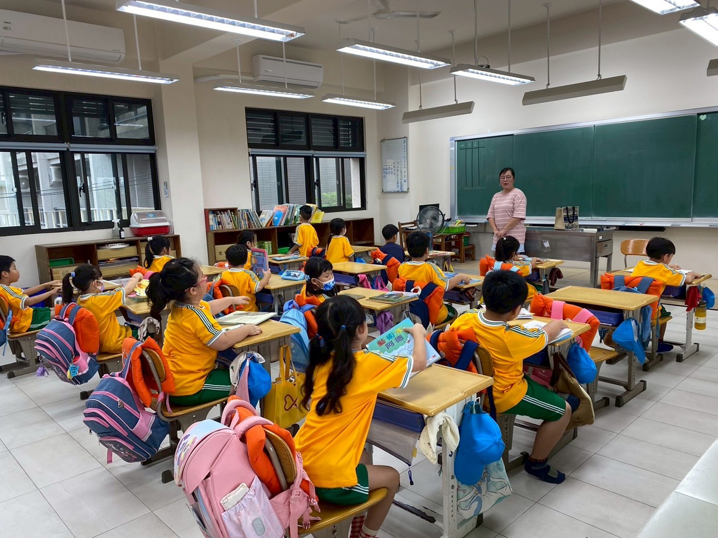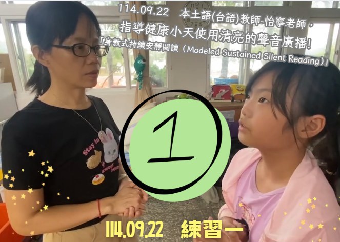 114.09.22 本土語(台語)教師-怡寧老師,指導健康小天使-菲菲,用清亮的聲音廣播,提醒週二全校學生能在8點時,準時和志工媽媽們一同進行「身教式持續安靜閱讀(Modeled Sustained Silent Reading)」。