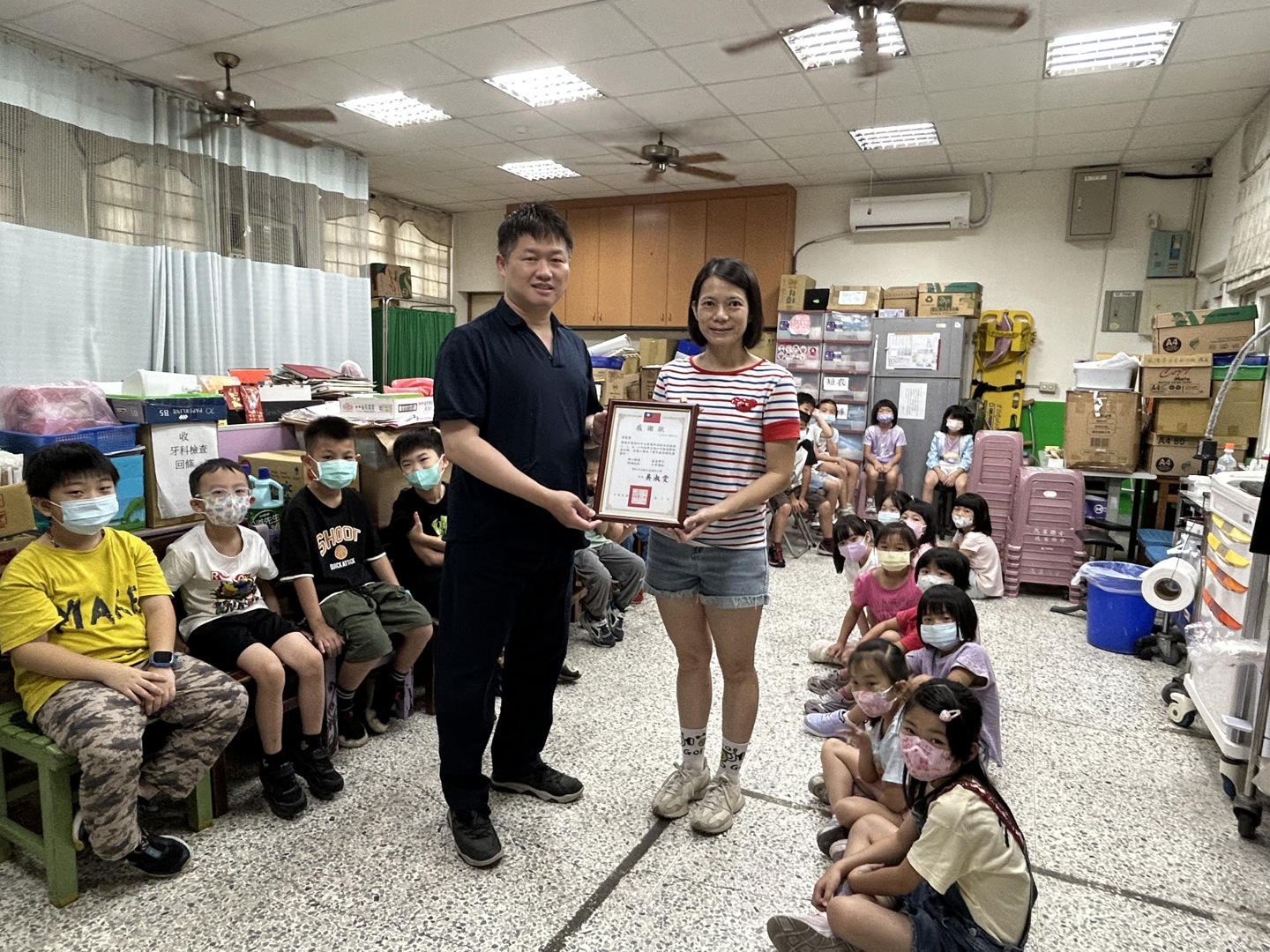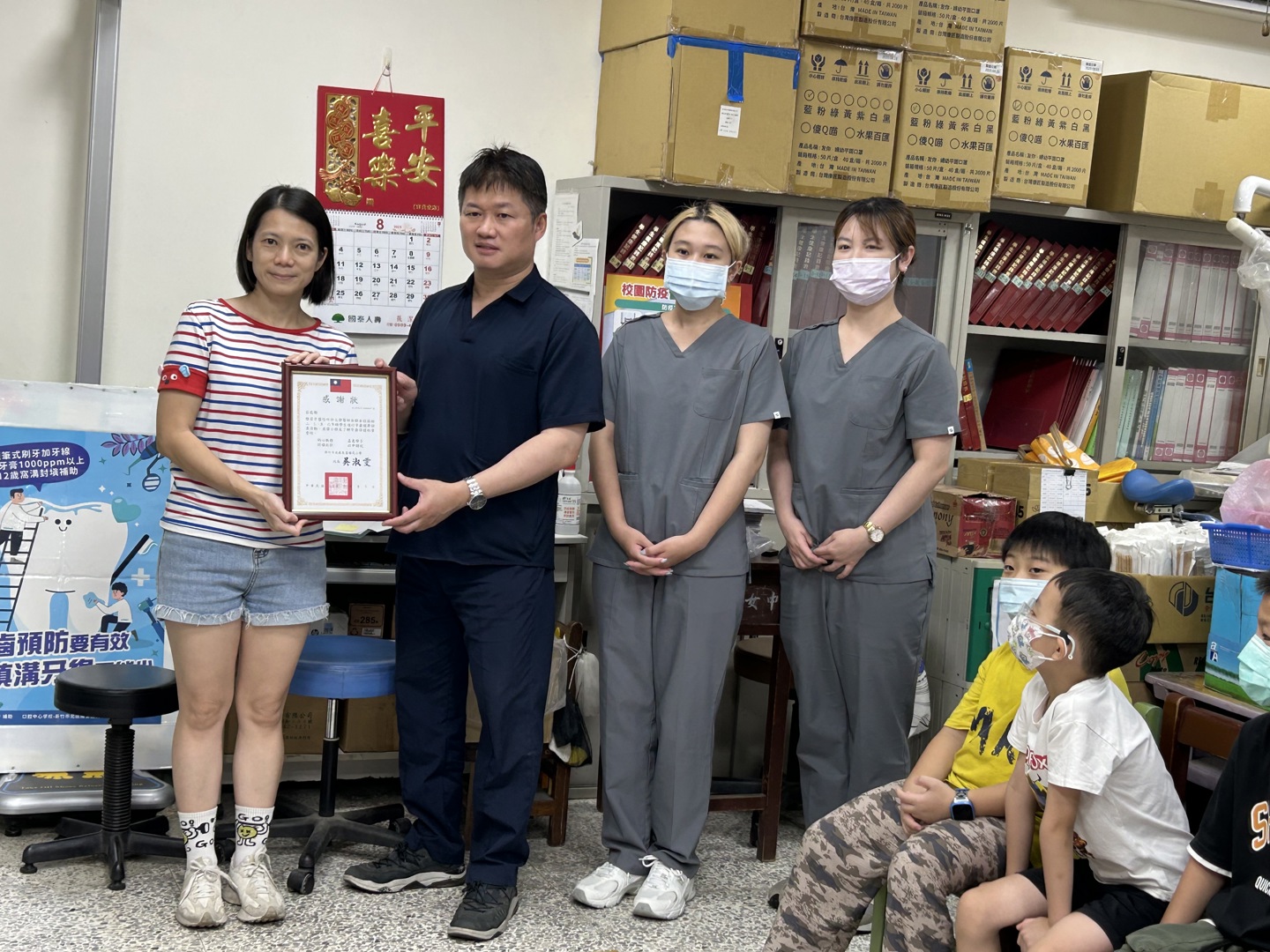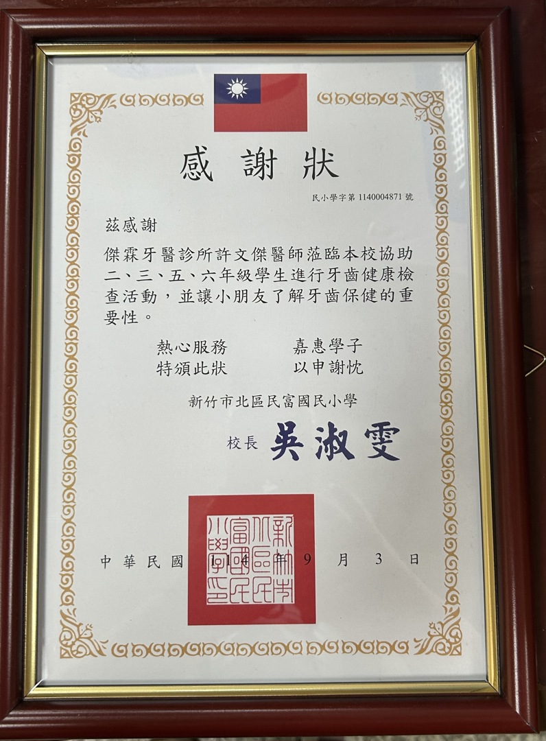 感謝傑霖牙醫診所(許文傑醫師)及(護理師)蒞臨本校協助二、三、五、六年級學生進行牙齒健康檢查活動,提醒孩子們定期牙檢、餐後潔牙、及每周使用含氟漱口水的重要,導師們也會每天提醒學生們餐後潔牙及每周使用含氟漱口水,並讓小朋友了解牙齒保健的重要性,學校親自頒發感謝狀感謝許文傑醫師對民富學童的用心。