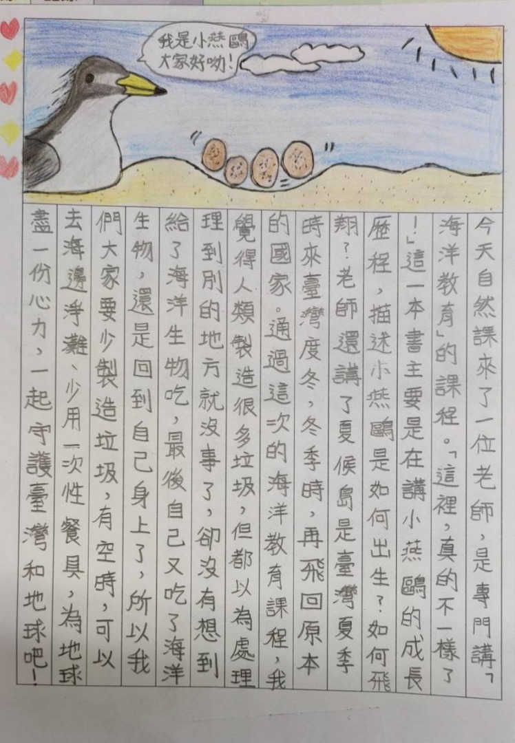 首先透過繪本的導讀「這裡,真的不一樣了!」,讓學生了解香山濕地是小燕鷗的棲息地,呼籲大家協助幫忙牠們有一個安心可靠的育嬰房。在課堂中藉著對於小燕鷗習性的了解,更清楚認知這些候鳥到了夏天時,會有一批批小小的嬌客,從幾千公里外的澳洲大陸,往北飛抵台灣沿岸的河口與沙灘,而香山濕地是這些小燕鷗選擇暫時的棲息地,讓這一群夏候鳥可以在台灣築巢、養育下一代。