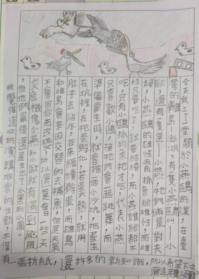 接著透過小燕鷗的立體摺紙,讓學生從互動的過程中,與小燕鷗有進一步的連結,期待講座帶給學生有滿滿的愛,繼續延續守護海洋的心,讓學生心中播下對於海洋守護的心。