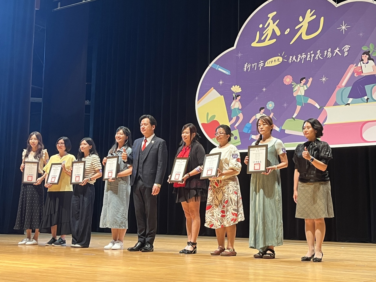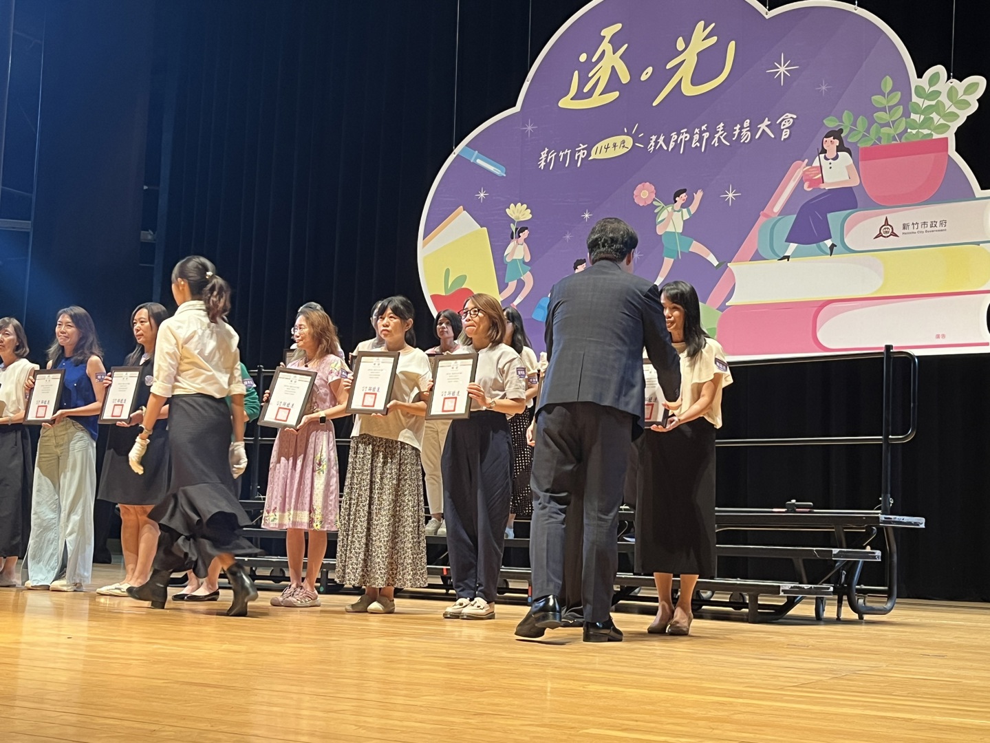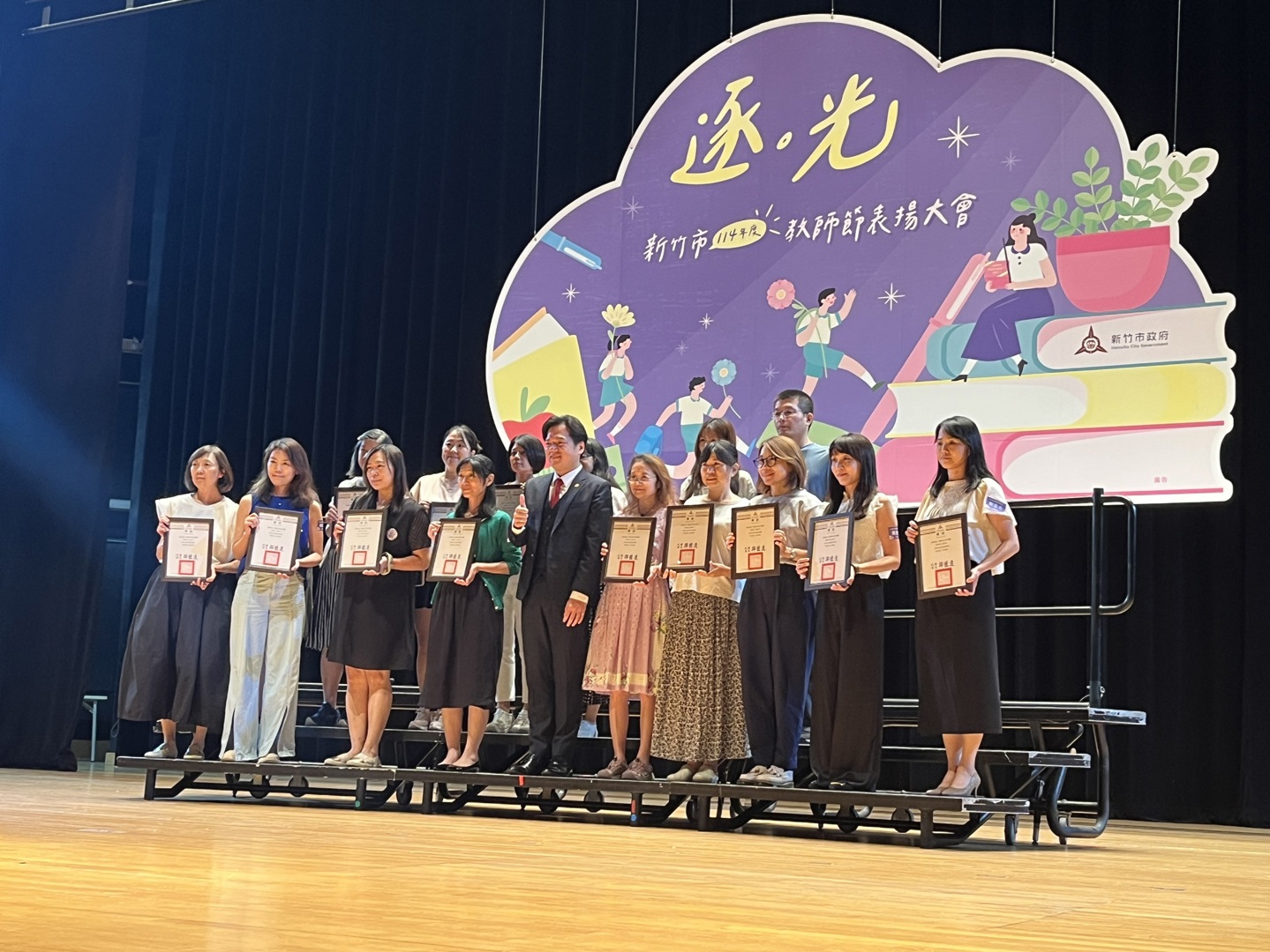 高峰校園日誌:新竹市政府昨(24)日在新竹市文化局演藝廳舉行「114年度新竹市教師節表揚大會」,此次教師節表揚活動搭配逐光這個主題,「光」代表著希望、真理、知識,老師這個角色的任務就是陪伴與指導所有學生追逐這道光,本校特殊優良教師陳文玉、資深優良教師:鮑盈方(20年)、林郁庭(10年)、沈芝誼(10年),以上四位老師今年也接受市府表揚,除了以上四位教師,高峰團隊所有老師也盡心盡力陪伴所有高峰囡仔追逐人生希望的光,期盼所有孩子在未來的道路上都可以順利前行!