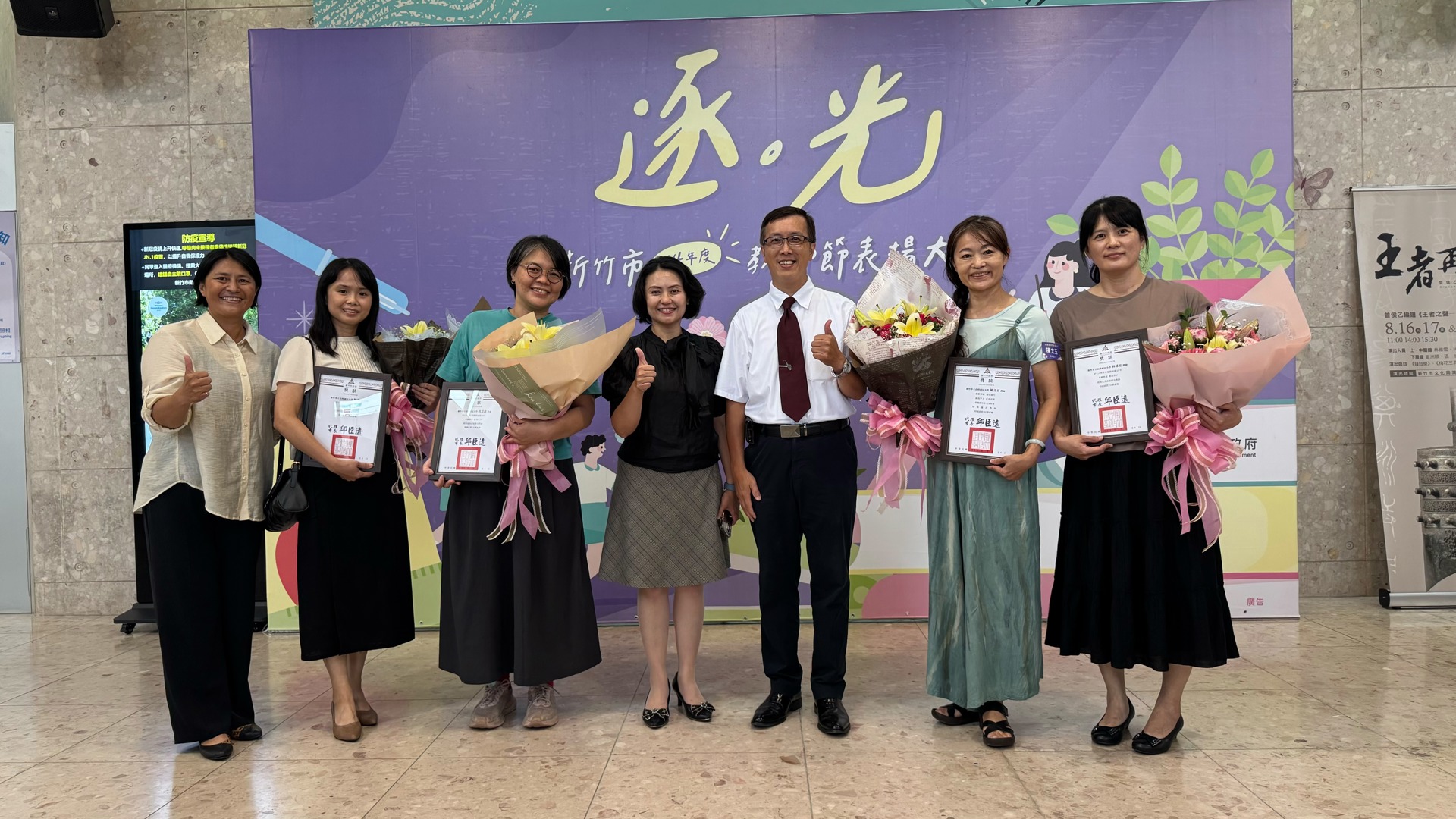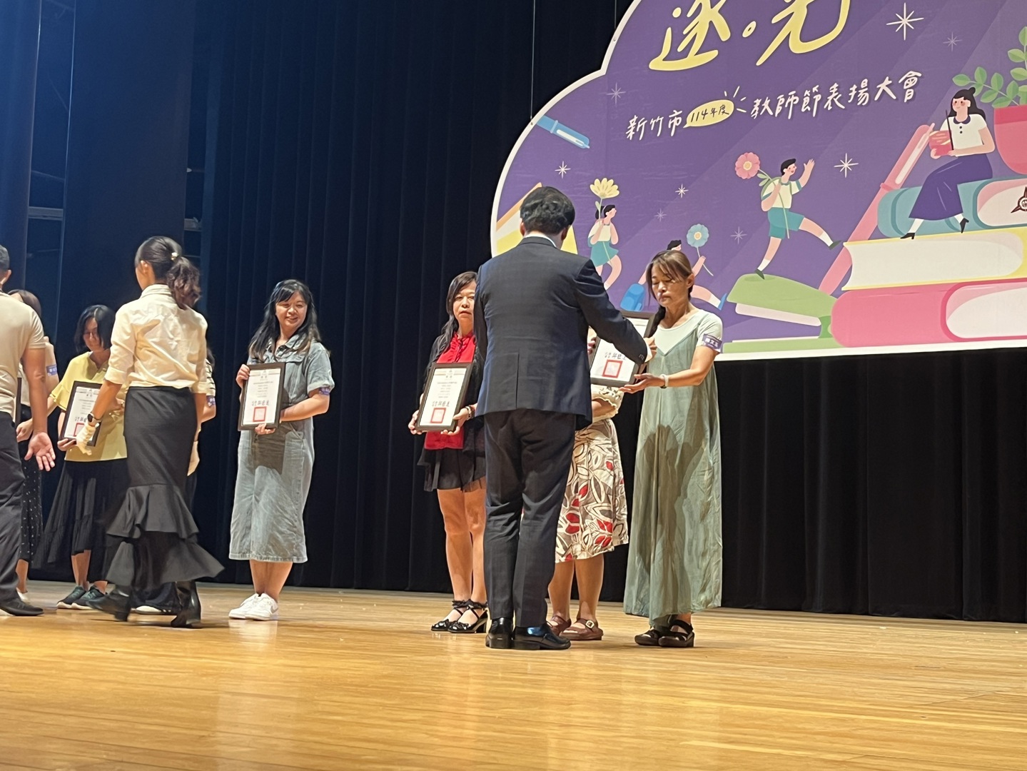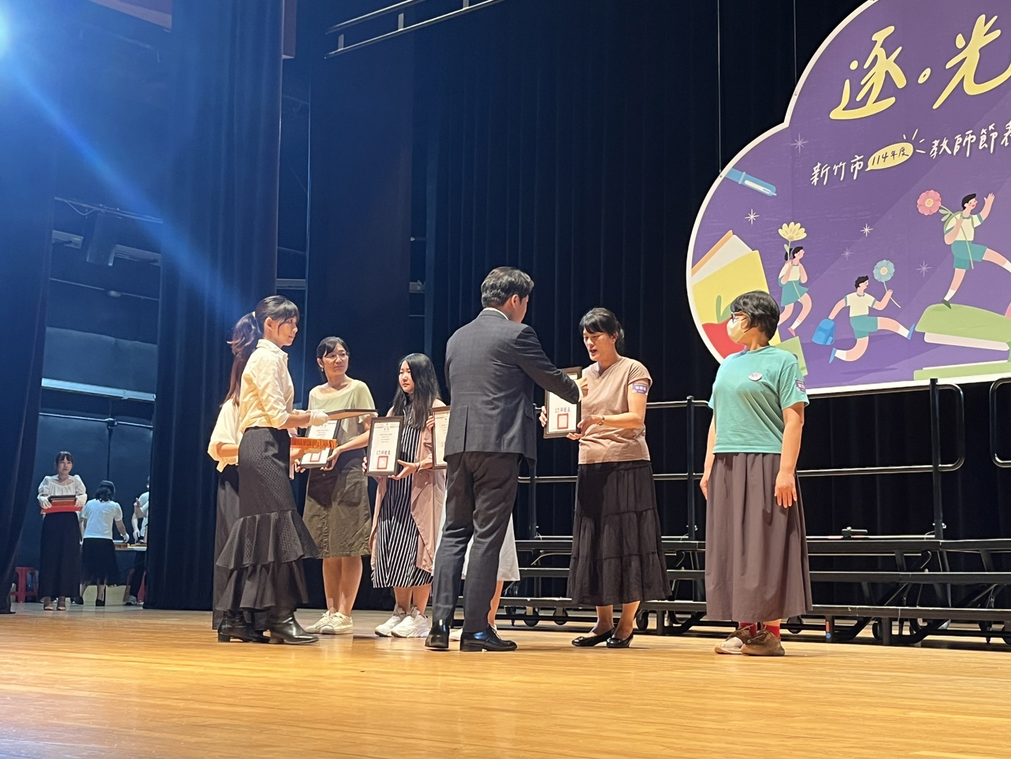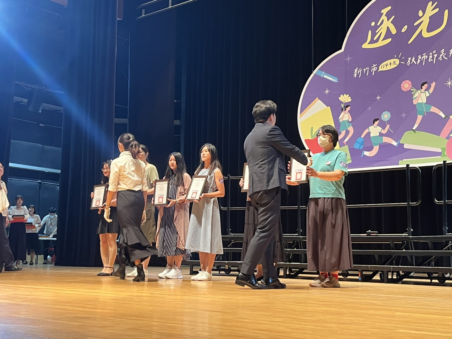 高峰校園日誌:新竹市政府昨(24)日在新竹市文化局演藝廳舉行「114年度新竹市教師節表揚大會」,此次教師節表揚活動搭配逐光這個主題,「光」代表著希望、真理、知識,老師這個角色的任務就是陪伴與指導所有學生追逐這道光,本校特殊優良教師陳文玉、資深優良教師:鮑盈方(20年)、林郁庭(10年)、沈芝誼(10年),以上四位老師今年也接受市府表揚,除了以上四位教師,高峰團隊所有老師也盡心盡力陪伴所有高峰囡仔追逐人生希望的光,期盼所有孩子在未來的道路上都可以順利前行!