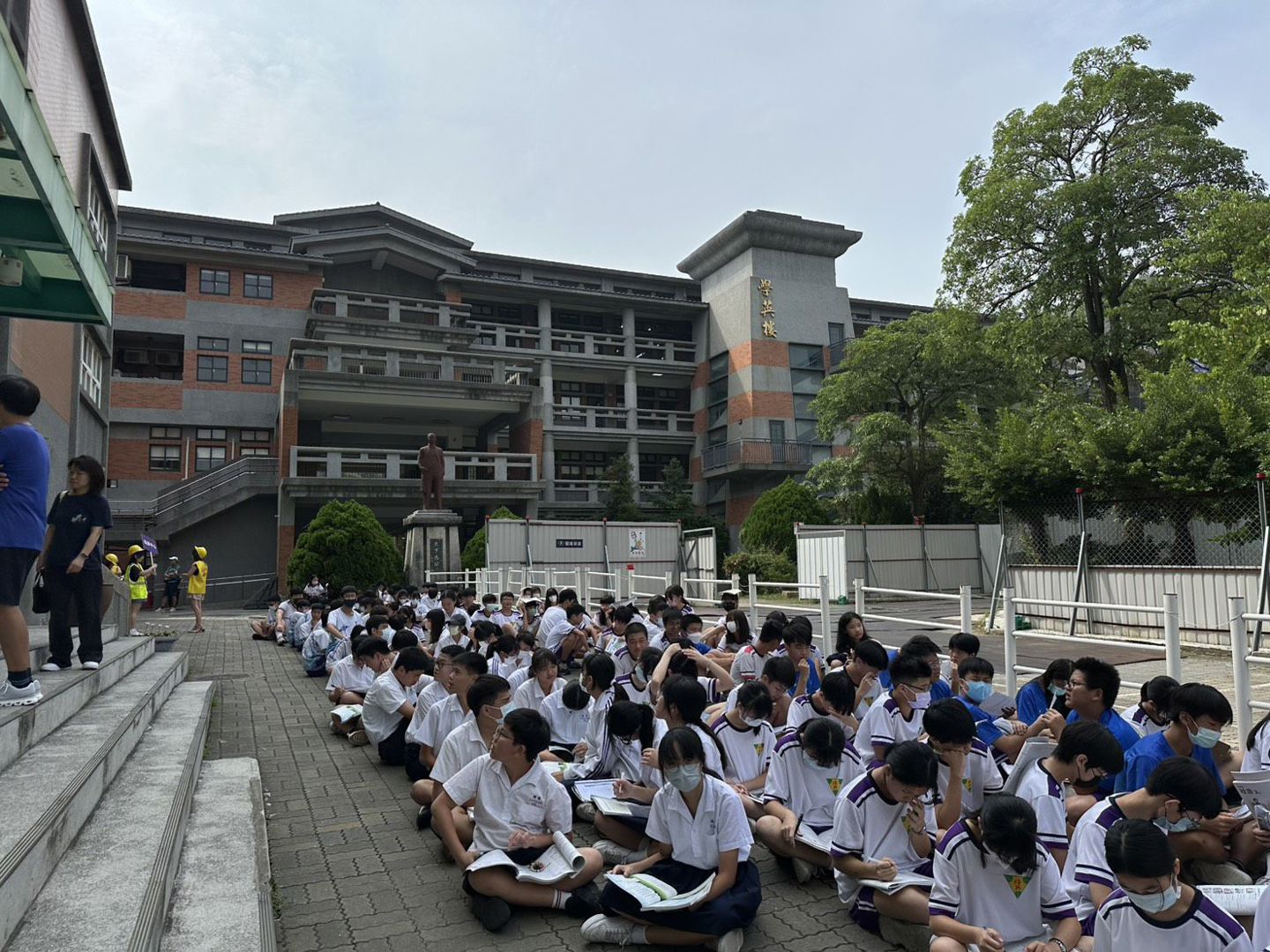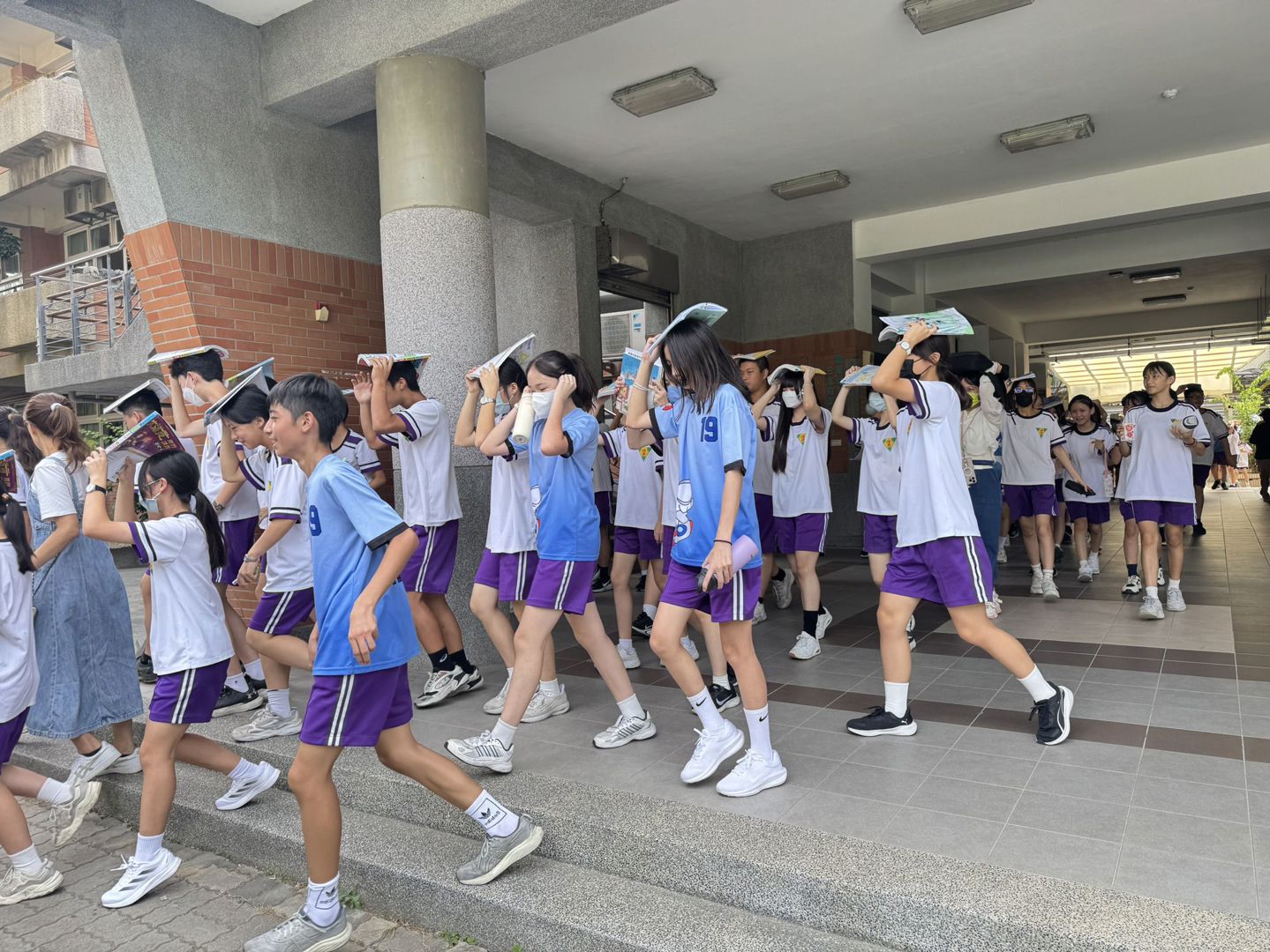演練當天上午 9 時 21 分,全校師生依照地震警報聲立即實施「趴下、掩護、穩住」動作,並迅速就近尋找安全遮蔽物。隨後在導師與防災人員引導下,學生有秩序地以書本或文件遮護頭部,沿著規劃路線疏散至校園操場與安全空地,整體過程秩序井然。