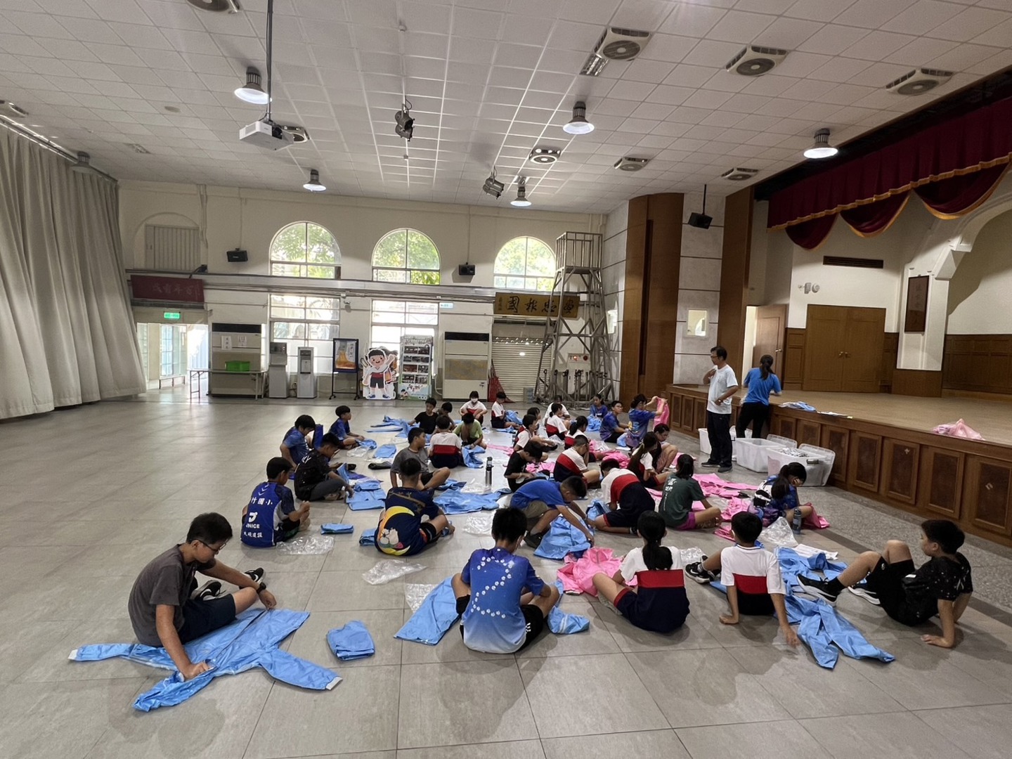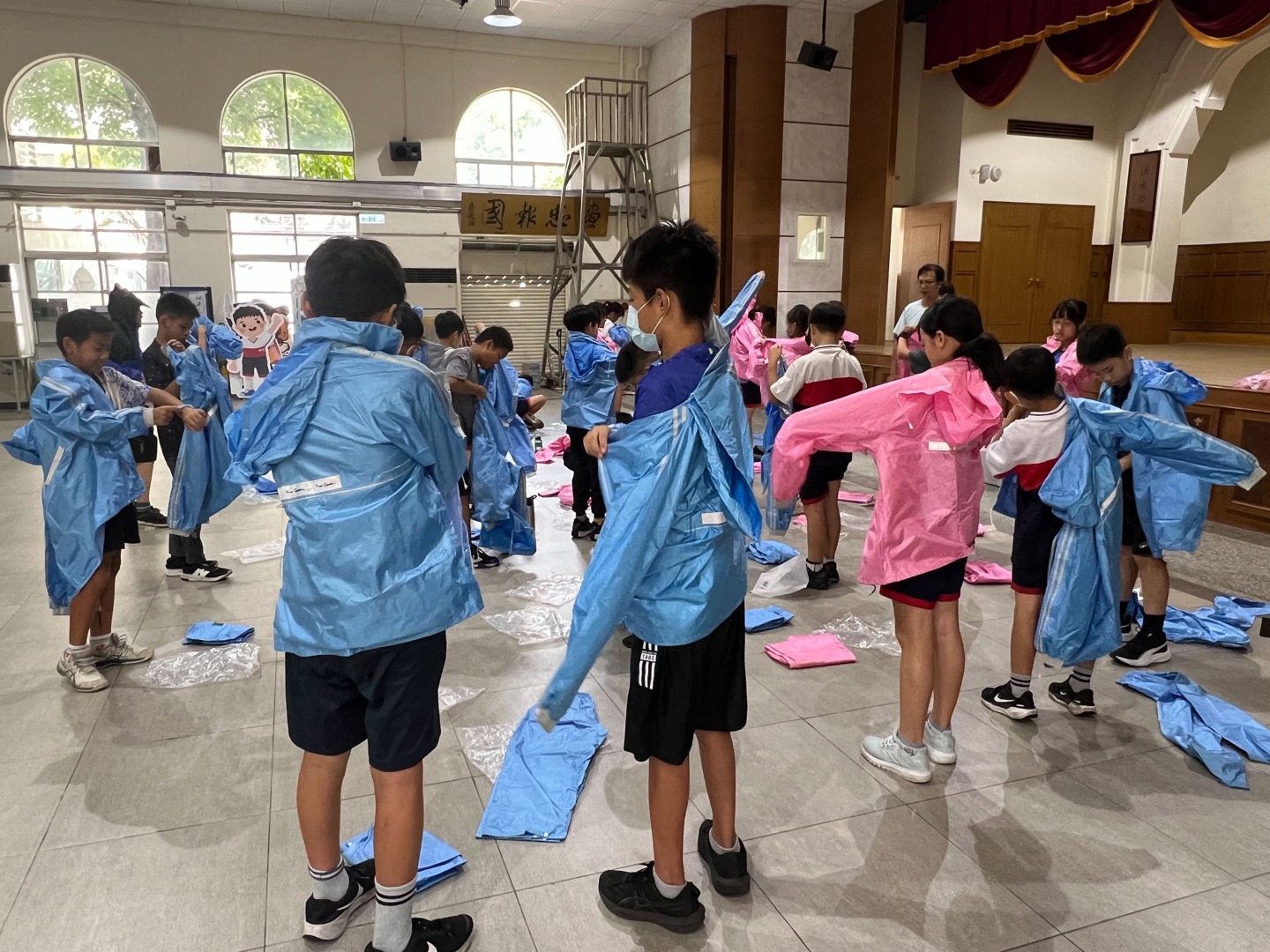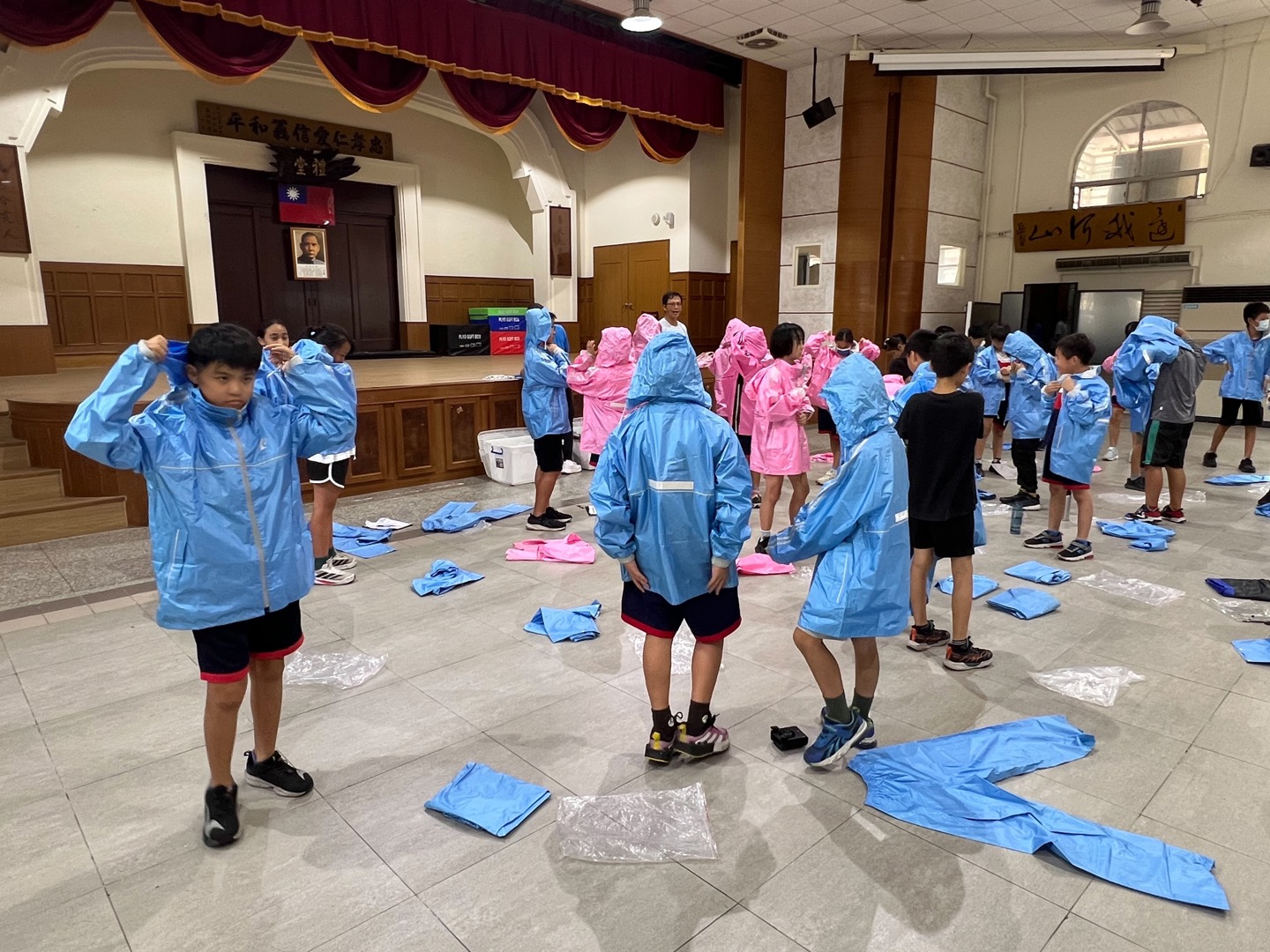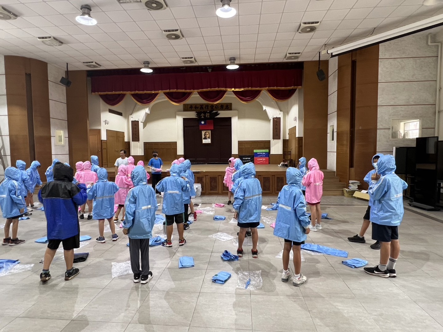 午休在禮堂集合,練習穿兩截式雨衣,合歡山上氣溫變化極大,雨衣不只是為了防雨,更可以防風保暖,所以每位學員都要練習。
