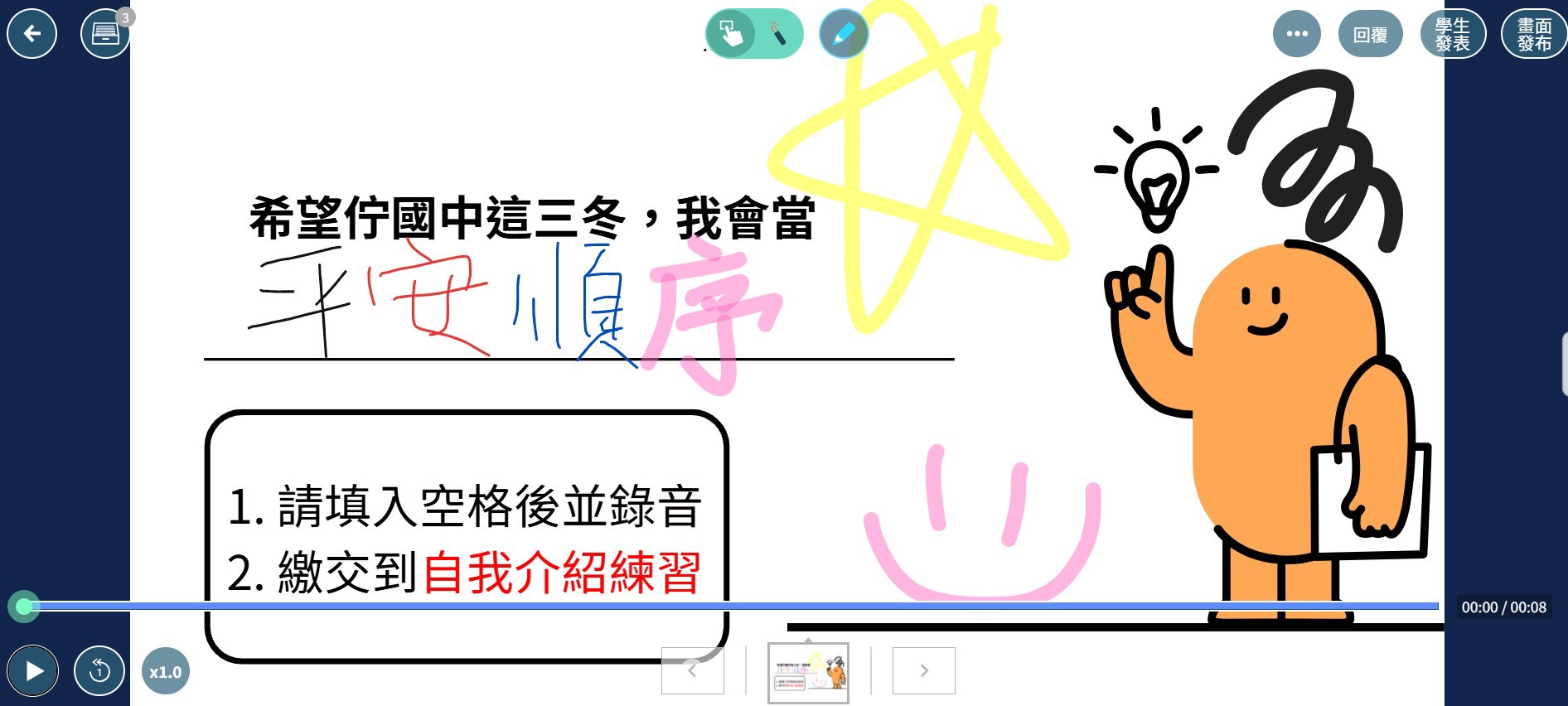 - 錄音訓練 口語自信展現: 課程重點聚焦在口語表達。學生利用系統的錄音功能,將自我介紹內容進行反覆錄音練習。